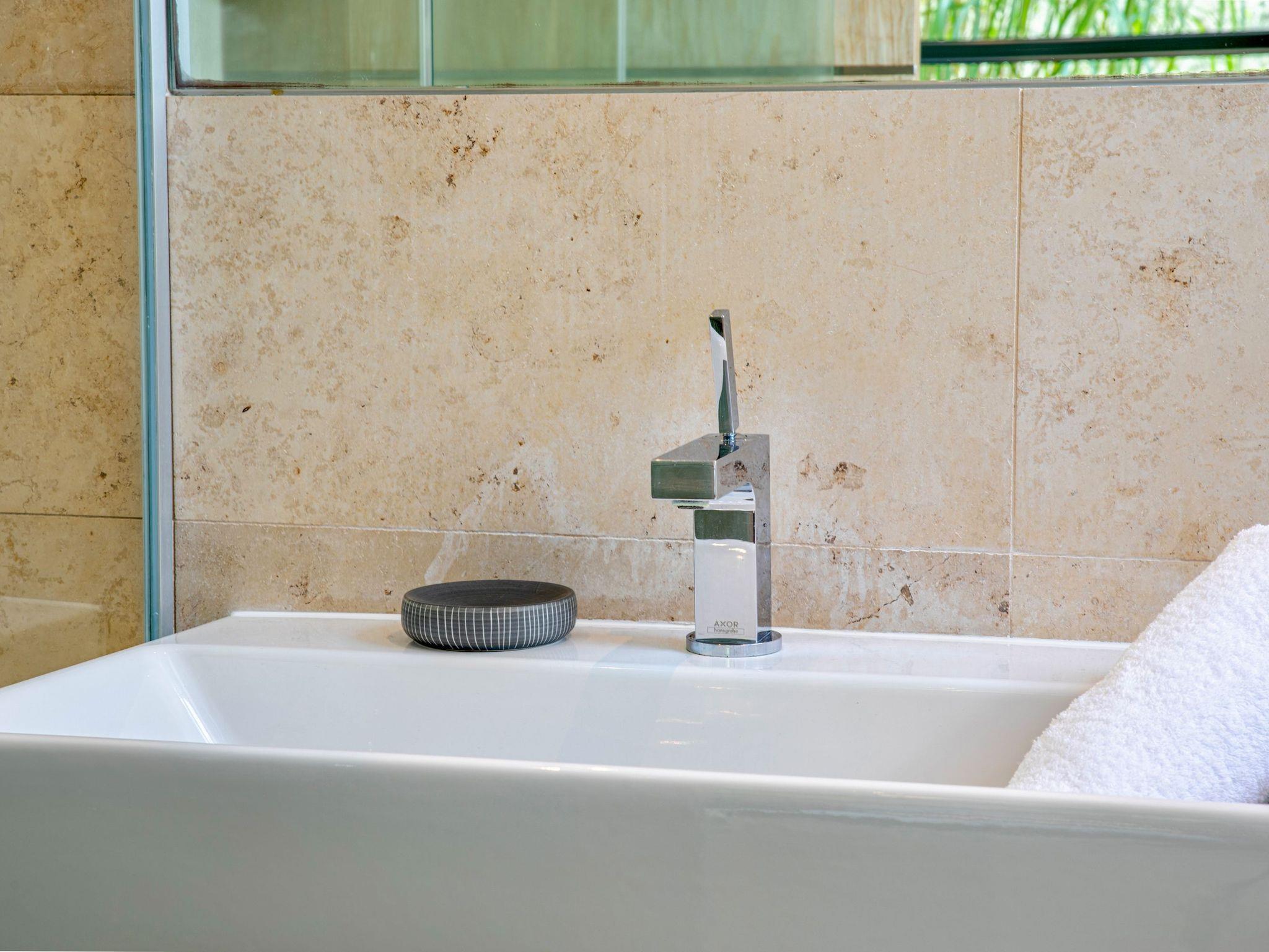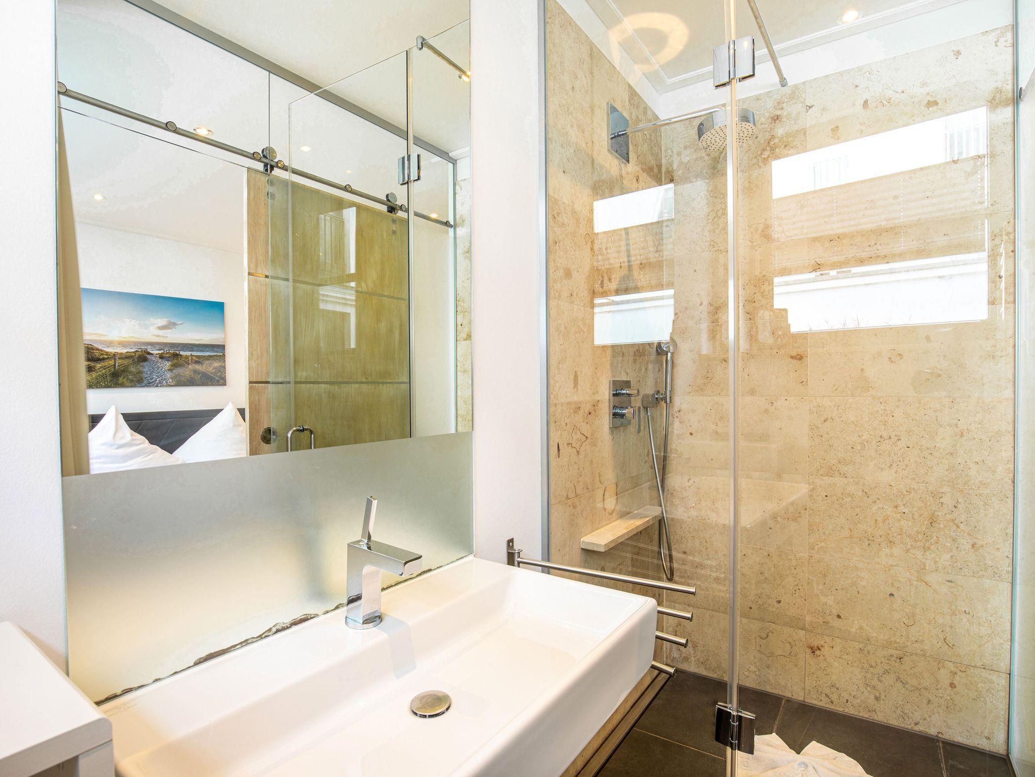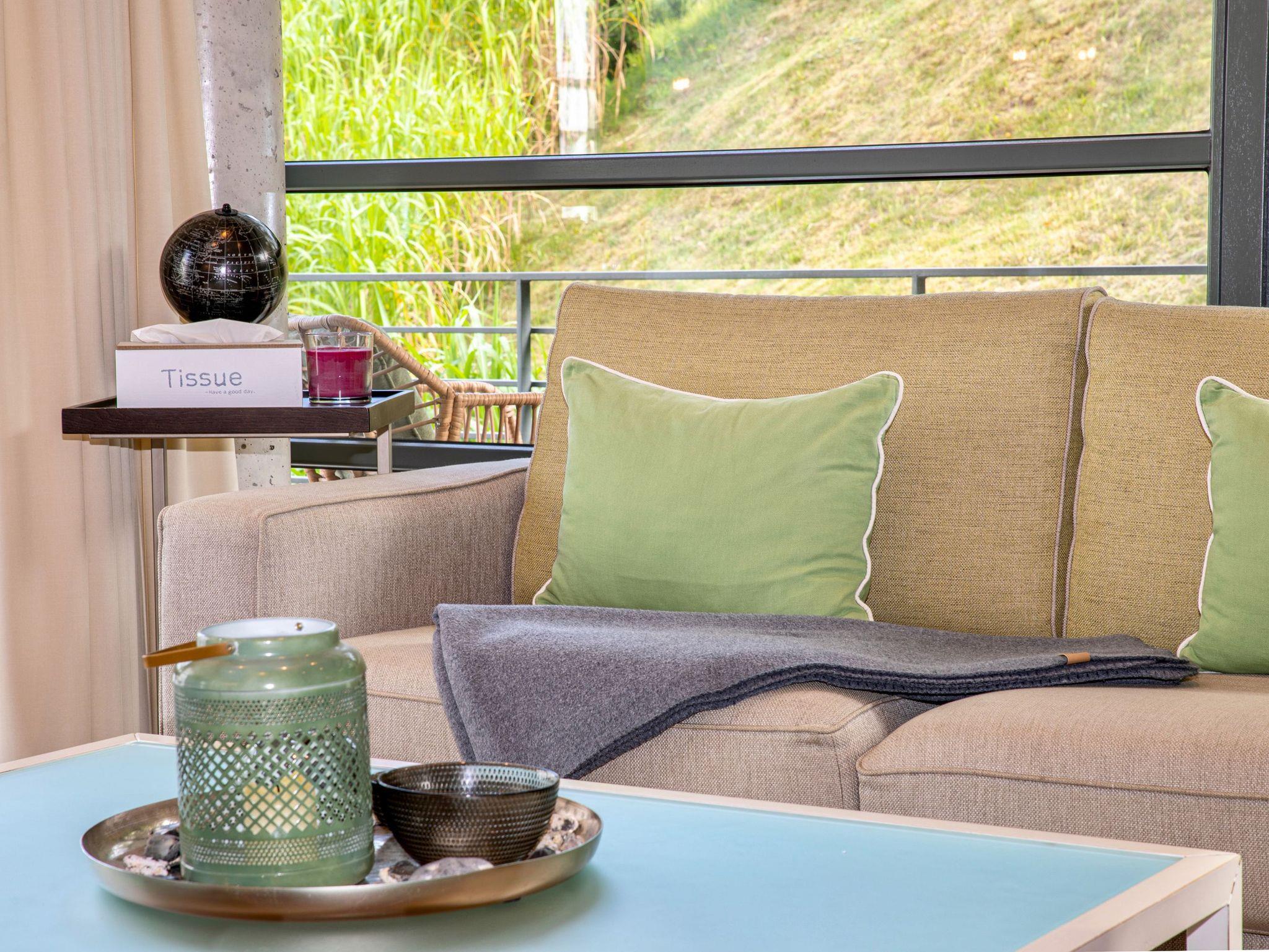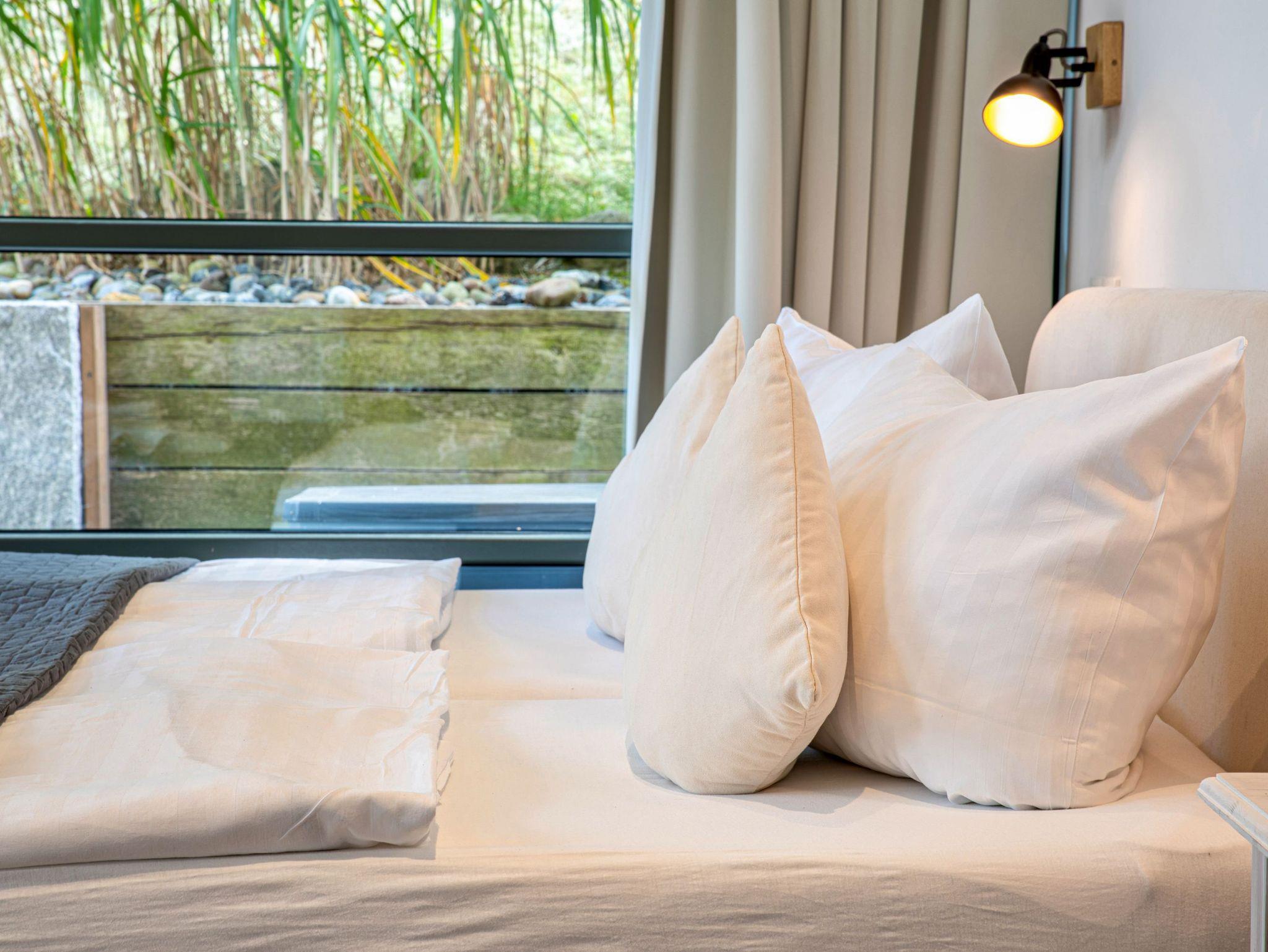 Der großzügige Wohnbereich der Wohnung ist durch viele bodentiefe Fenster lichtdurchflutet. Das besondere Highlight dieser Ferienwohnung ist die Möglichkeit, sowohl von der Terrasse als auch dem großen Balkon im Obergeschoss die herrliche Ruhe und den Blick in den eigens angelegten Garten des Hauses zu genießen. In den Sommermonaten lässt sich außerdem herrlich im Pool entspannen.