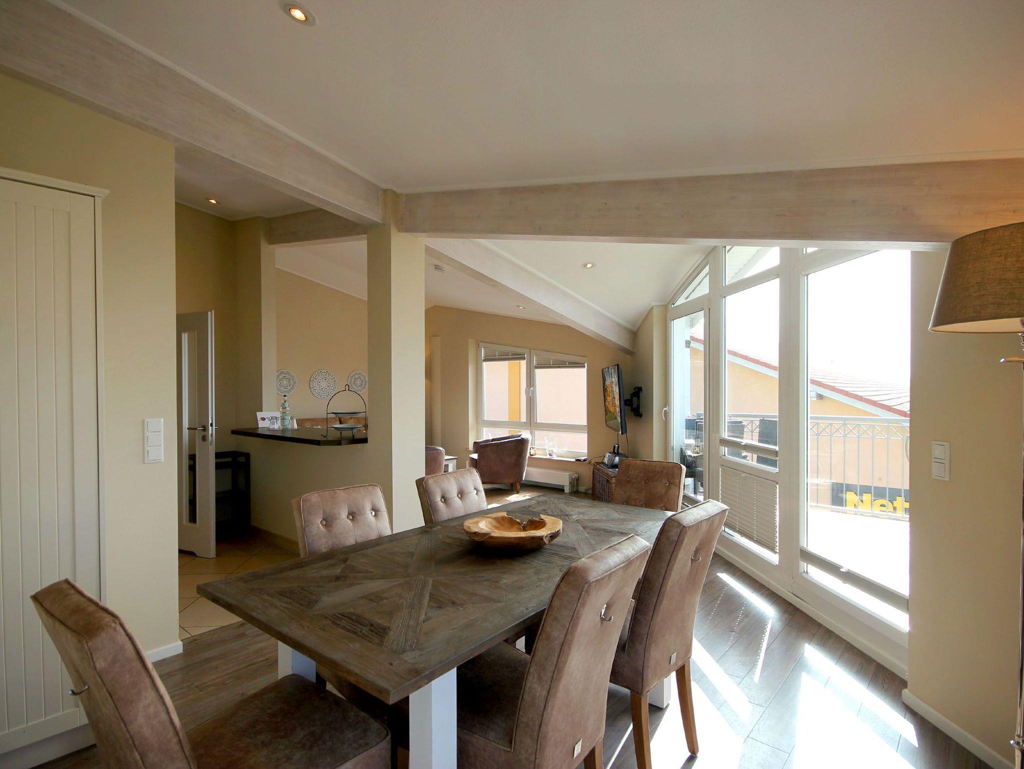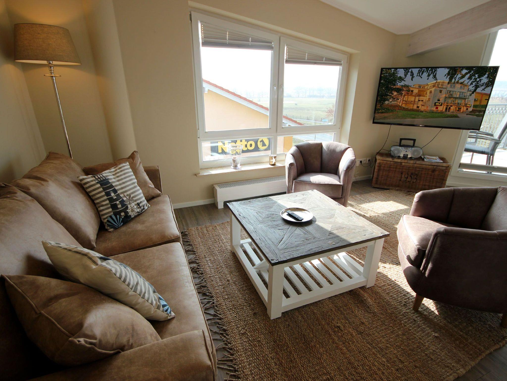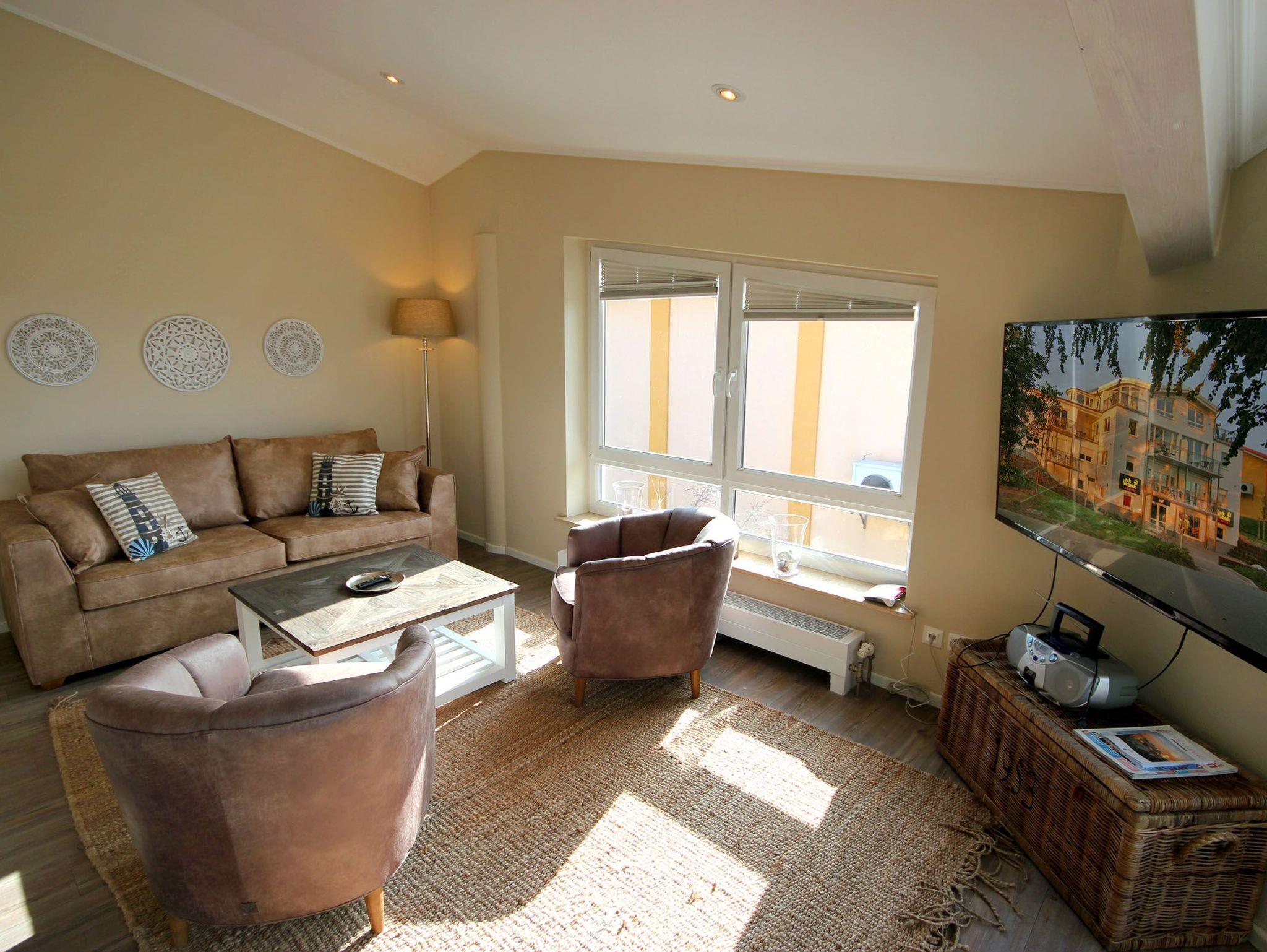 Ihre großzügige 2-Zimmer Penthousewohnung 65RB13 Poseidon befindet sich im 2. Obergeschoss und ist ca. 80 qm groß. Die Nichtraucherwohnung verfügt über zwei Balkone und ist für bis zu 4 Personen gut geeignet. Neben dem gemütlich und geräumigen Wohnbereich mit Zugang zum Balkon mit Blick auf den Selliner See, gehört eine Sitzecke mit Schlaffunktion, ein Essbereich, Flachbild TV sowie WLAN. Im Schlafzimmer erwartet Sie ein Doppelbett, ein zusätzlicher TV, ein Kleiderschrank sowie ein weiterer Balkon in Richtung Osten. Zudem können Sie einen im Wohnbereich integrierten Küchentresen und eine voll ausgestattete Küchenzeile mit Geschirrspüler, Backofen, Wasserkocher, Toaster, Kaffeemaschine sowie umfangreiches Küchengeschirr nutzen. Das moderne Badezimmer erwartet Sie mit Waschtisch, WC und Dusche. Einen Parkplatz sowie eine Fahrradunterstellmöglichkeit befinden sich direkt am Objekt.