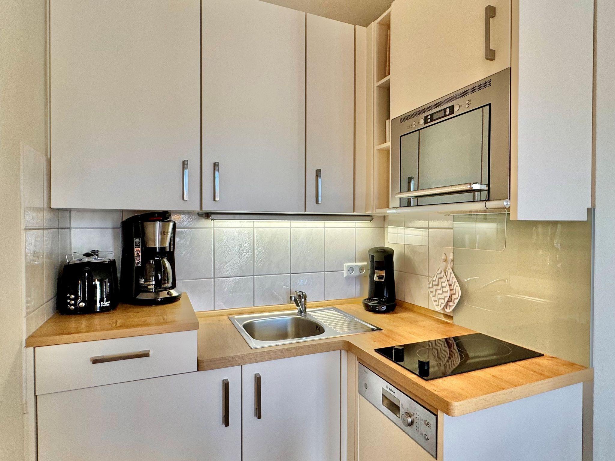 Die Ferienwohnung verfügt über kostenfreies WLAN und die Erstausstattung an Bettwäsche ist inklusive. Das Schlafzimmer mit Verdunklung verfügt über ein Doppelbett, im Wohnzimmer befindet sich zusätzlich eine Doppelschlafcouch. Darüber hinaus verfügt die Ferienwohnung über ein Bad mit Dusche/WC, Föhn sowie einem Kosmetikspiegel. Die voll ausgestattete, offene Küche mit Geschirrspüler, Mikrowelle, Kaffeemaschine und Toaster lässt keine Wünsche offen. Ein Fernseher inkl. 3 Sky-Sender rundet die hochwertige Einrichtung ab. Nach einem erlebnisreichen Urlaubstag können Sie auf dem Balkon in Nordostlage Platz nehmen. Der Ausblick und die Sitzgruppe sorgen hier für ein wunderbares Urlaubsgefühl. Im Nichtraucher-Apartment sind Haustiere nicht gestattet.