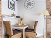 • komplett eingerichtete Miniküche mit Mikrowelle und Essplatz