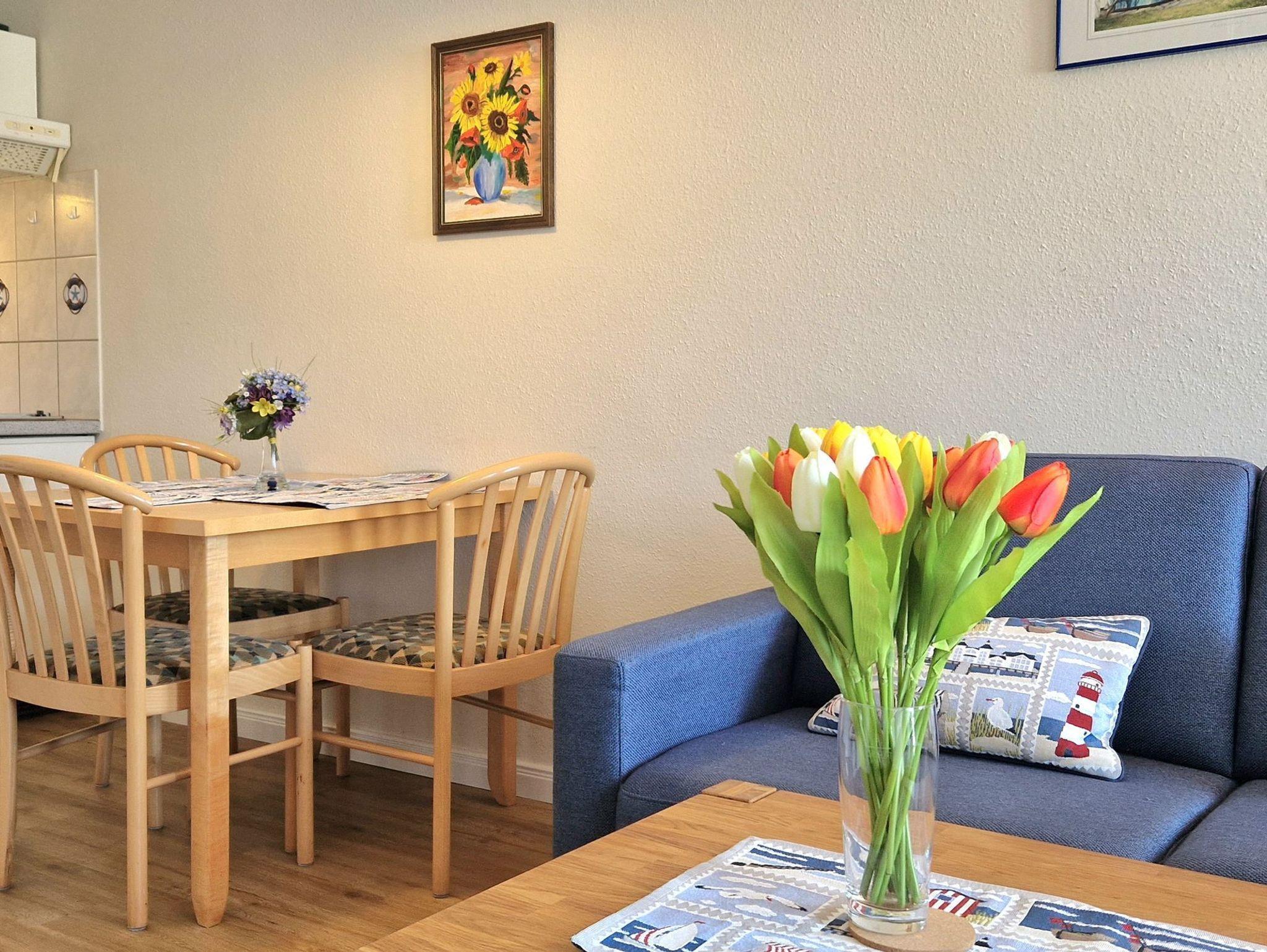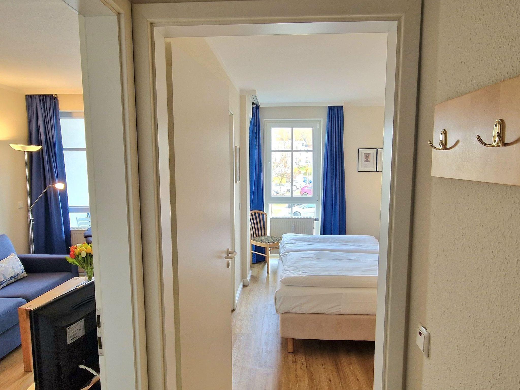 Die Wohnung ist mit kostenfreiem WLAN ausgestattet und die Erstausstattung an Bettwäsche ist im Preis enthalten. Im Schlafzimmer, das durch Verdunklung für einen erholsamen Schlaf sorgt, steht ein Doppelbett zur Verfügung. Im Wohnzimmer gibt es zudem eine Doppelschlafcouch. Das Badezimmer ist mit Dusche, WC, Föhn und Kosmetikspiegel ausgestattet. Die offene Küche verfügt über eine Mikrowelle, Kaffeemaschine und Toaster. Ein Fernseher mit 3 Sky-Sendern rundet die Ausstattung ab. Auf dem Balkon in Nordostlage können Sie den Ausblick und die Sitzgruppe genießen. Rauchen und Haustiere sind in der Nichtraucherwohnung nicht gestattet.