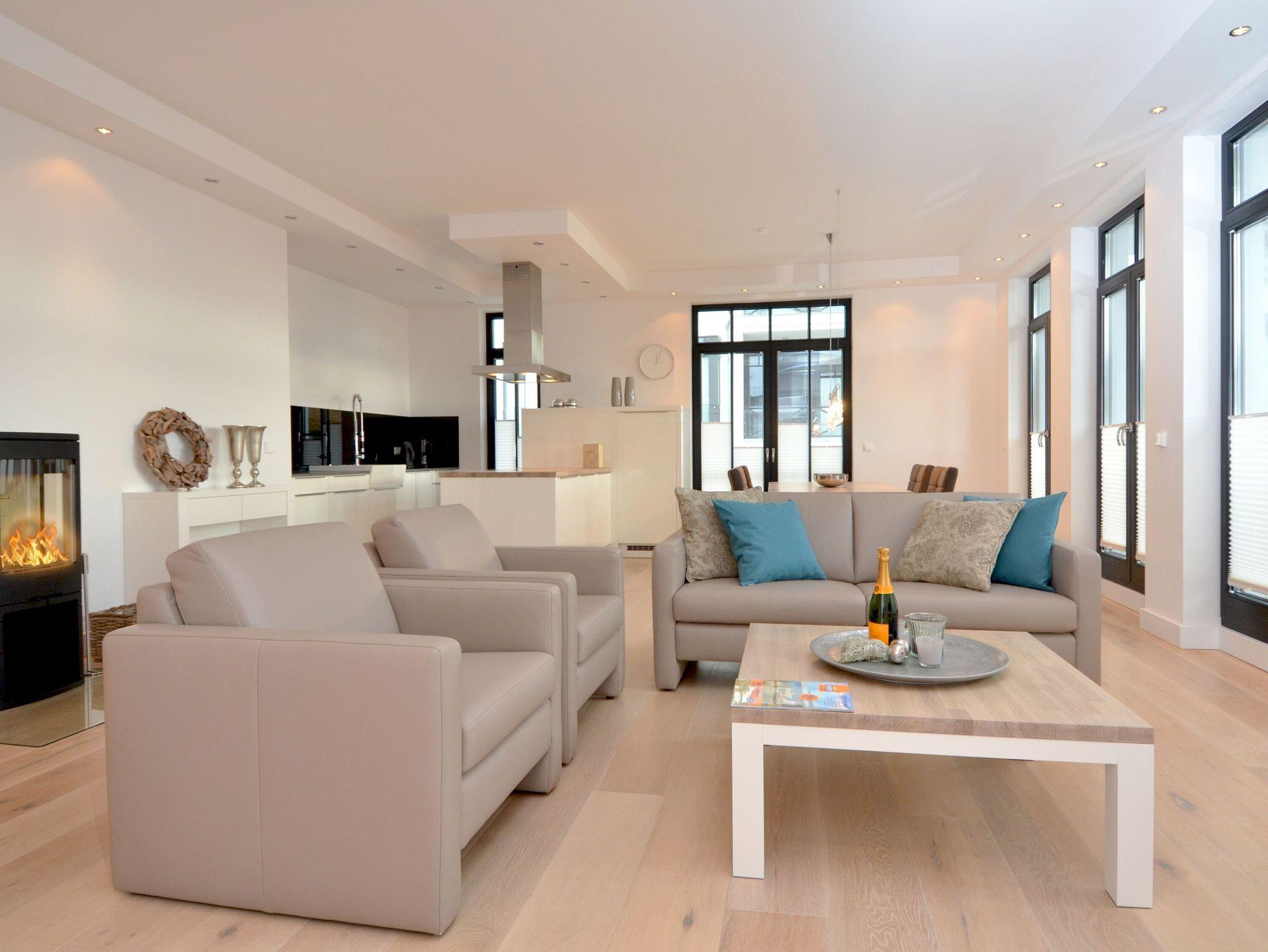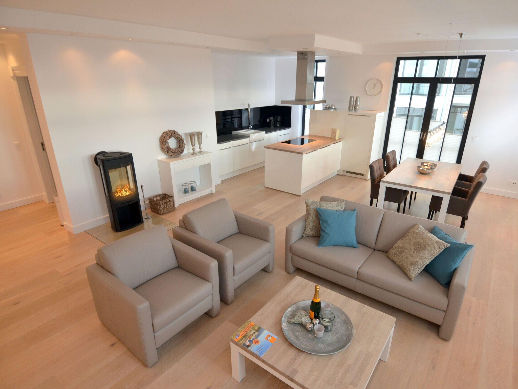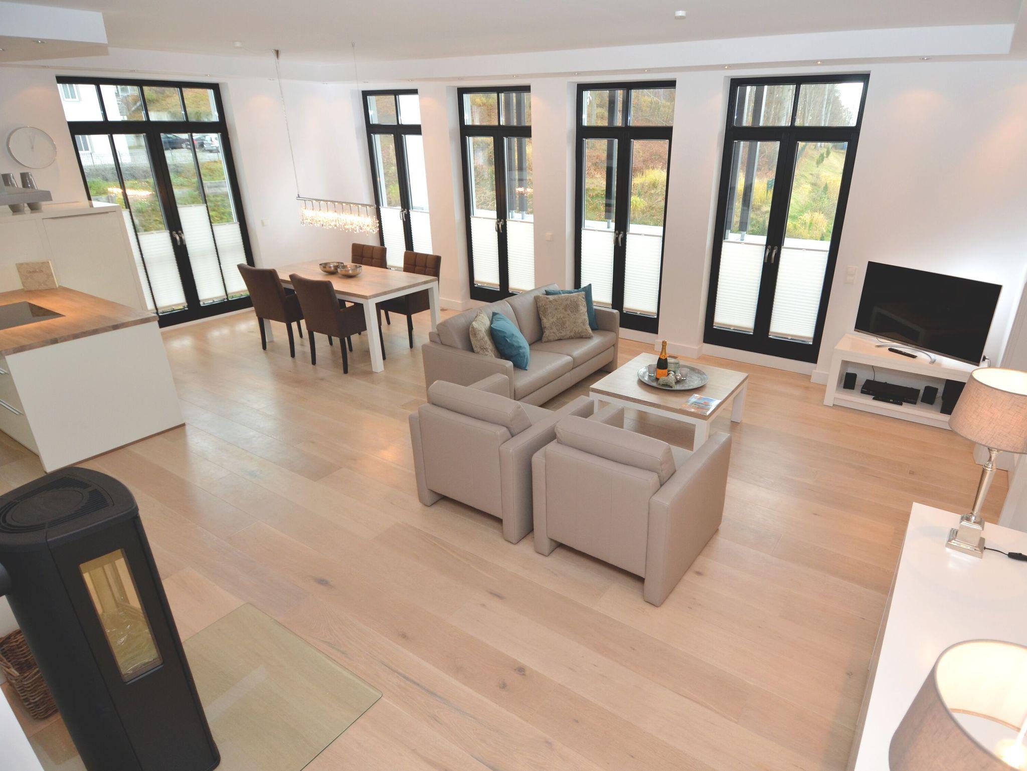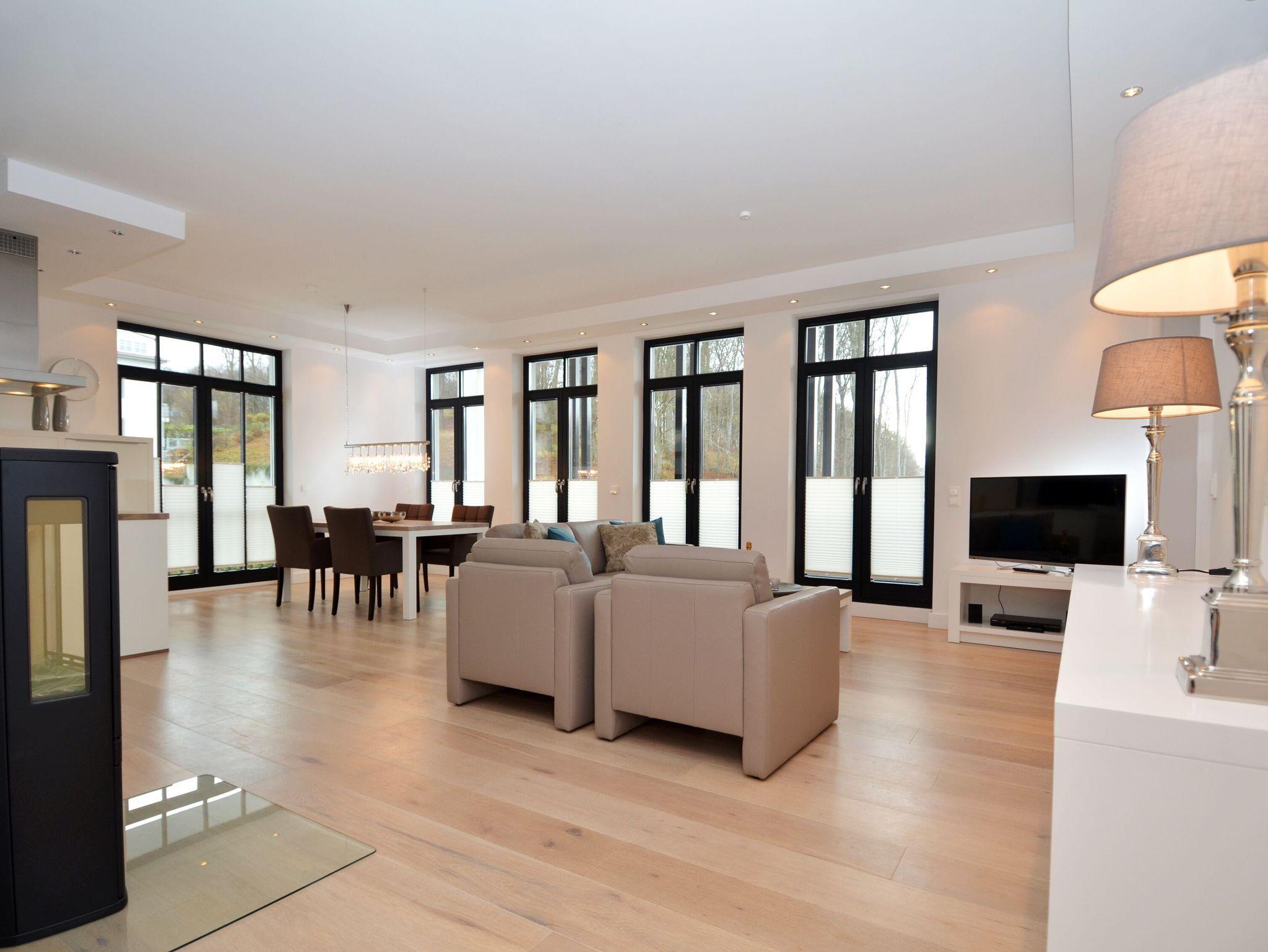 Sie betreten erwartungsvoll den Appartementflur und es eröffnet sich der Blick in einen mit ca. 47 m² mehr als großzügigen und lichtdurchfluteten Wohn- und Essbereich. Natürliche Farbtöne, hochwertige Lederpolstermöbel und das lichte Ambiente schmeicheln dem Auge. Ein großformatiger Flachbild-TV inkl. Radiofunktion sowie ein Bluray-DVD-Player laden zum Ausspannen nach einem erlebnisreichen Tag ein. Das prasselnde Feuer des Kaminofens erzeugt dieses besondere Gefühl der Behaglichkeit, welches nur ein echtes Holzfeuer hervor rufen kann. Der offene Essbereich mit einem großem Esstisch und bequemen Stühlen in Sesseloptik bietet ausreichend Platz für ein gemütliches Zusammensein.