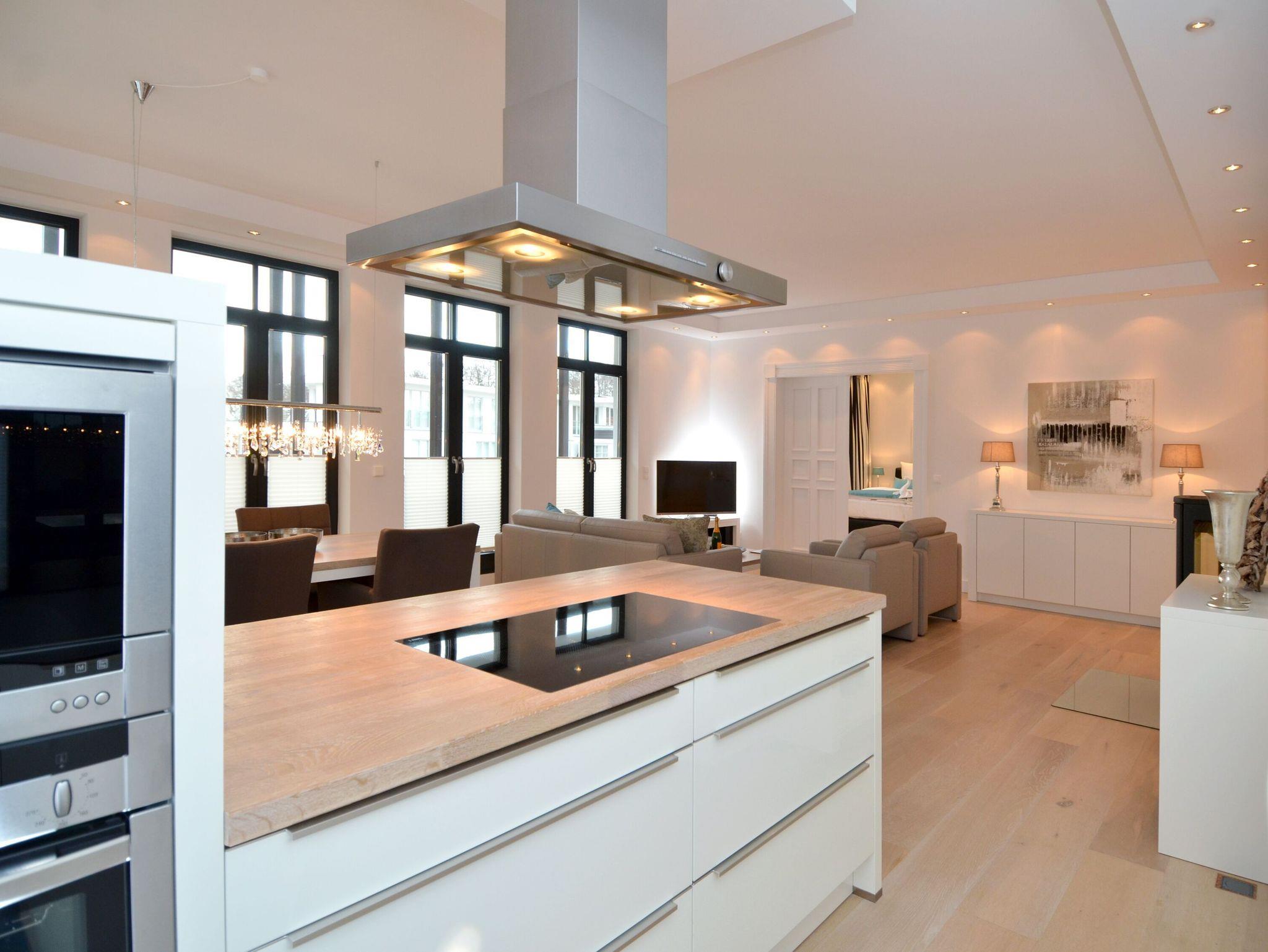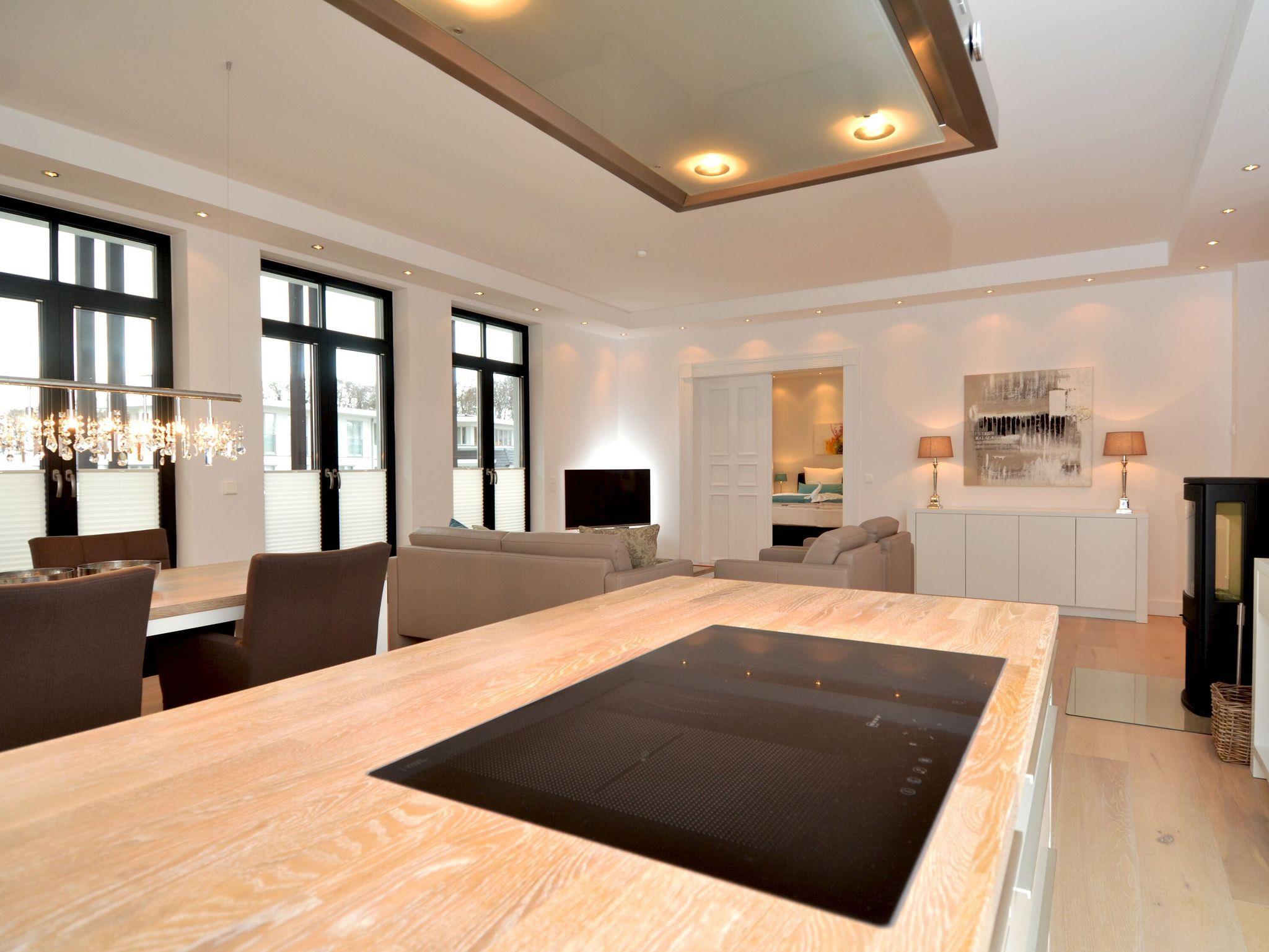 Die zum Ess- und Wohnbereich hin offene Küche bietet viel Arbeitsfläche für den begeisterten Hobbykoch und wurde mit modernen Geräten wie einem Induktionskochfeld, einem Backofen, einer Mikrowelle, einem Geschirrspüler, einem Kühlschrank, einer Kaffeemaschine, einem Toaster, Senseo-Kaffeepadmaschine für Kaffeespezialitäten, einem Wasserkocher, einem Eierkocher, einem Handmixer und diversem Kleininventar ausgestattet.