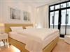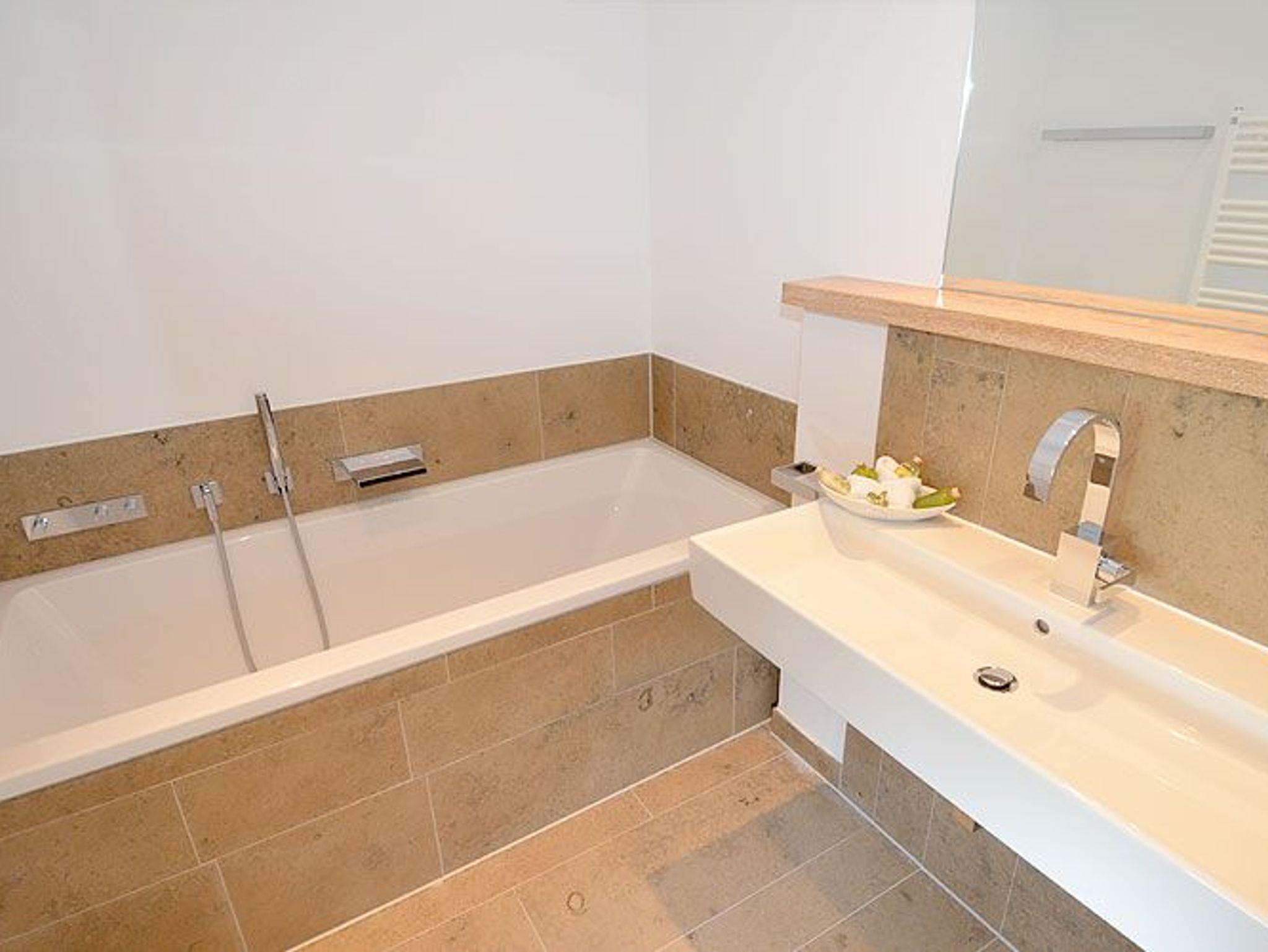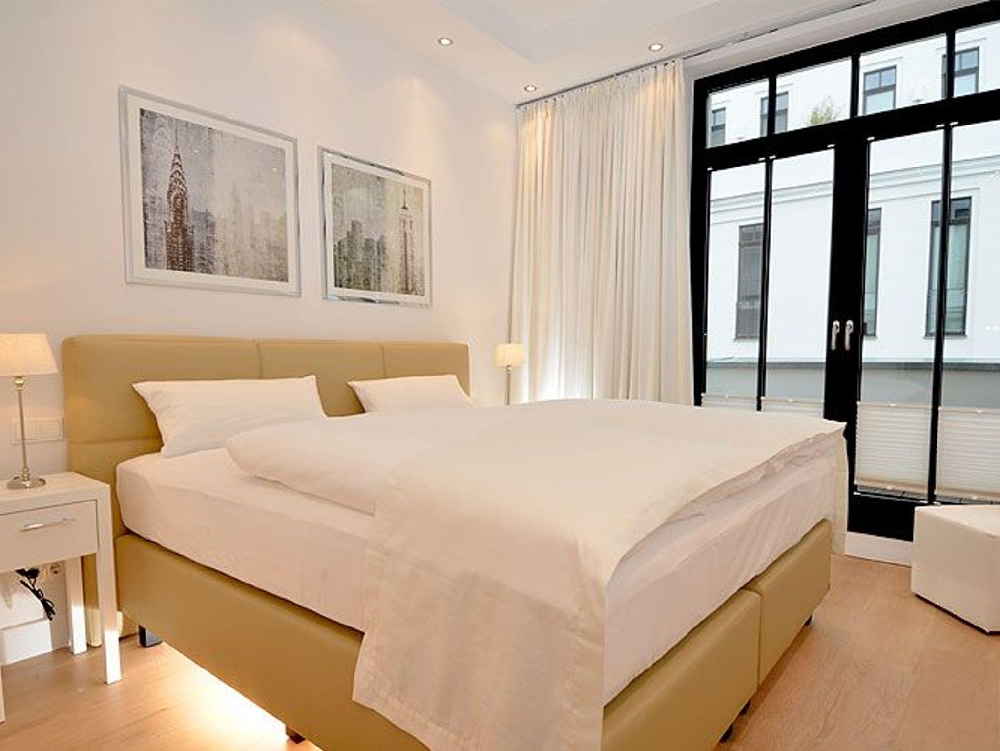 Den Masterbedroom betreten Sie vom Wohnbereich aus durch eine raumhohe Doppeltür. Dieser Raum wurde in einem gekonnten Stilbruch in dominanteren Farben geschmackvoll eingerichtet. In diesem Raum gibt es einen eigenen Flachbild-TV und einen Zugang zum sonnenreichen Südbalkon. Das Ensuite-Badezimmer wurde stilvoll verfliest und verfügt über eine Badewanne, eine bodengleiche Walk-In-Dusche mit Echtglaswand, einem WC und einem XXL-Waschbecken.