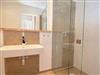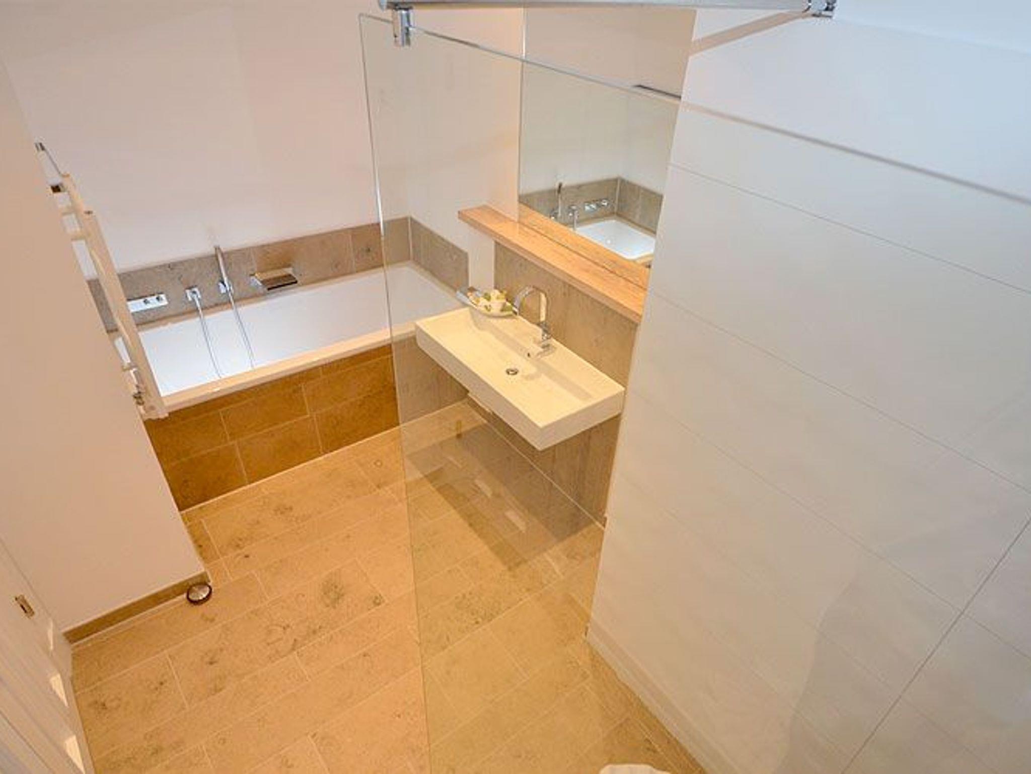 Das weitere Schlafzimmer - hier wurde der beruhigende Farbstil der Wohnlandschaft wieder aufgenommen - erreichen Sie durch den Flur und auch dieser Raum verfügt über einen Zugang - hier auf den seitlichen Balkon mit seinem wunderbaren Ostseeblick. Dieses Ensuite-Bad ist durch eine raumhohe, moderne Holzschiebetür betretbar und verfügt ebenfalls über eine bodengleiche Walk-In-Dusche mit Echtglaswand, ein WC und ein XXL-Waschbecken.