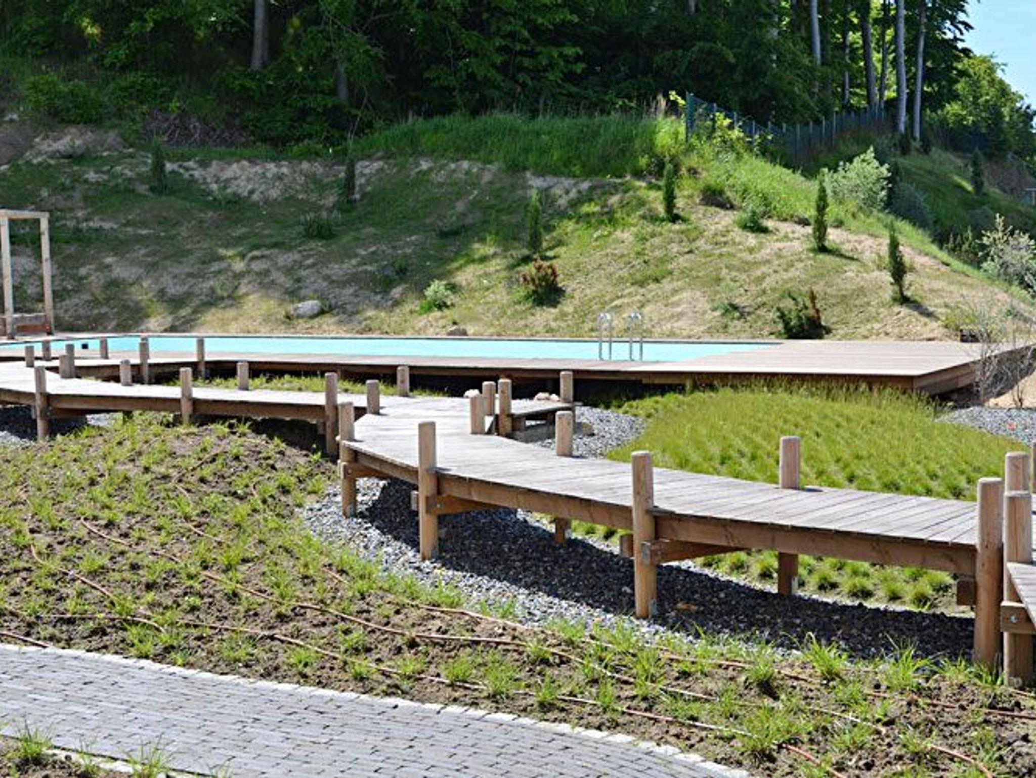 Beide Balkone der Suite können Sie von der Wohnlandschaft aus betreten. Der ca. 12 m² große Balkon zur Südseite eröffnet einen herrlichen Panoramablick zur Gartenseite der Villa und über die anspruchsvoll gestaltete Poollandschaft. Der solarthermie-beheizte Außenpool ist allen Gästen des Villenensembles Philine [&] Claire frei zugänglich zur kostenfreien Nutzung (saisonal). Der zweite Balkon befindet sich seitlich am Haus Richtung Morgen- und Mittagssonne und bietet auf 6m² einen seitlichen Meerblick. Beide Balkone sind mit Sitzgelegenheiten möbliert.