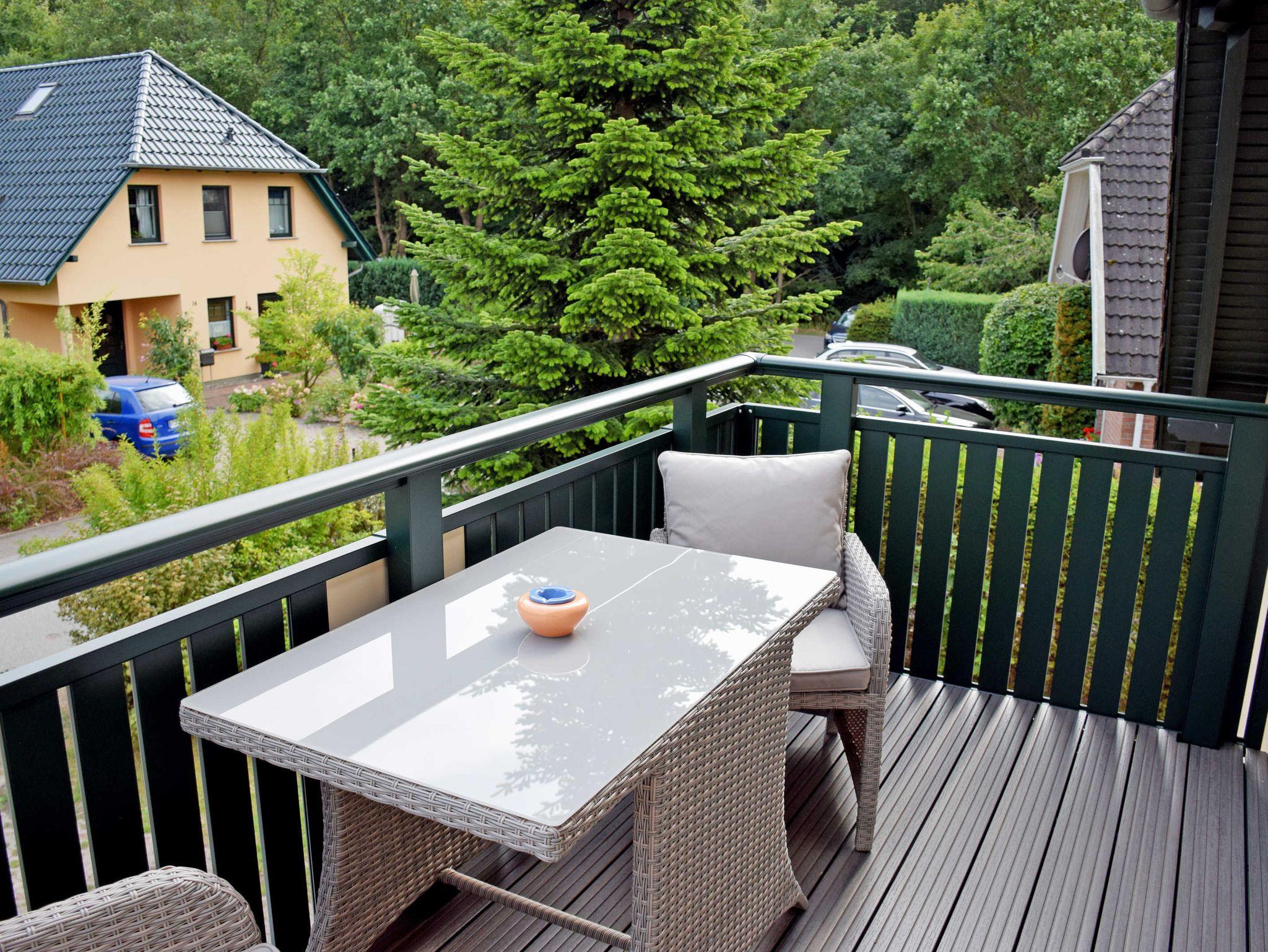 Zu jedem Ferienappartement gehört ein schöner Balkon mit Gartenmöbeln. Im Garten kann eine Liegewiese genutzt werden.