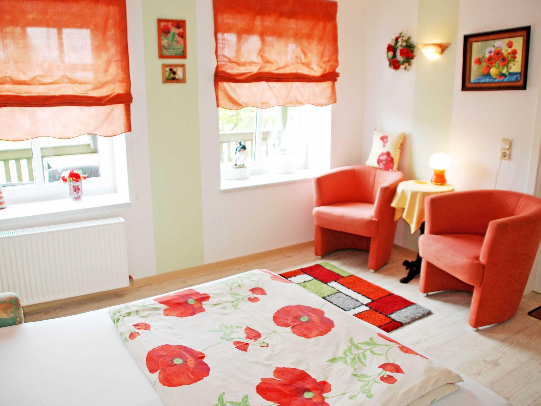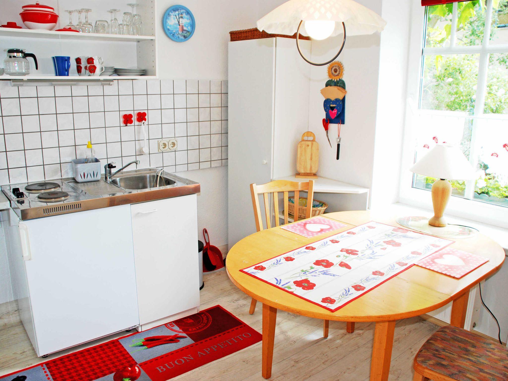 Es verfügt über einen separaten Eingang, der ins Hochparterre des Appartementhauses führt. Ein großer Kaminofen sorgt besonders in der kälteren Jahreszeit nach einem Strandspaziergang für Wärme und Gemütlichkeit. Das modern ausgestatte Appartement bietet einen kombinierten Wohn- und Schlafraum mit Doppelschlafcouch, zwei Sesseln und einem Tisch sowie TV. In der kleinen Küche stehen ein Herd, Kühlschrank, Spüle, Kaffeemaschine, Wasserkocher und ein Esstisch mit Stühlen zur Verfügung. Das Bad verfügt über Dusche, Waschbecken und WC.