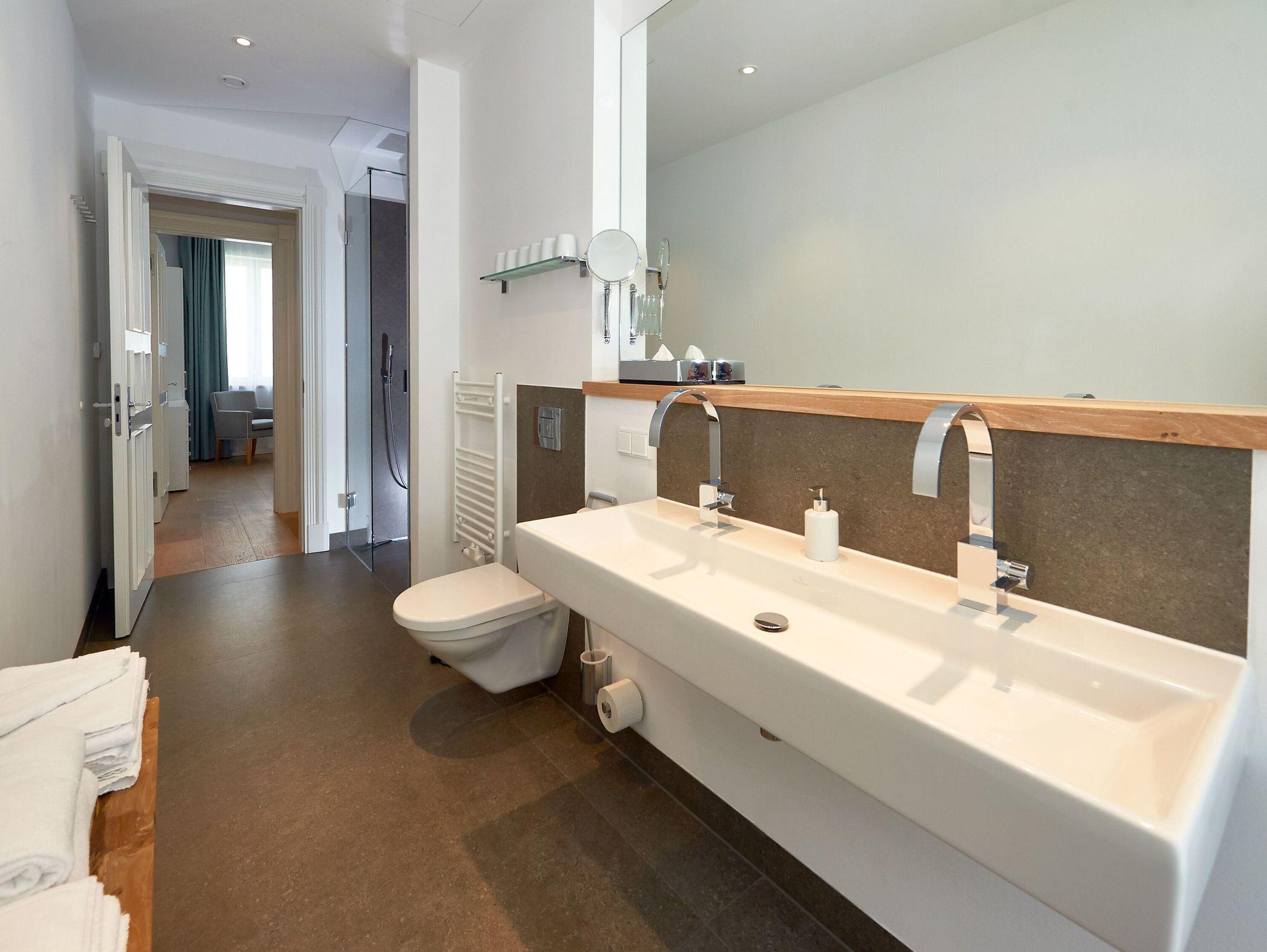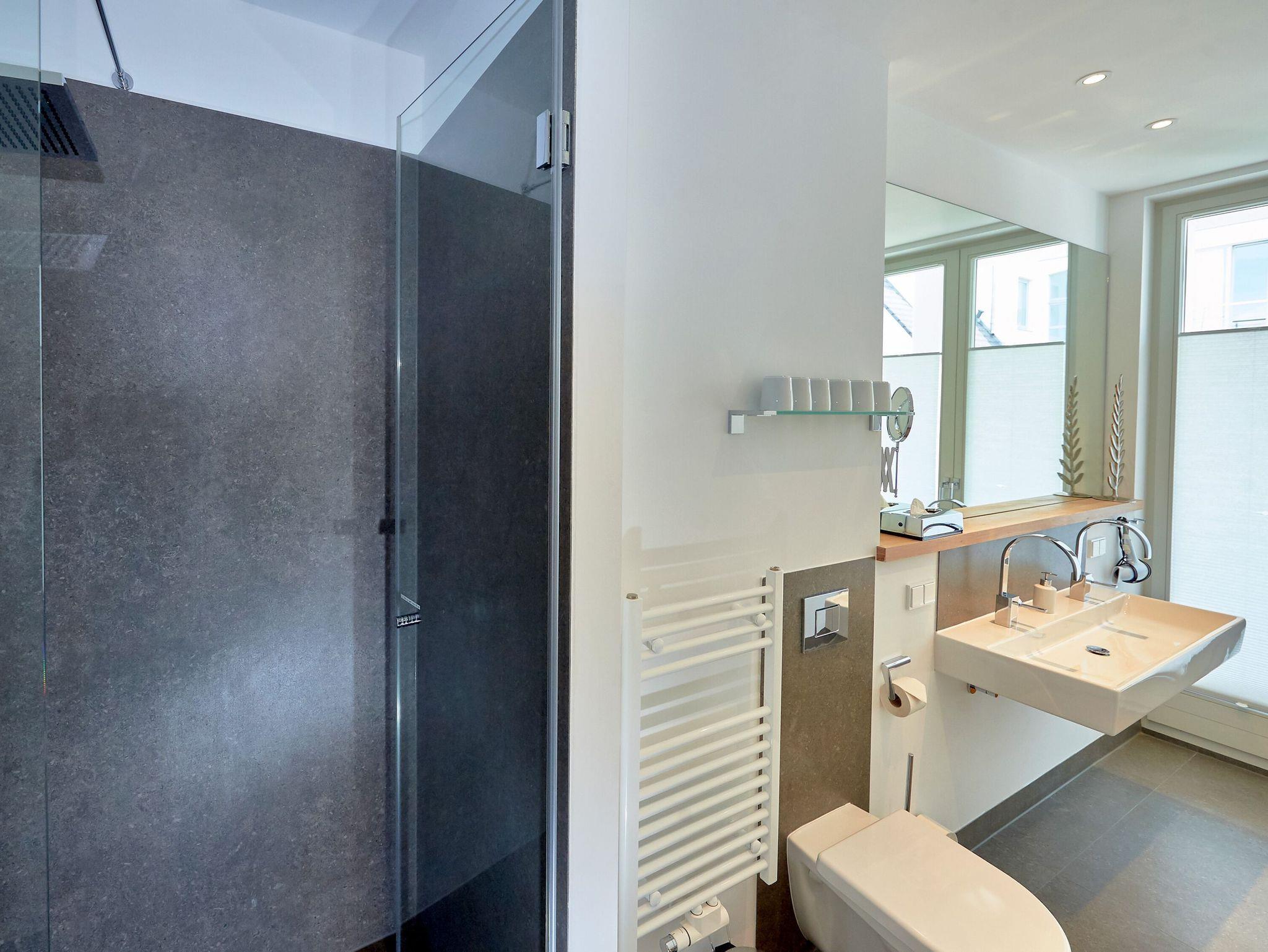 Das geräumige Tageslichtbad überzeugt mit einer bodentiefen Dusche, WC sowie einem Doppelwaschtisch inklusive Kosmetikspiegel und Fön.