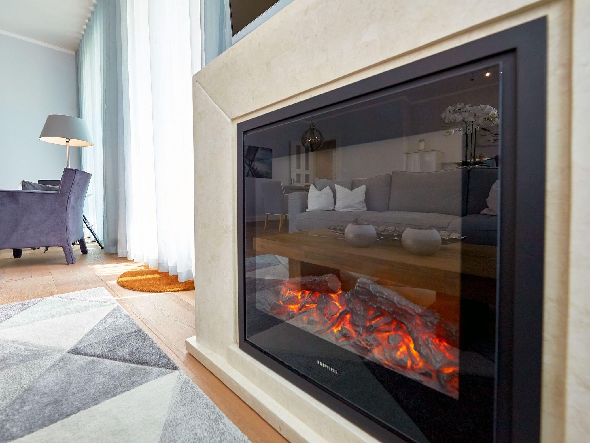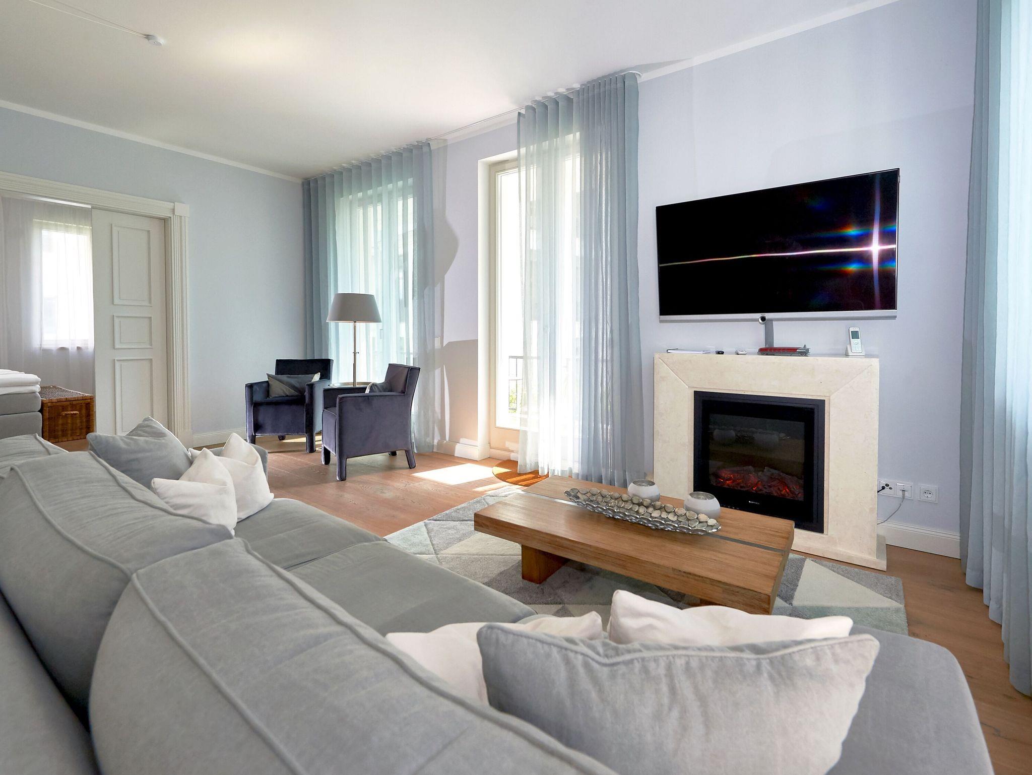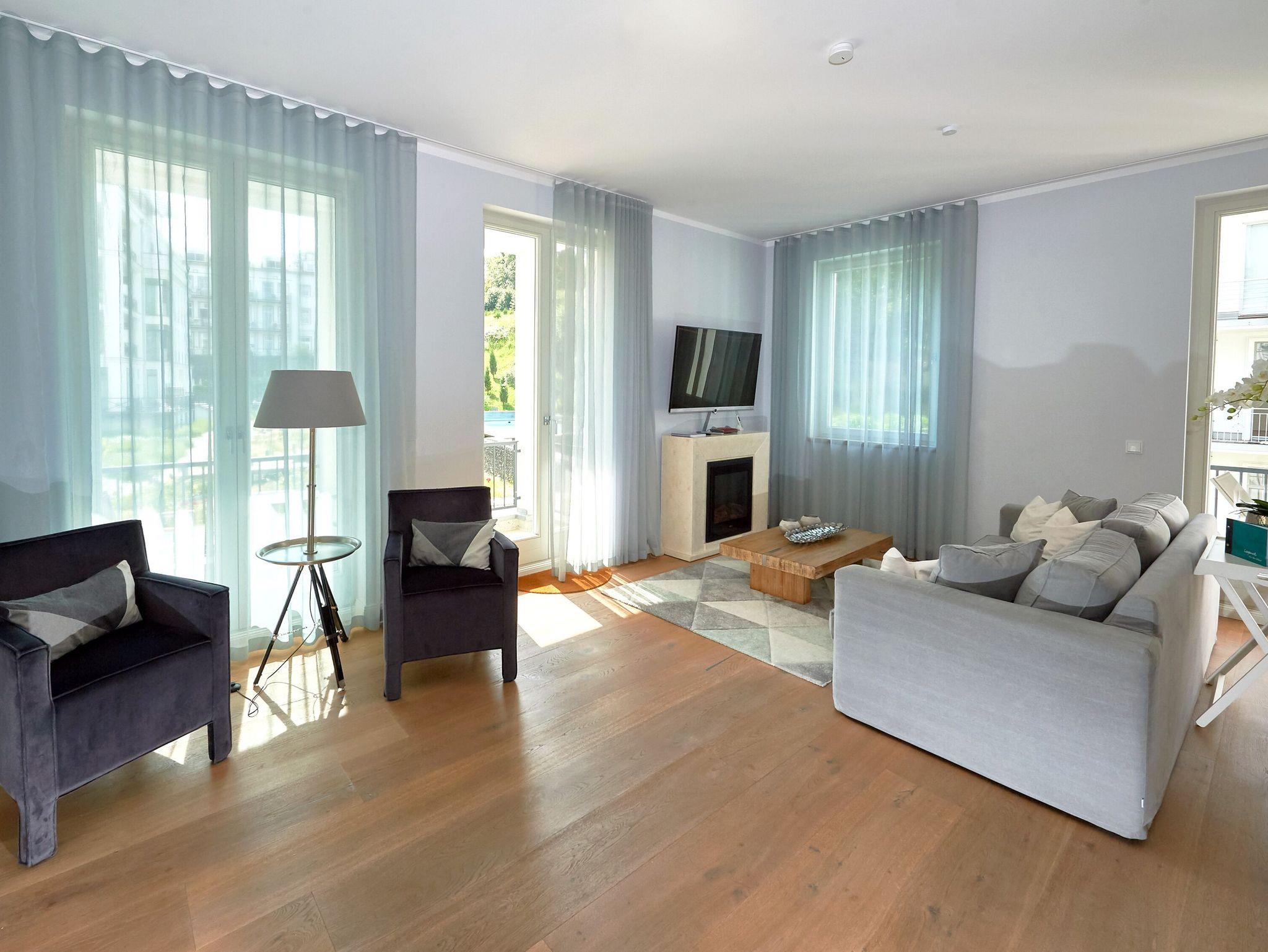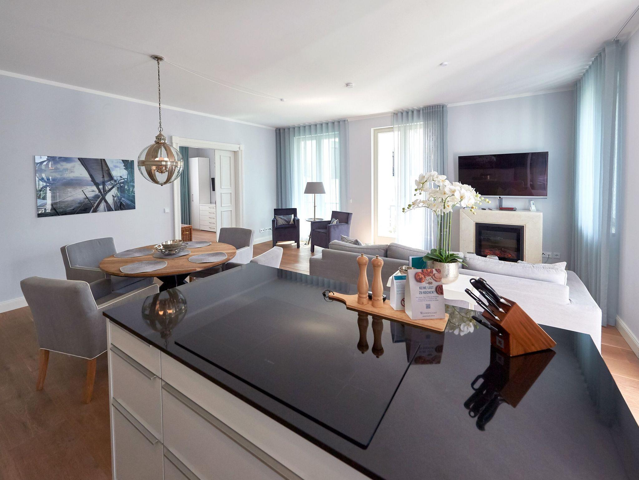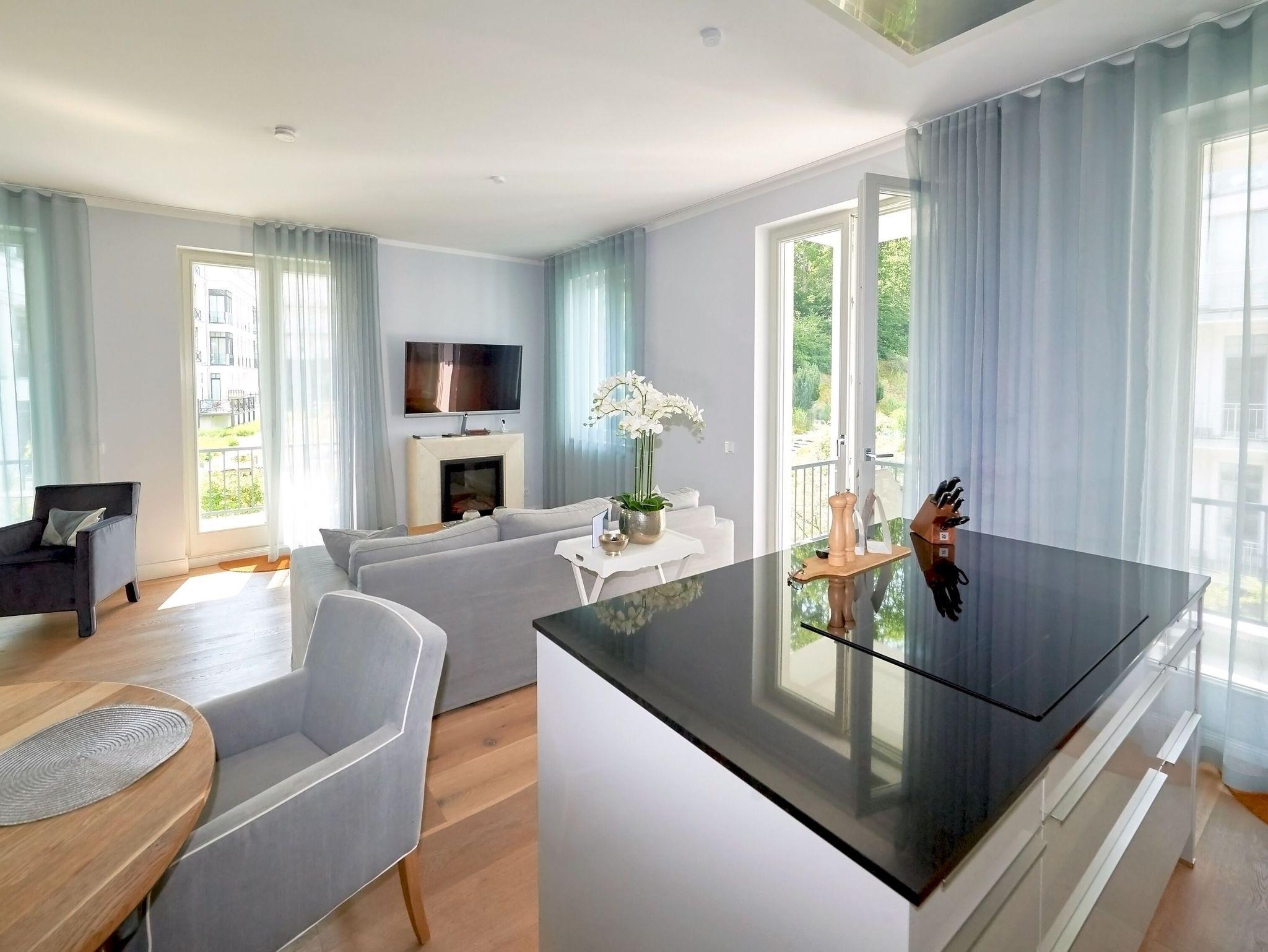 An den geräumigen Flurbereich mit Garderobe und Kleiderschrank grenzen das Wohnzimmer, das Badezimmer und eines der beiden Schlafzimmer an. Wohin man auch schaut, überall sieht und spürt man den erlesenen Geschmack und die Liebe, die die Eigentümer der „Baltic Sea“ in die Einrichtung gelegt haben. Das kombinierte Wohn- und Esszimmer begeistert mit raumhohen Fensterfronten, einer offenen Küche, einem repräsentativen Elektrokamin, einem großen Flachbild-TV sowie eleganten Sitz- und Polstermöbeln. Auf den beiden überdachten Balkonen genießen Sie im Tagesverlauf die Sonne und haben neben einem seitlichen Meerblick auch den Blick auf den Poolbereich auf der windgeschützten Hofseite.