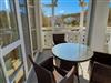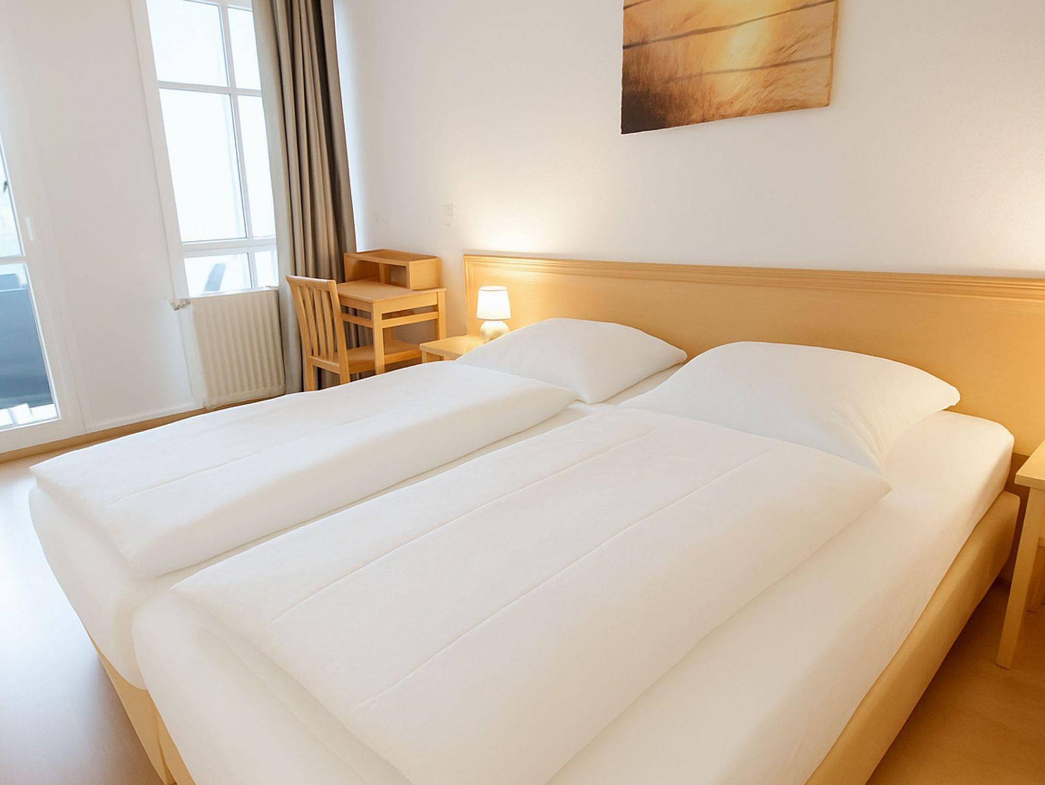 Das geräumige Schlafzimmer ist mit einem Doppelbett, einem Kleiderschrank und einem Schreibtisch für das HomeOffice ausgestattet. Es ist separat vom Flur zugänglich und zusätzlich durch eine Schiebetür vom Wohnraum abtrennbar. Der überdachte Balkon mit moderner Polyrattansitzecke ist sowohl vom Schlafzimmer als auch vom Wohnbereich aus erreichbar.