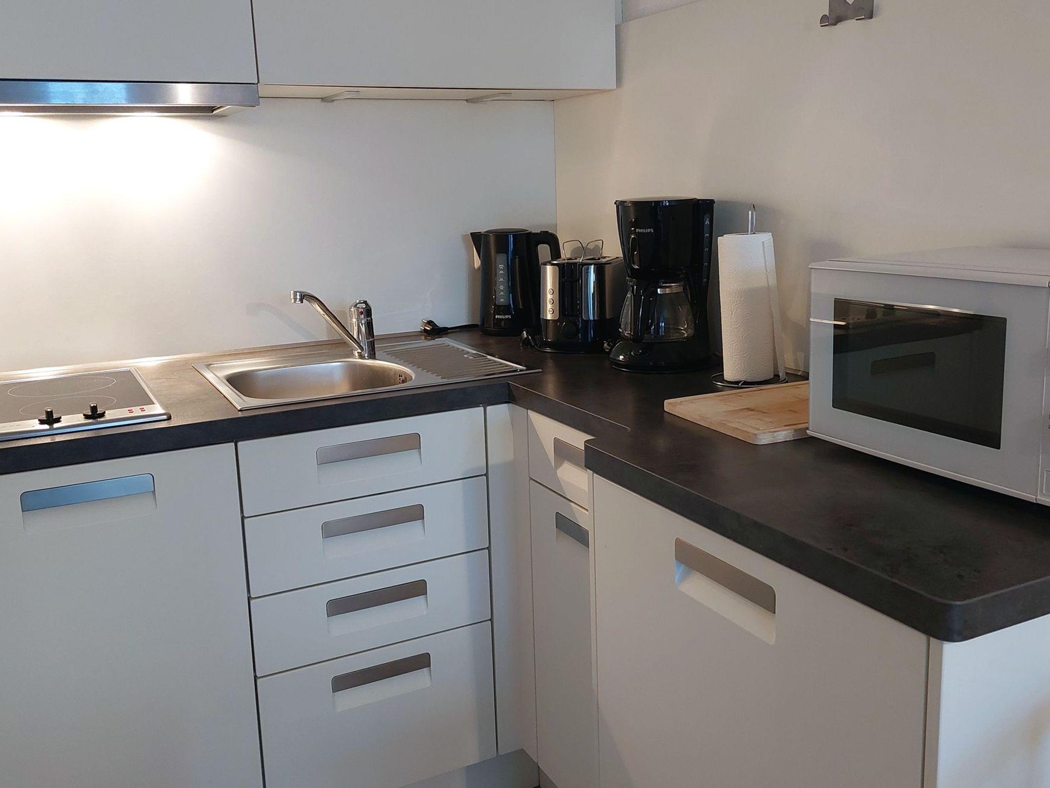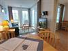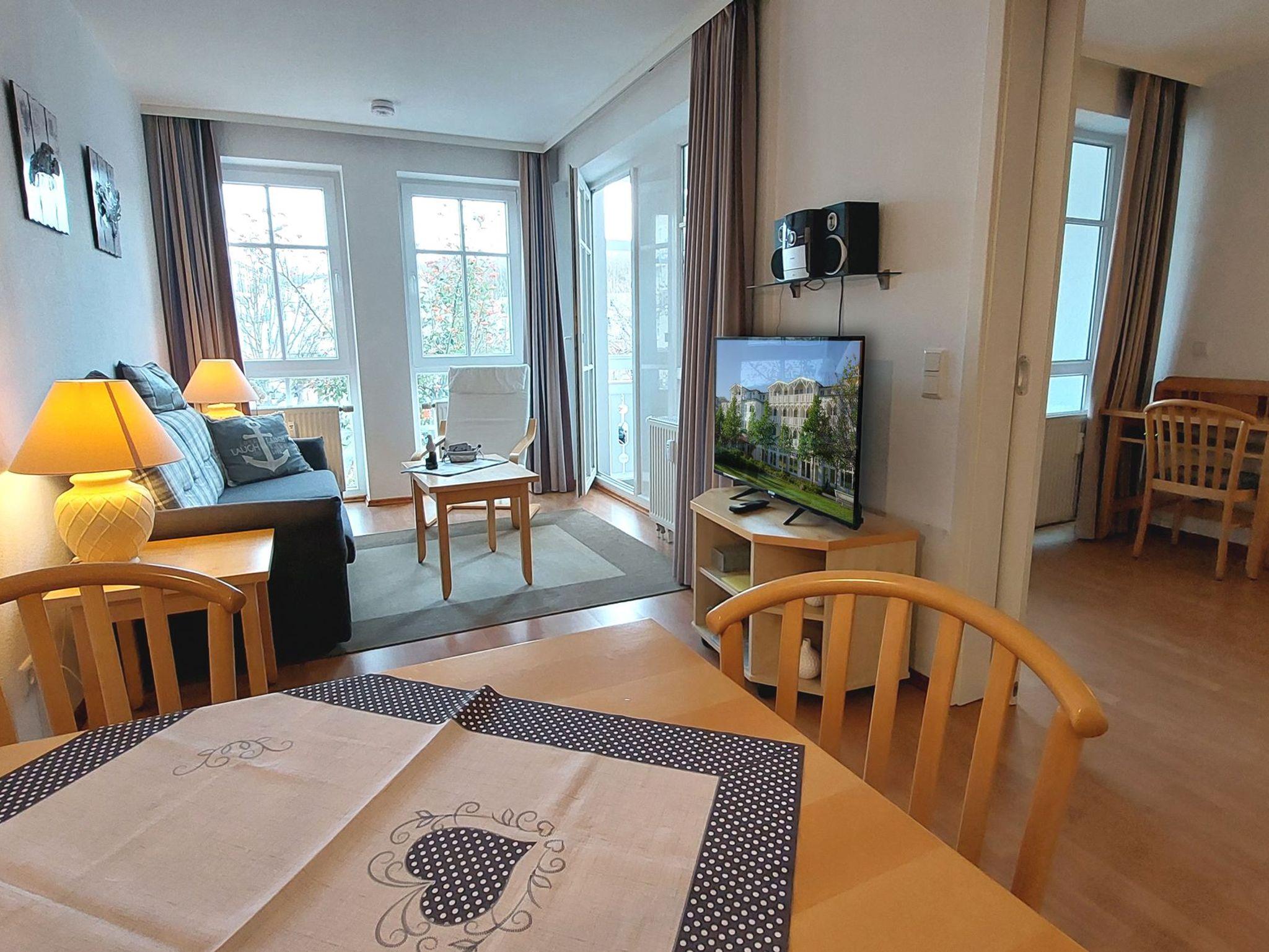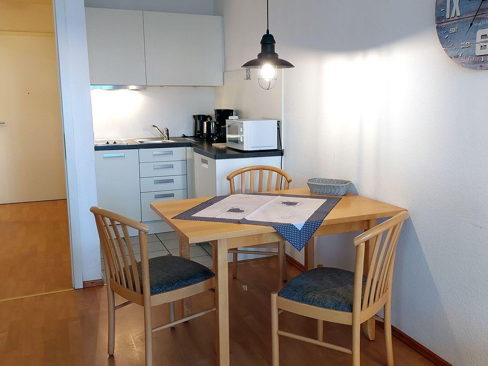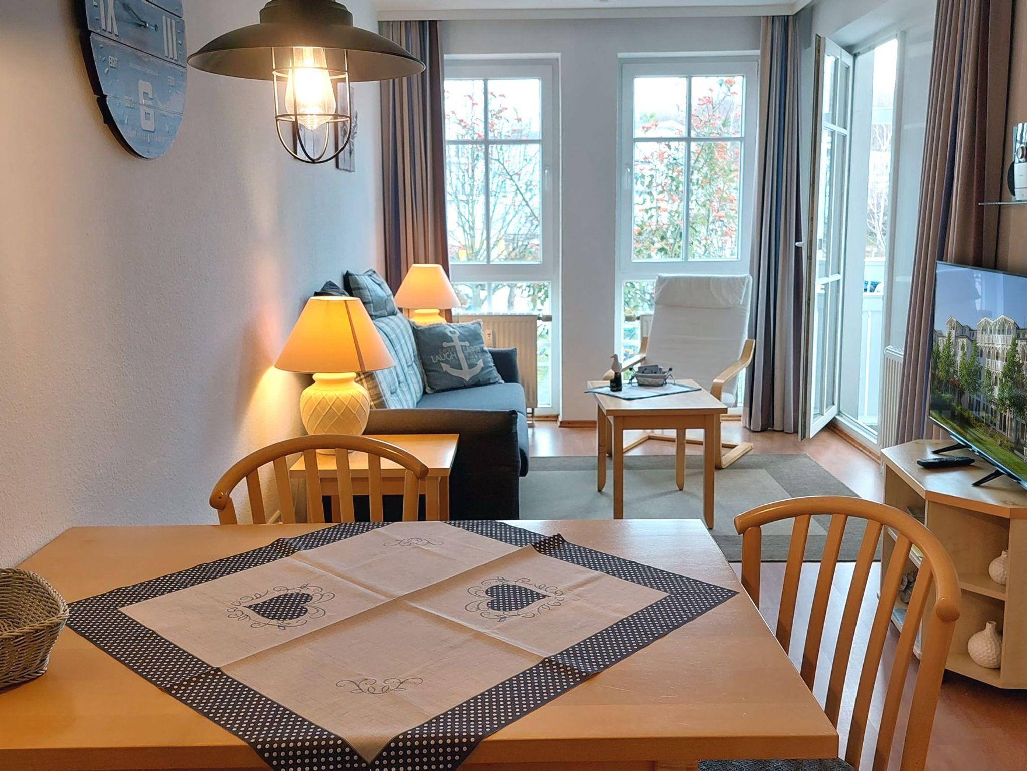Das Wohn- und Esszimmer bildet das Herzstück der Wohnung und ist mit einer ausklappbaren Couch, Couchtisch, Sessel, einem Flachbild-TV, Radio, Stereoanlage mit CD-Player, Esstisch und einem angrenzenden Balkon ausgestattet. Eine kostenfreie WLAN-Verbindung ist vorhanden. Die moderne Einbauküche ist komplett ausgestattet und verfügt unter anderem über einen Geschirrspüler, einen Kühlschrank mit Gefrierfach, eine Mikrowelle, ein 2-Platten-Cerankochfeld sowie einen Toaster, eine Kaffeemaschine, einen Eierkocher und einen Wasserkocher.