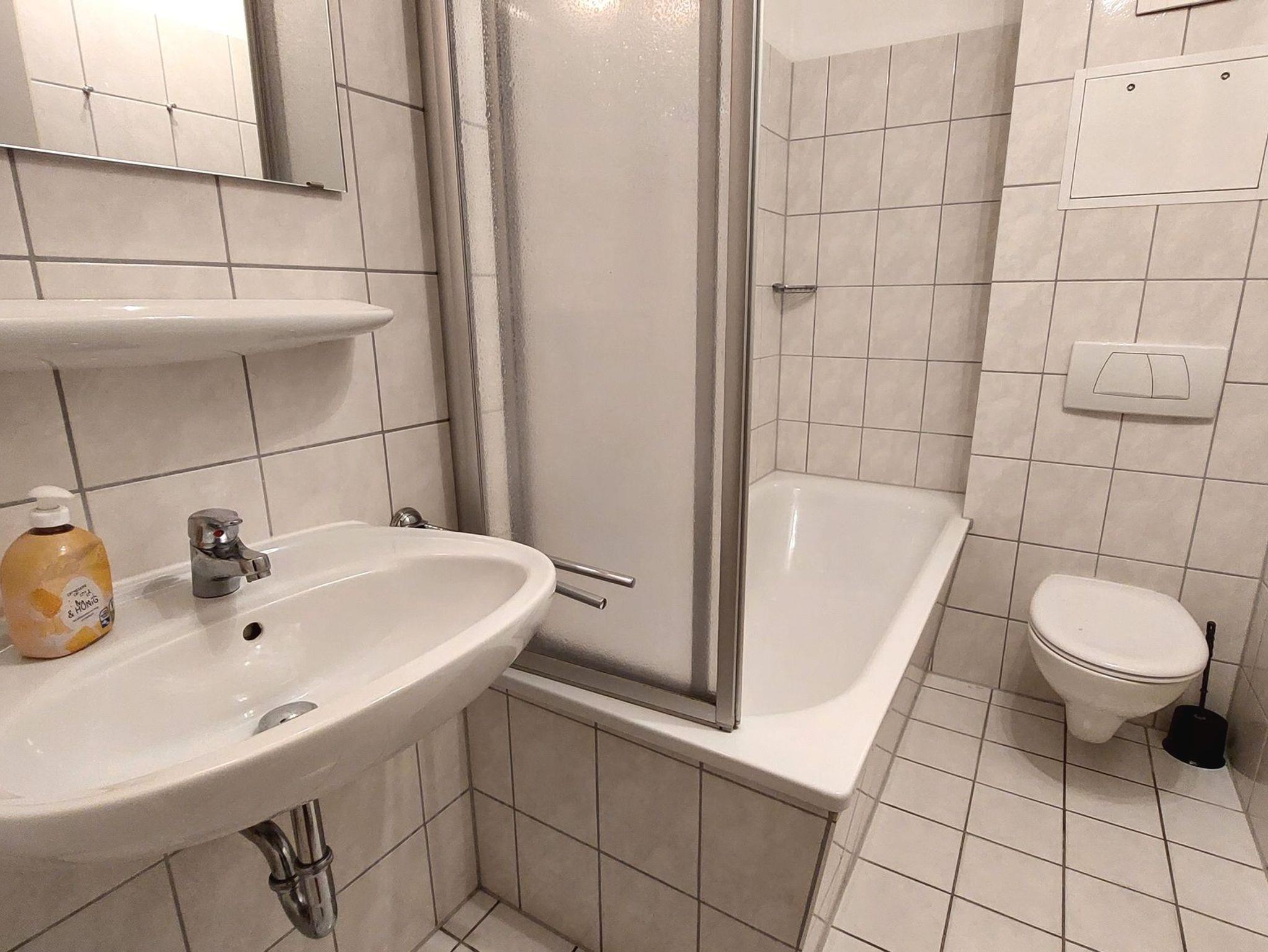 Das Badezimmer ist modern und hell gefliest und verfügt über eine Badewanne mit integrierter Duschmöglichkeit sowie ein WC. Ein Fön ist vorhanden. Eine kleine Abstellkammer gehört ebenfalls zur Wohnung.