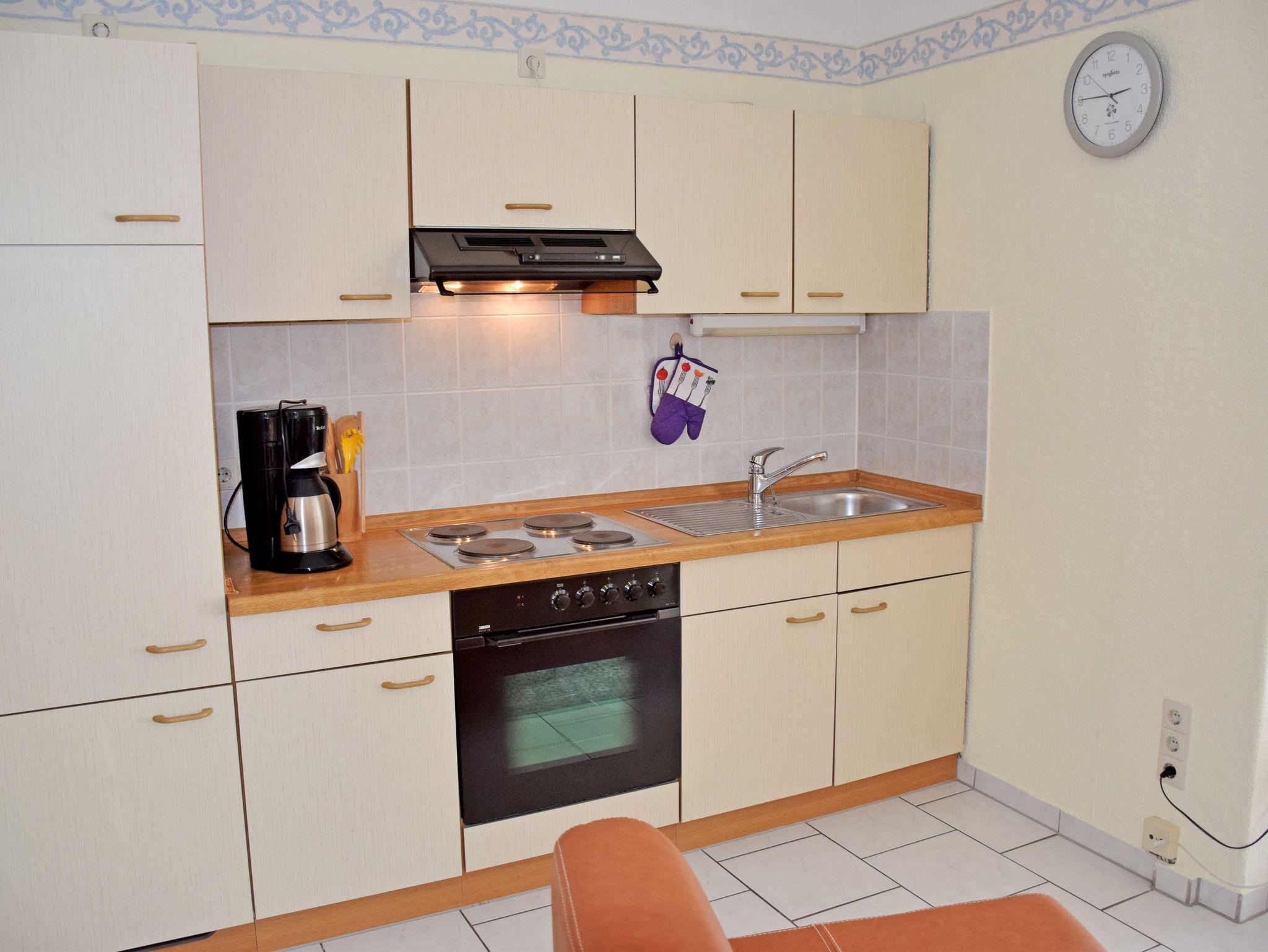 Die Küchenzeile ist mit einem Herd, Abzugshaube, Backofen, Wasserkocher, Kaffeemaschine, Toaster und Kühlschrank komplett ausgestattet.