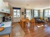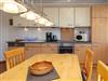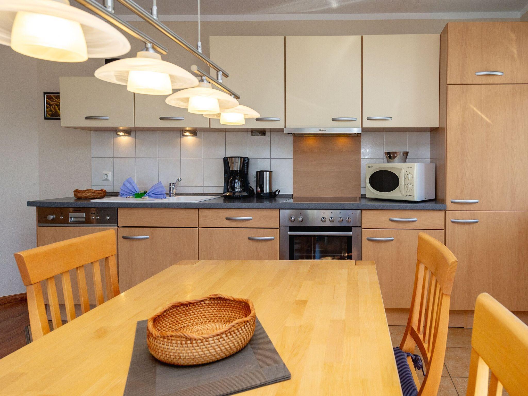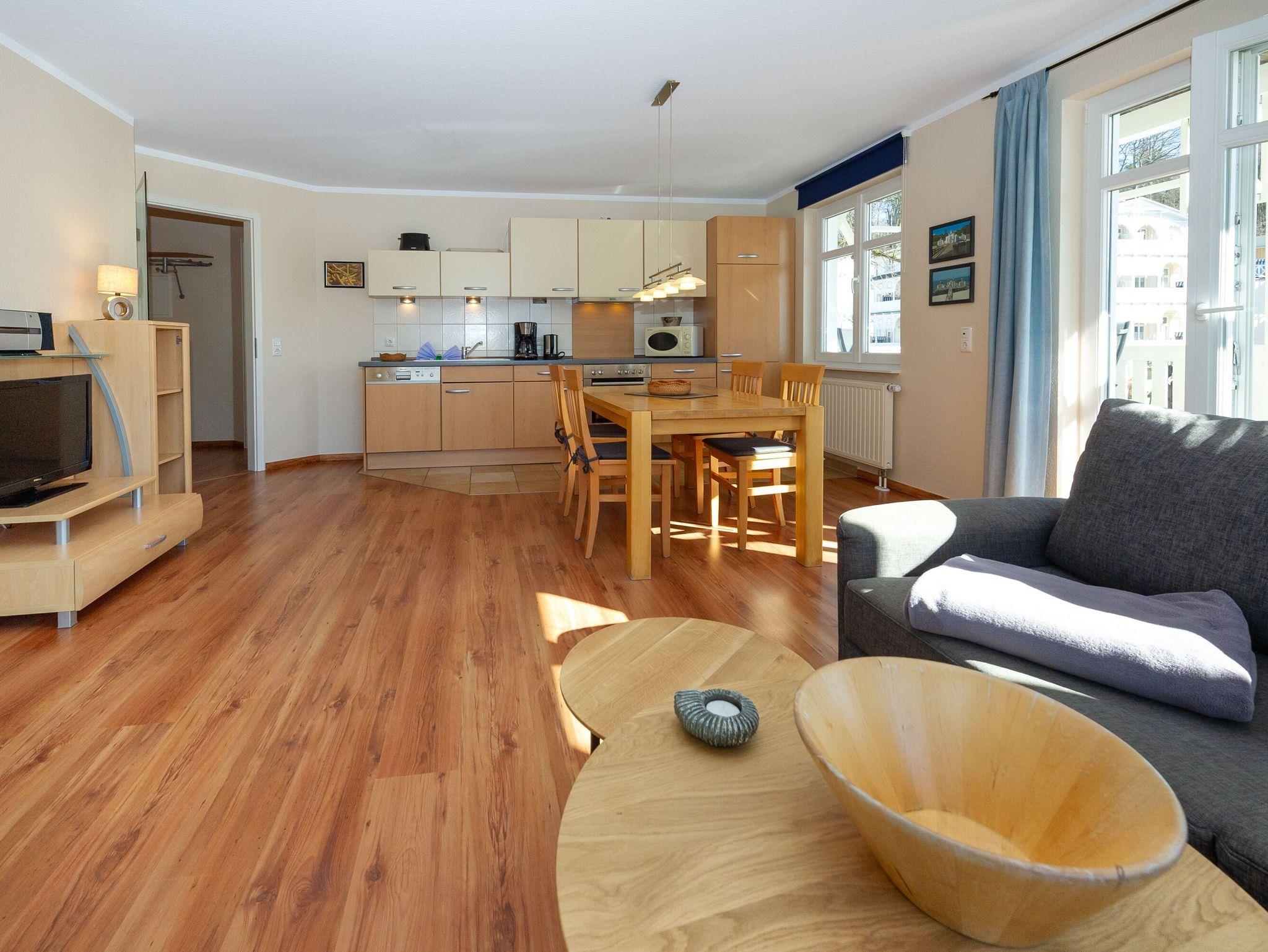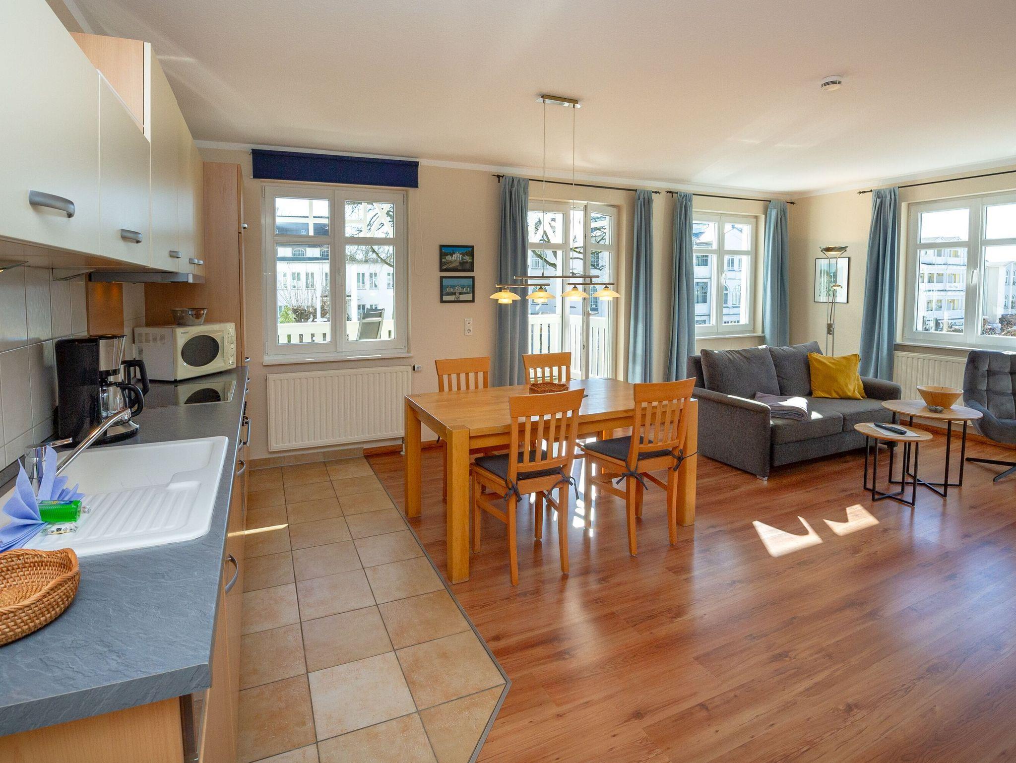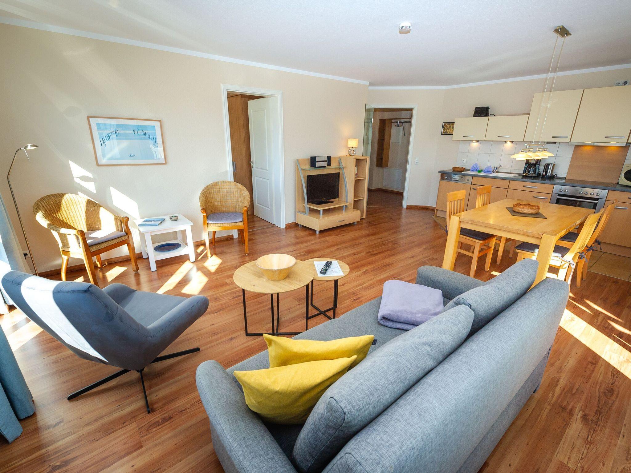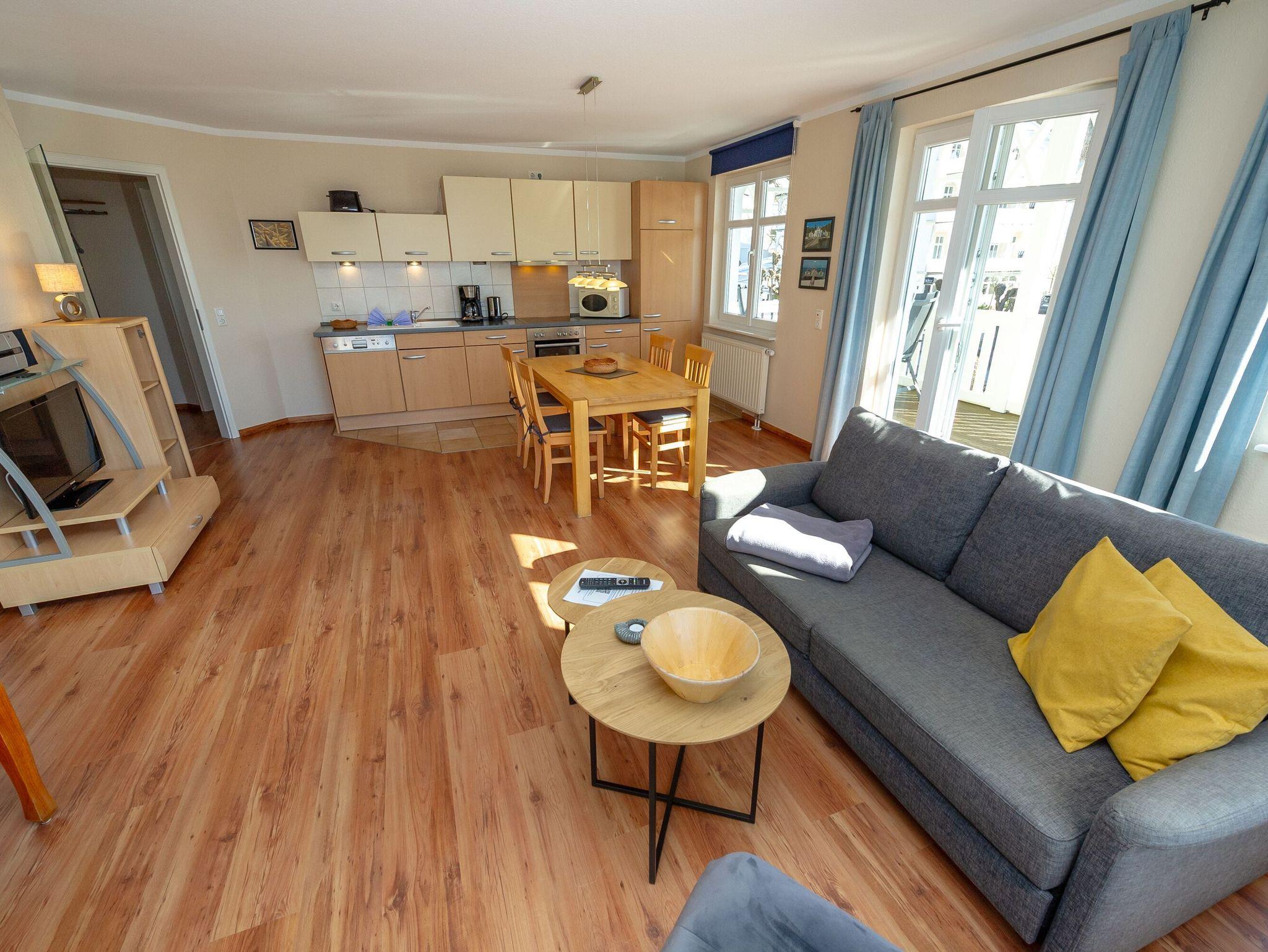 Der helle, freundliche Wohnraum ist mit einer bequemen Schlafcouch (die als Aufbettung für 2 Personen genutzt werden kann), einem Sessel, zwei Korbsesseln, einem Flachbild-TV, einer Mini-Stereoanlage mit CD-Player und einem Esstisch ausgestattet. Die harmonisch im Wohnbereich integrierte Küchenzeile ist ausgestattet mit einem Kühlschrank mit Gefrierfach, einem 4-Platten-Cerankochfeld, einem Backofen, einer Geschirrspülmaschine, einer Mikrowelle, Wasserkocher, Kaffeemaschine, Toaster und diversem Kleininventar, das die Küchenausstattung komplettiert.