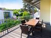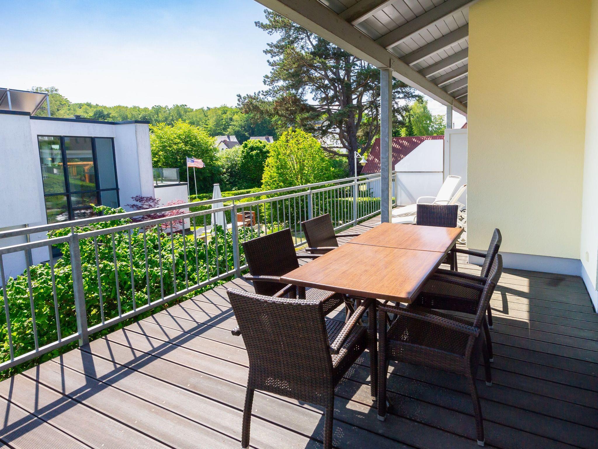 Die sonnige Hochterrasse gen Süden ist teilweise überdacht. Die beiden Sonnenliegen und die großzügige Sitzgruppe führen die exklusive Ausstattung auch im Außenbereich fort und bieten die Möglichkeit, sich rundum wohl zu fühlen.
