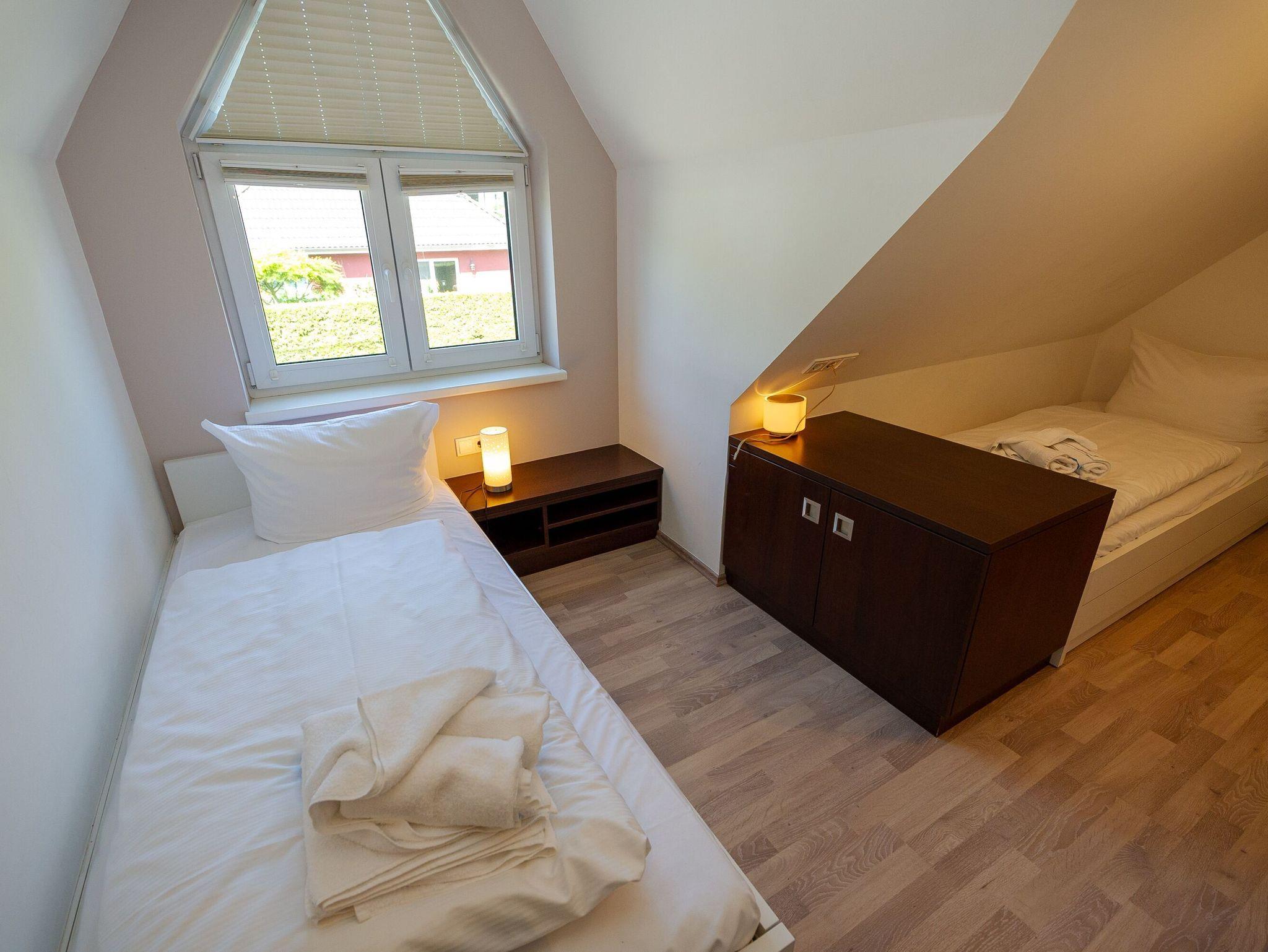 Im Obergeschoss befinden sich zwei Schlafzimmer mit jeweils einem Doppelbett, ein weiteres Schlafzimmer im Erker mit 2 Einzelbetten sowie das zweite Badezimmer, ausgestattet mit Dusche/WC, Badewanne, Waschtisch und beheizbarem Handtuchtrockner. Leichte Dachschrägen vermitteln Gemütlichkeit.