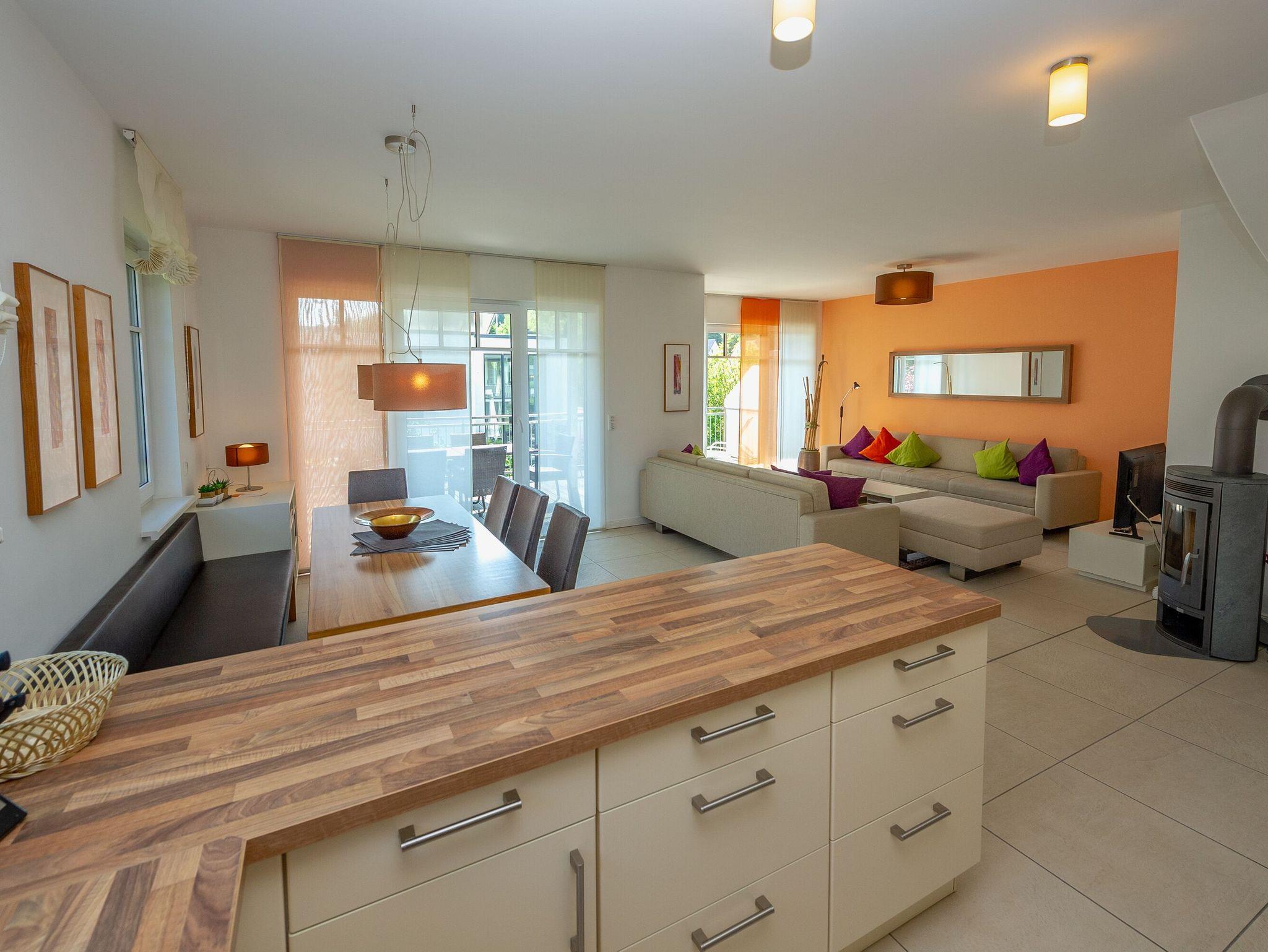 Diese ca. 100 m² große Haushälfte über zwei Ebenen mit geräumiger Hochterrasse zur Südseite (ca. 22 m²) verfügt im Erdgeschoss über einen großzügig gestalteten Wohn- und Essbereich mit bequemer Sitzgruppe. Die komplette Ausstattung des Hauses wurde durch einen Innenarchitekten konzipiert.