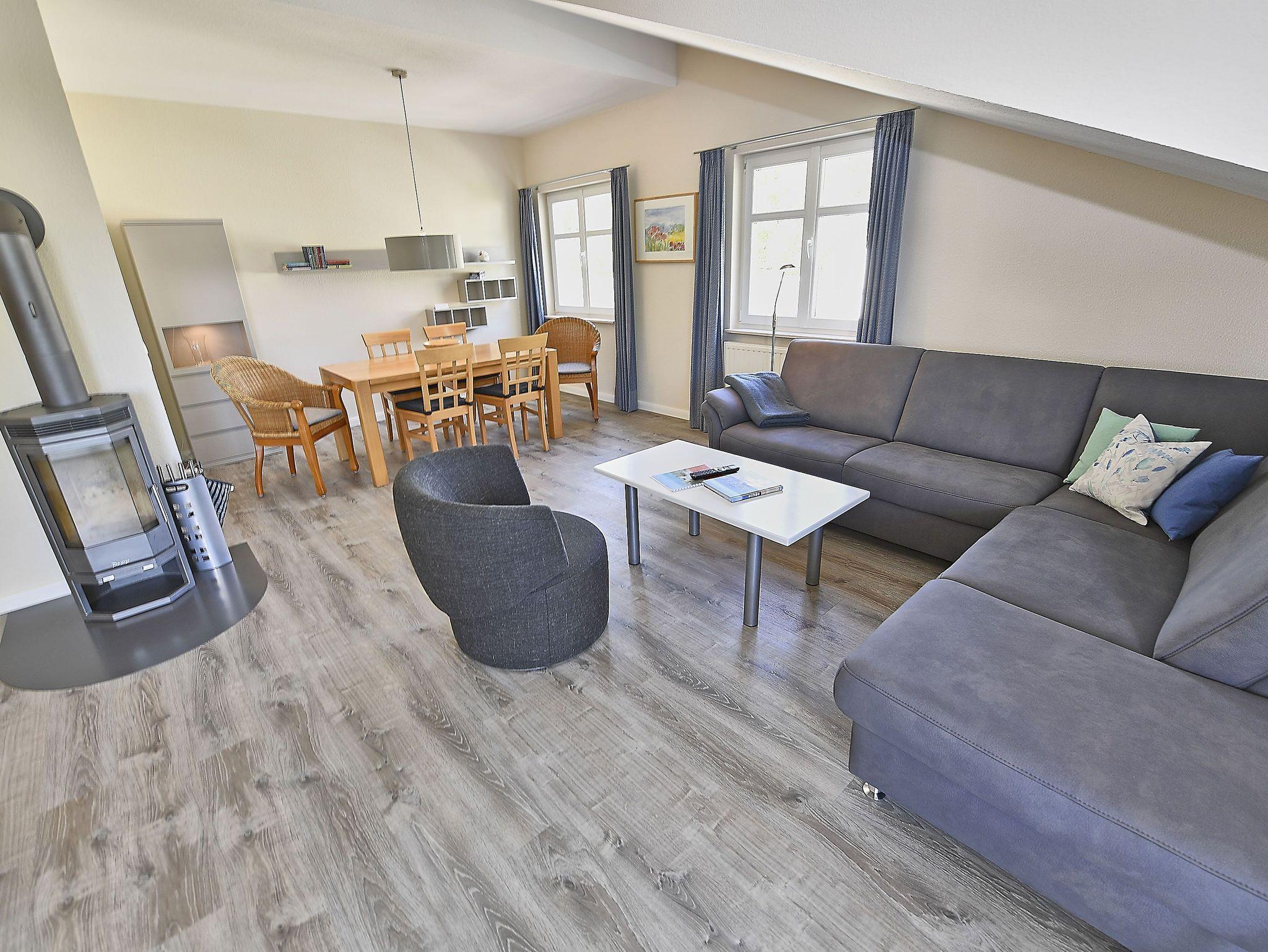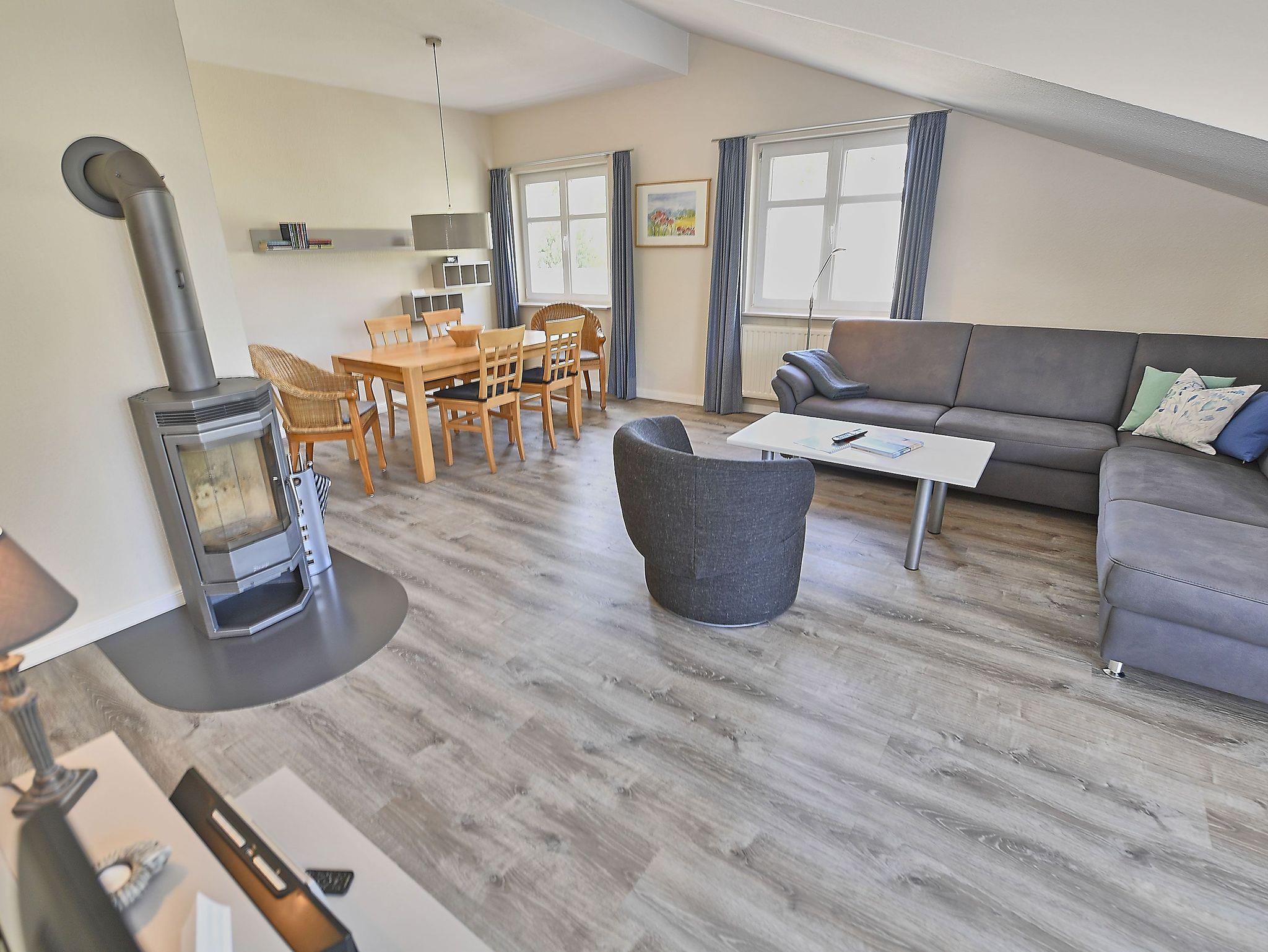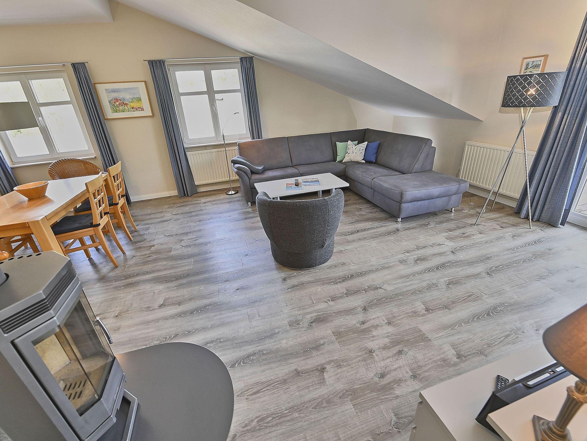 Der helle, freundliche Wohnraum ist mit einer bequemen Schlafcouch (die als Aufbettung für 2 Personen genutzt werden kann), 2 Sesseln und 2 Korbsesseln, einem Kaminofen, einem Flachbild-TV, einer Mini-Stereoanlage mit CD-Player und einem Esstisch passend für die Personenanzahl in der Wohnung ausgestattet.