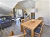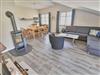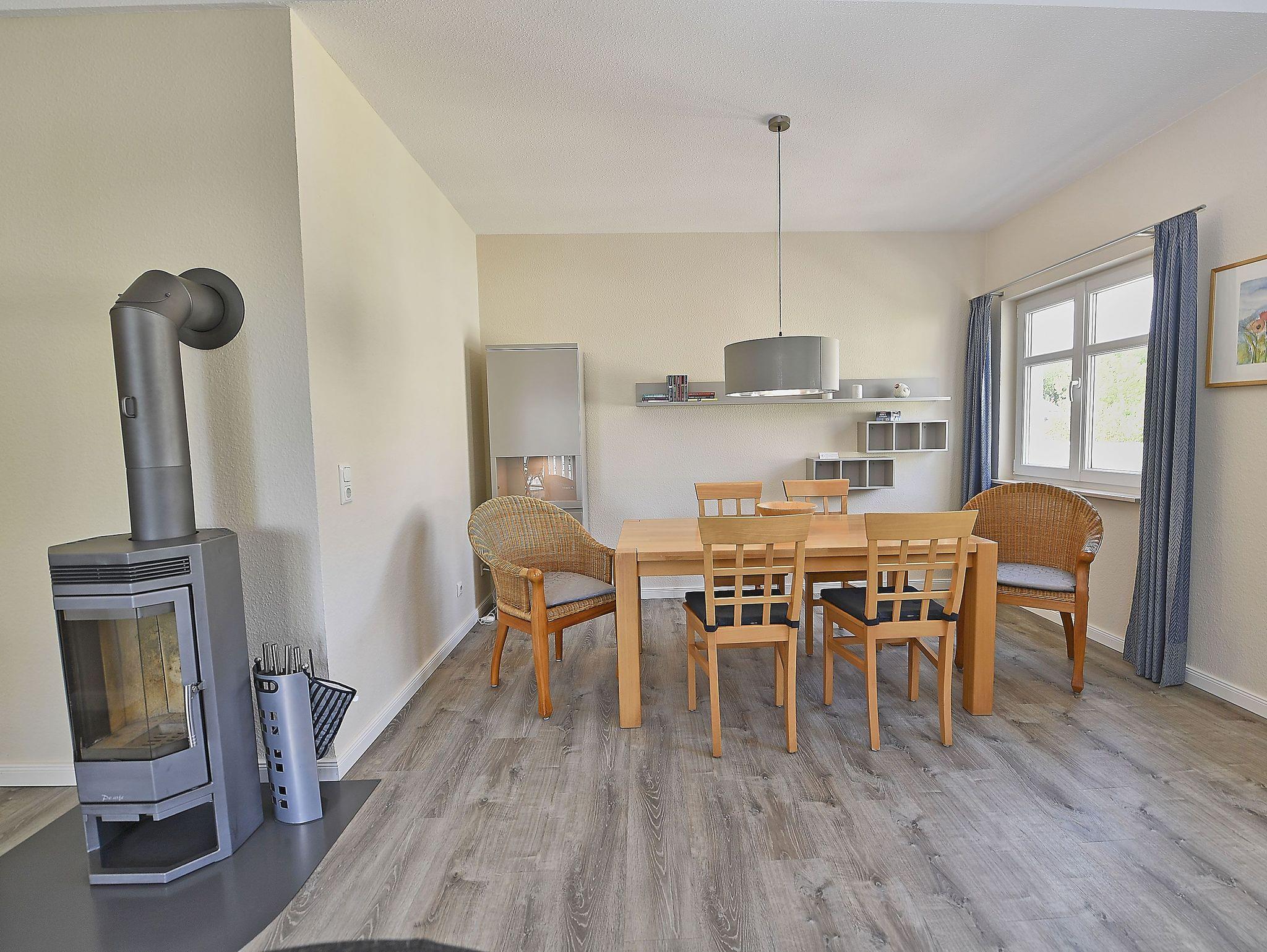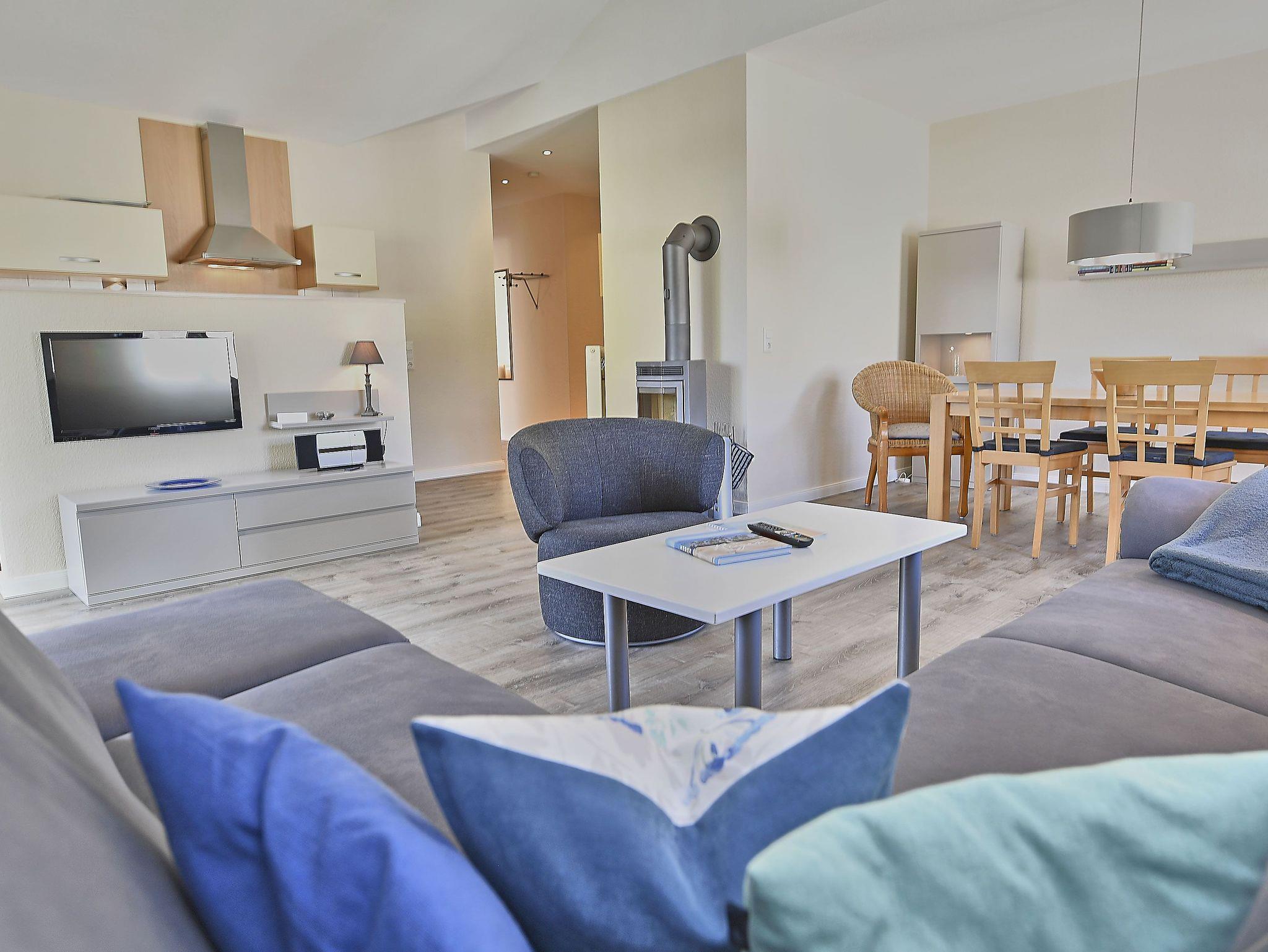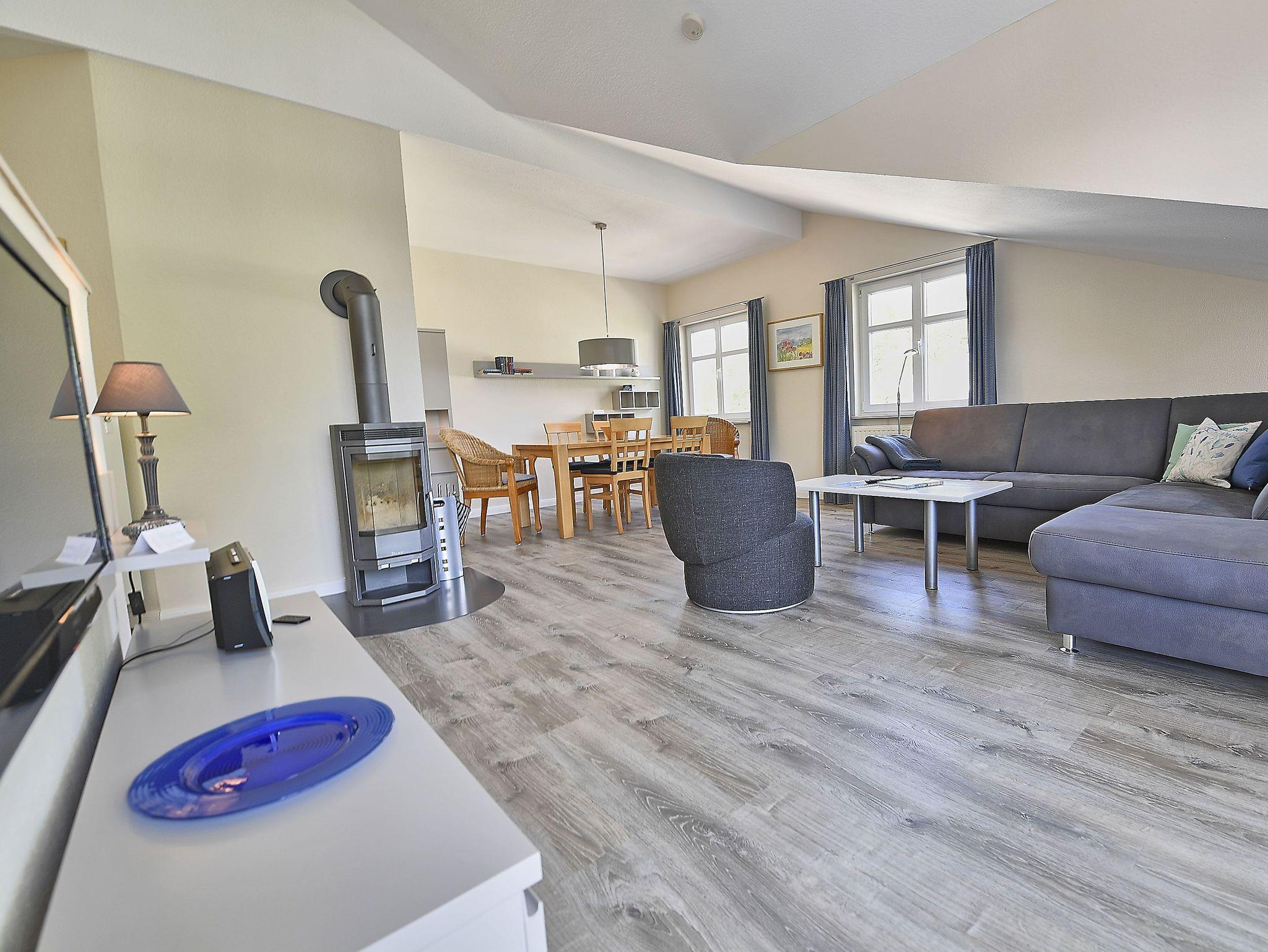Der helle, freundliche Wohnraum ist mit einer bequemen Schlafcouch (die als Aufbettung für 2 Personen genutzt werden kann), 2 Sesseln und 2 Korbsesseln, einem Kaminofen, einem Flachbild-TV, einer Mini-Stereoanlage mit CD-Player und einem Esstisch passend für die Personenanzahl in der Wohnung ausgestattet.