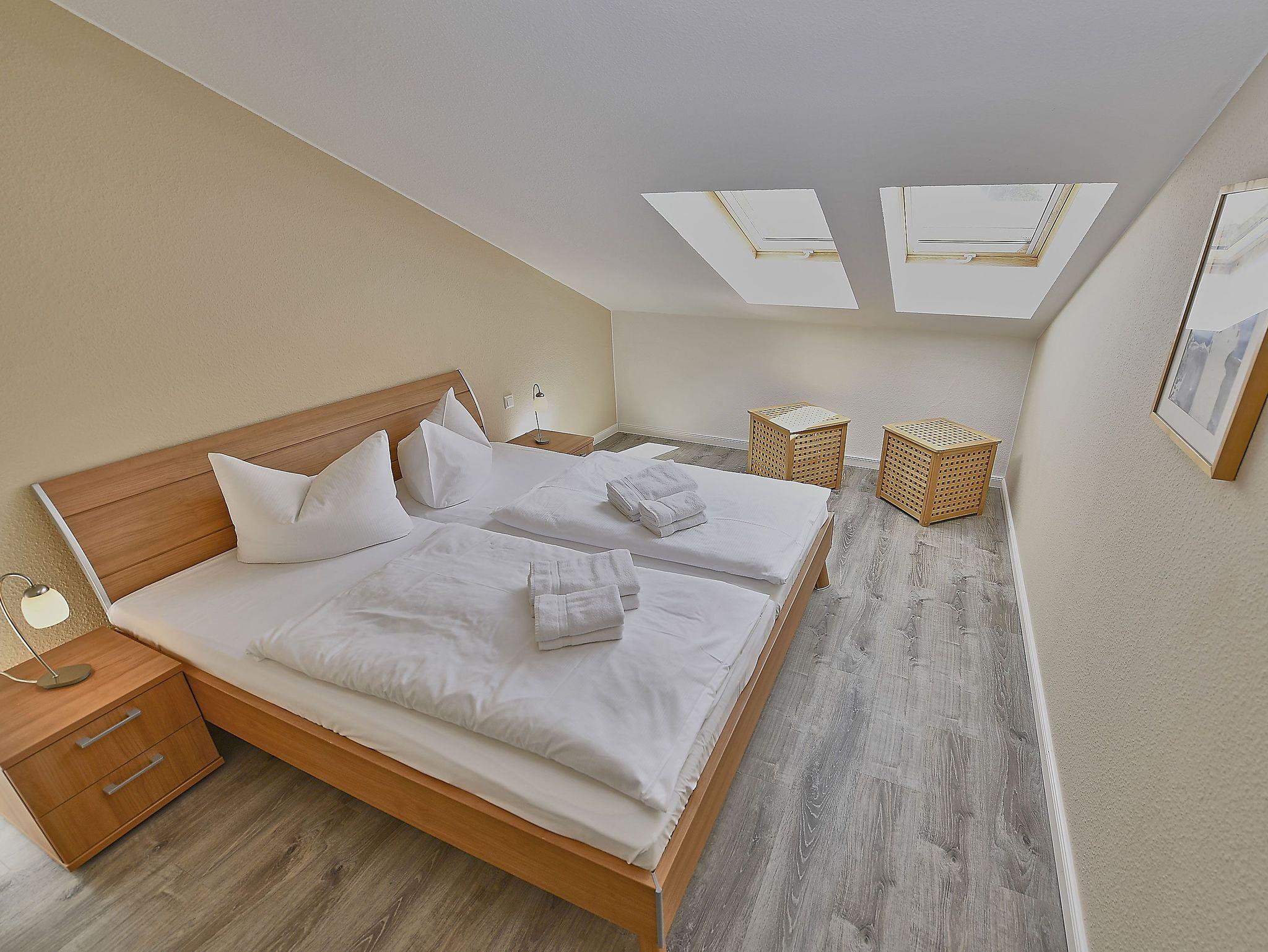 Weiterhin gibt es zwei Schlafzimmer mit je einem Doppelbett und ausreichend Platz für Ihre Garderobe sowie ein modernes Bad mit Dusche/WC und einem Haartrockner.