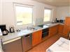 In dem zweiten Wohn- und Schlafraum stehen zwei getrennte Einzelbetten, eine Couch mit Tisch, ein zweites TV-Gerät und Schränke. Die helle Wohnküche ist voll ausgestattet (Geschirrspüler, Kaffeemaschine, Toster, Wasserkocher, Herd, Mikrowelle, Kühlschrank, großzügiger Esstisch mit Stühlen).
