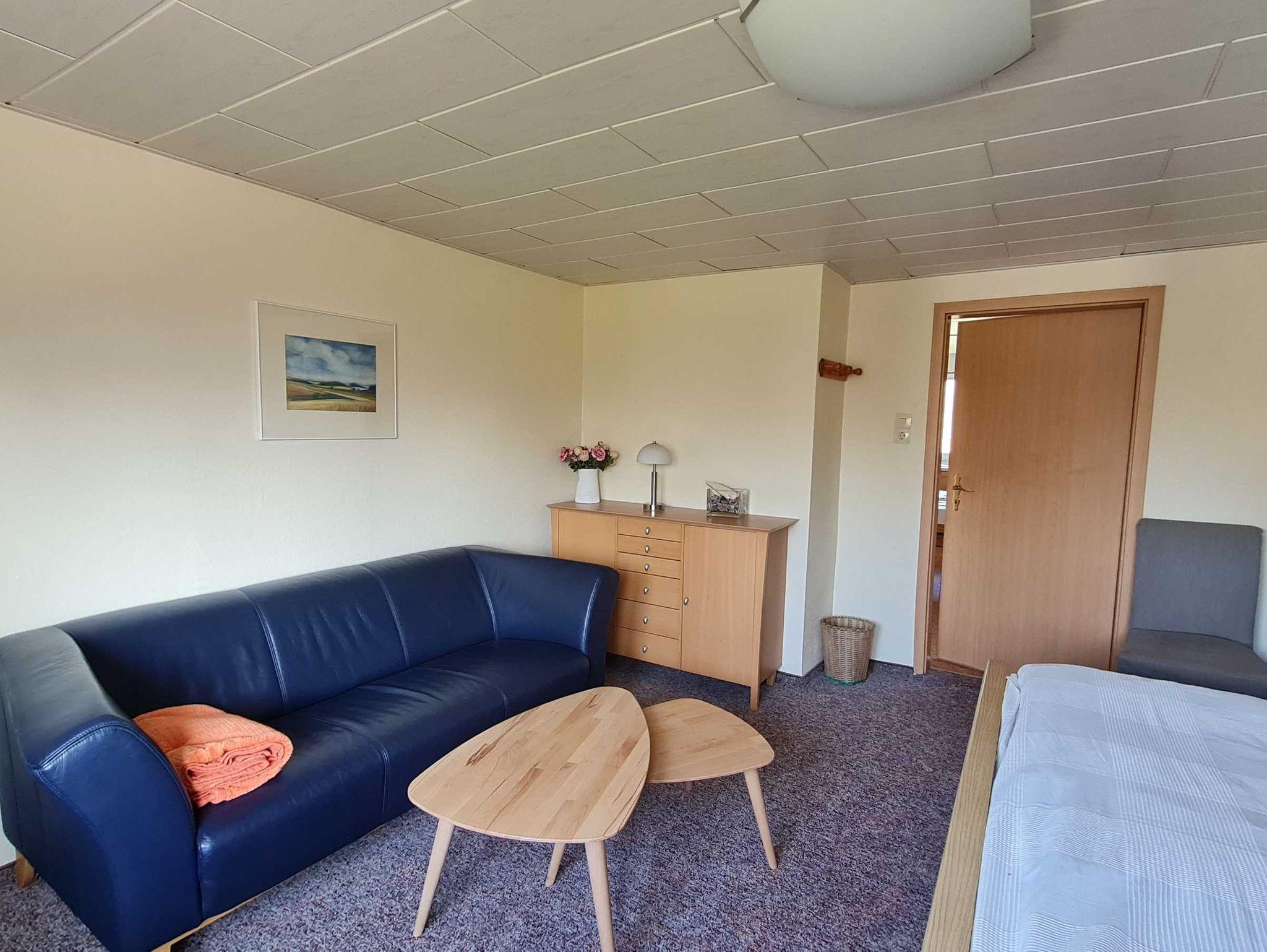 Die große Ferienwohnung befindet sich im Obergeschoss des Hauses und hat zwei Zimmer, die modern und freundlich eingerichtet sind. Im ersten Wohn- und Schlafzimmer befindet sich ein Doppelbett mit Nachttischen und Leselampen, eine Couch mit Sessel und ein TV-Gerät, sowie Radio.