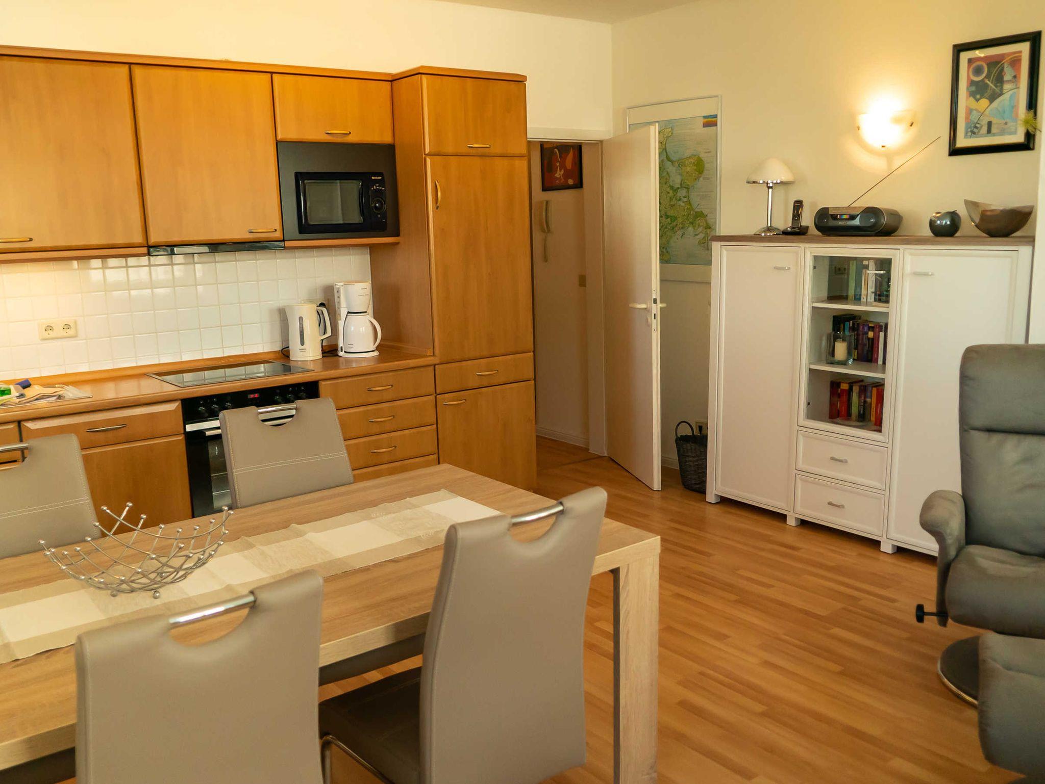 Die Küche ist ein komplett ausgestatteter Küchenblock mit Backofen, 4 Zonen-Cerankochfeld, Spülmaschine, Kühlschrank mit Gefrierfach Mikrowelle, Friesland Geschirr Kleine Brise & Besteck für 12 Personen, entsprechende Anzahl von Gläsern (auch Weizenbier-, Sekt- und Weingläser), Toaster, Kaffeemaschine, Mixer, Stabmixer, Salatschleuder, Wasser- sowie Eierkocher, WMF Töpfe, Teflonpfannen & vielen weiteren Extras.