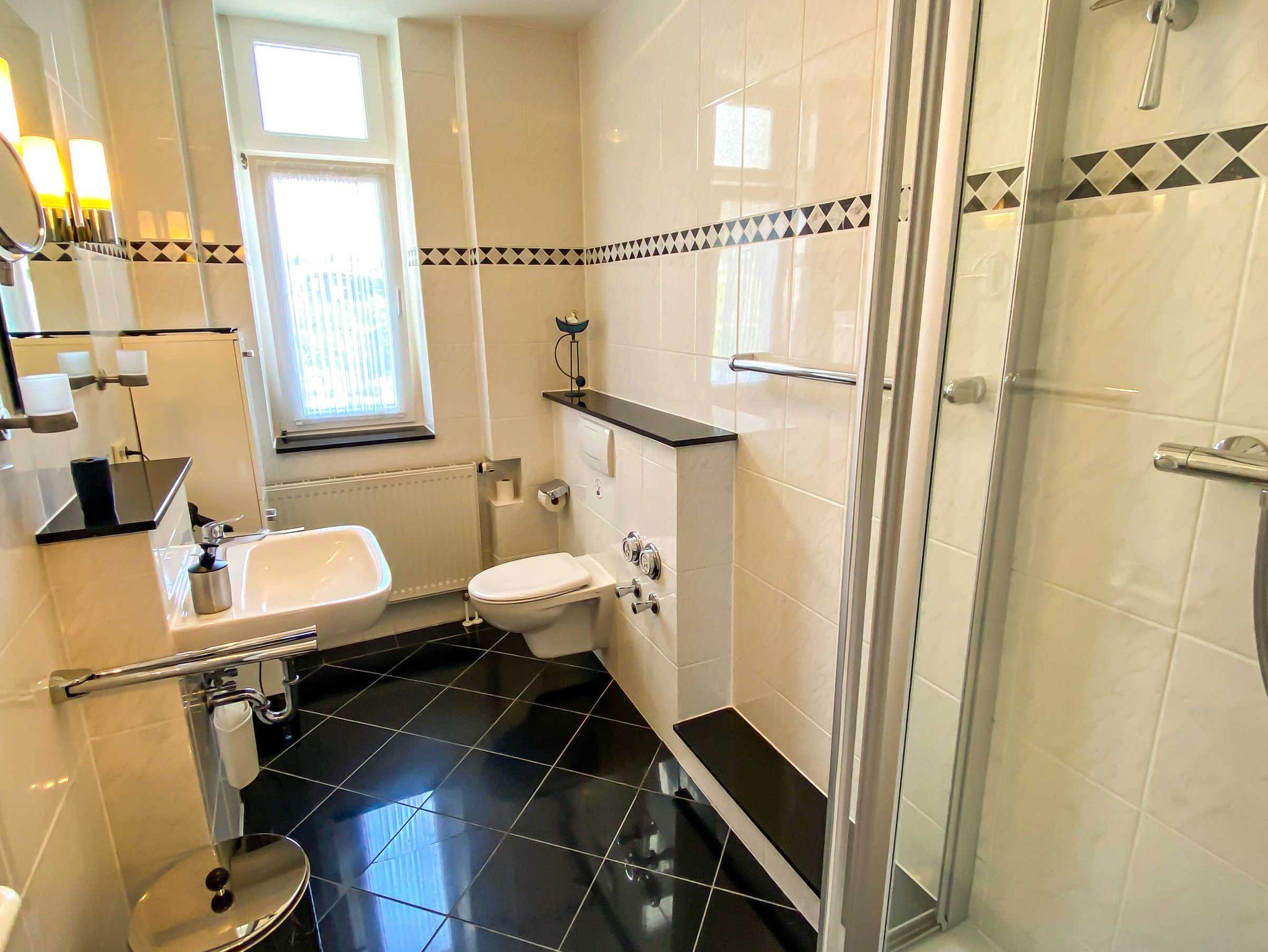 Das Bad ist ein großzügiges Duschbad mit WC,1 Badezimmerhochschrank, 2 doppelflügige Handtuchhalter, 2 Duschhandtuchstangen, 2 Zahnputzglashalter, 1 festinstallierter Kosmetikspiegel, 1 Personenwaage, 1 Edelstahltonne für Schmutzwäsche sowie ein Föhn machen das Bad für Sie komfortabel.