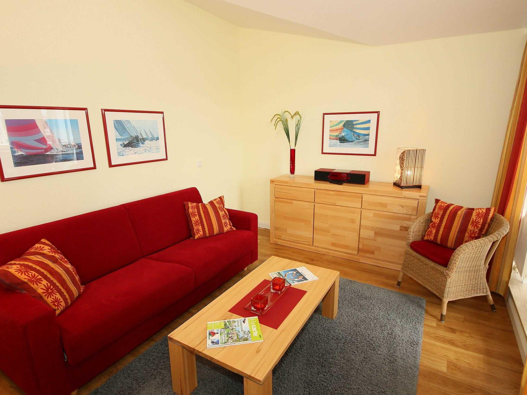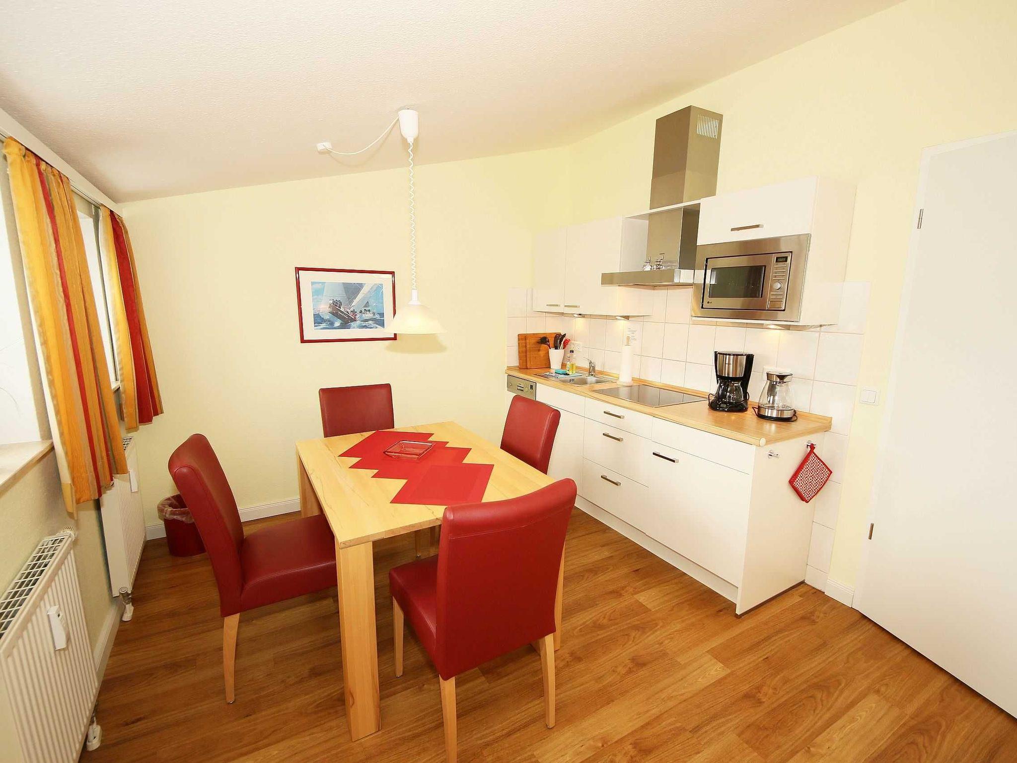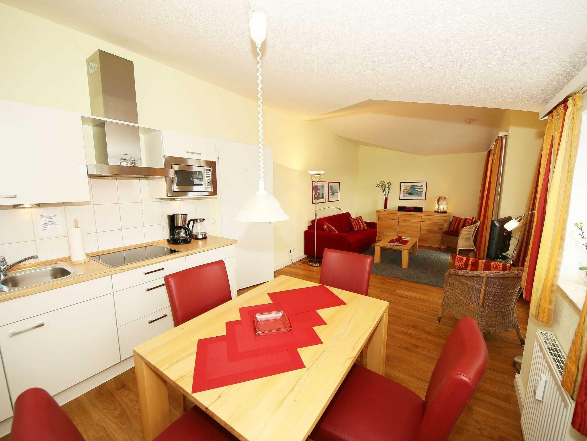 Die Nichtraucherferienwohnung Nr. 550 (Penthouse) befindet sich in der 3. Etage (Dachgeschoß). Sie ist mit ca. 57 qm hell und geräumig und bietet Ihnen Platz für 2 bis 4 Personen und 1 Kleinkind bis 3 Jahre im Kinderreisebett. In der Wohnung finden Sie einen kombinierten Wohn-/Koch- und Essbereich. Die integrierte, moderne Küchenzeile lässt mit einer eingebauten Mikrowelle mit Grillfunktion, Cerankochfeld, Geschirrspüler, Kühlschrank mit Eisfach, Kaffeemaschine, Toaster, Wasserkocher und anderen praktischen Helfern, die keine kulinarischen Wünsche offen lassen. Der Essplatz rundet diesen Bereich ab. Der angrenzende Wohnbereich ist geschmackvoll mit Massivholzmöbeln, einer Stehlampe, Couchtisch und einer gemütlichen Schlafcouch eingerichtet. Diese lässt sich in wenigen Handgriffen zur Schlafstätte (1,60 m x 2,00 m) für 2 weitere Personen umfunktionieren. Abgerundet wird der Wohnbereich mit einem Blu-Ray-Player, einer kleinen Hifi-Compactanlage (mit USB-Anschluss) sowie einem Flachbild-TV mit Sky (Auswahl von Sport, Film, Dokumentation). Erfreuen Sie sich an einer kleinen Buchauswahl und einigen Gesellschaftsspielen. Auch auf einen Internetanschluss (W-LAN) müssen Sie im Urlaub nicht verzichten. Dieser ist für Sie inklusive. Der bestuhlte Balkon, Richtung Osten, verfügt zusätzlich über einen Sonnenschirm und Relaxliegen. Begehbar ist der Balkon vom Wohnbereich. Das Schlafzimmer ist mit einem Doppelbett (1,80 m x 2,00 m), Nachttischkonsolen und Kleiderschrank ausgestattet. Verdunkelungsgardinen schützen in der Wohnung vor fremden Blicken von außerhalb. Im gefliesten Badezimmer befindet sich eine Badewanne mit Duschabtrennung, Waschplatz, WC und Fön. Insektenschutzgitter befinden sich in allen Räumlichkeiten. In der Wohnung finden Sie einen Staubsauger und einen Wäschetrockner für den Balkon. Ein eigener PKW-Stellplatz (Nr. 116) befindet sich in der Tiefgarage (Einfahrtshöhe 1,80 m) des Hauses. Hier befindet sich auch ein allgemeiner Fahrradraum, wo Sie ihre mitgebrachten Fahrräder unterstellen können. Haustiere sind nicht erlaubt. Die Erstausstattung eines Wäschepaketes (komplette Bettwäsche, 1 Duschhandtuch, 2 kleine Handtücher) können Sie bis 14 Tage vor Anreise gegen einen Aufpreis dazu buchen oder durch eigene ergänzen. Ab 2 gebuchten Paketen erhalten Sie einmalig 1 Geschirrhandtuch und 1 Duschvorleger dazu.
