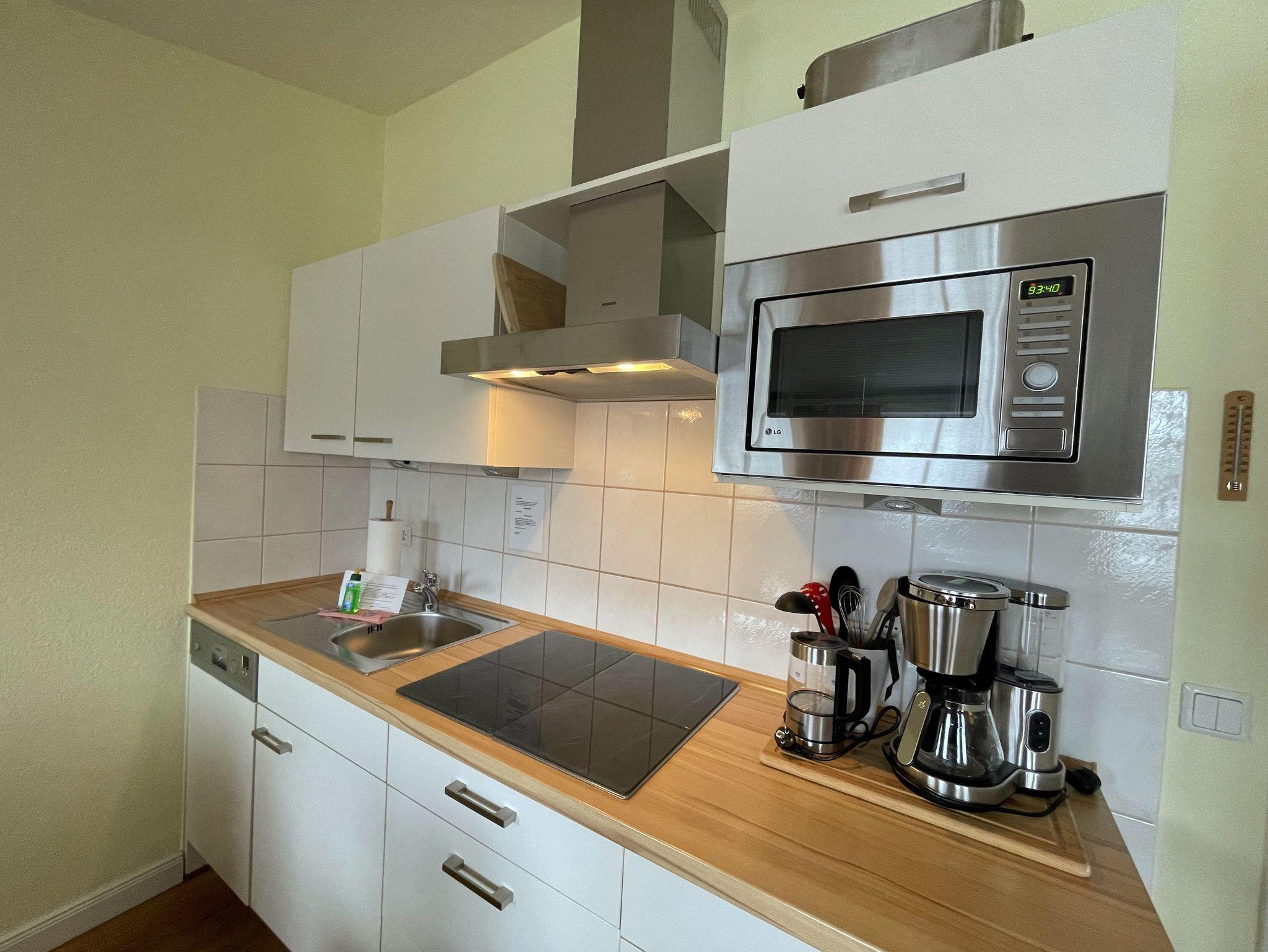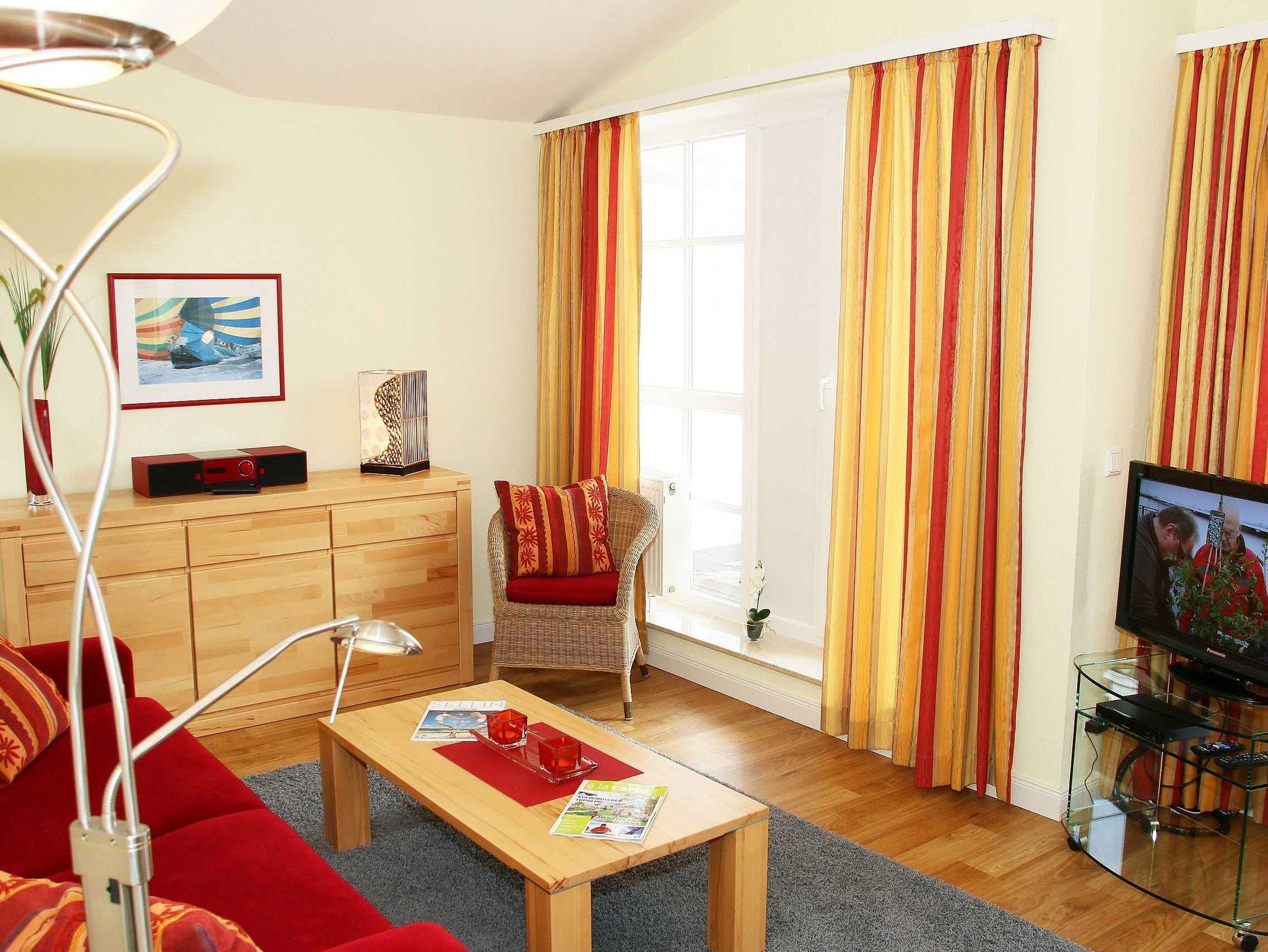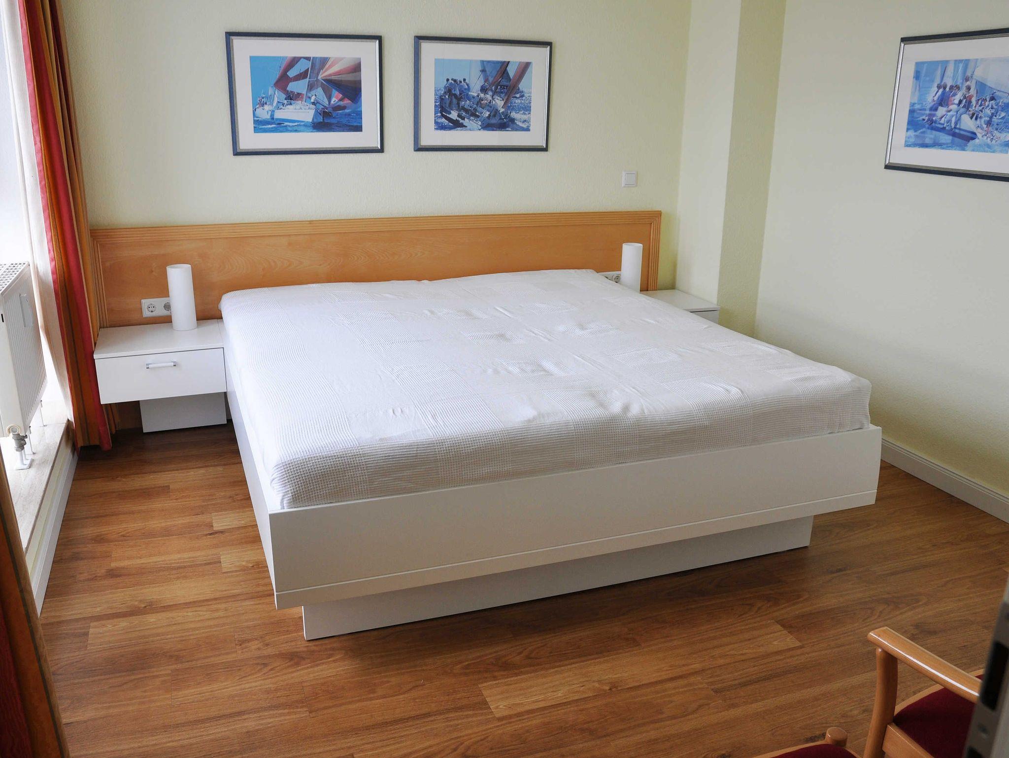 Die Nichtraucherferienwohnung Nr. 550 (Penthouse) befindet sich in der 3. Etage (Dachgeschoß). Sie ist mit ca. 57 qm hell und geräumig und bietet Ihnen Platz für 2 bis 4 Personen und 1 Kleinkind bis 3 Jahre im Kinderreisebett. In der Wohnung finden Sie einen kombinierten Wohn-/Koch- und Essbereich. Die integrierte, moderne Küchenzeile lässt mit einer eingebauten Mikrowelle mit Grillfunktion, Cerankochfeld, Geschirrspüler, Kühlschrank mit Eisfach, Kaffeemaschine, Toaster, Wasserkocher und anderen praktischen Helfern, die keine kulinarischen Wünsche offen lassen. Der Essplatz rundet diesen Bereich ab. Der angrenzende Wohnbereich ist geschmackvoll mit Massivholzmöbeln, einer Stehlampe, Couchtisch und einer gemütlichen Schlafcouch eingerichtet. Diese lässt sich in wenigen Handgriffen zur Schlafstätte (1,60 m x 2,00 m) für 2 weitere Personen umfunktionieren. Abgerundet wird der Wohnbereich mit einem Blu-Ray-Player, einer kleinen Hifi-Compactanlage (mit USB-Anschluss) sowie einem Flachbild-TV mit Sky (Auswahl von Sport, Film, Dokumentation). Erfreuen Sie sich an einer kleinen Buchauswahl und einigen Gesellschaftsspielen. Auch auf einen Internetanschluss (W-LAN) müssen Sie im Urlaub nicht verzichten. Dieser ist für Sie inklusive. Der bestuhlte Balkon, Richtung Osten, verfügt zusätzlich über einen Sonnenschirm und Relaxliegen. Begehbar ist der Balkon vom Wohnbereich. Das Schlafzimmer ist mit einem Doppelbett (1,80 m x 2,00 m), Nachttischkonsolen und Kleiderschrank ausgestattet. Verdunkelungsgardinen schützen in der Wohnung vor fremden Blicken von außerhalb. Im gefliesten Badezimmer befindet sich eine Badewanne mit Duschabtrennung, Waschplatz, WC und Fön. Insektenschutzgitter befinden sich in allen Räumlichkeiten. In der Wohnung finden Sie einen Staubsauger und einen Wäschetrockner für den Balkon. Ein eigener PKW-Stellplatz (Nr. 116) befindet sich in der Tiefgarage (Einfahrtshöhe 1,80 m) des Hauses. Hier befindet sich auch ein allgemeiner Fahrradraum, wo Sie ihre mitgebrachten Fahrräder unterstellen können. Haustiere sind nicht erlaubt. Die Erstausstattung eines Wäschepaketes (komplette Bettwäsche, 1 Duschhandtuch, 2 kleine Handtücher) können Sie bis 14 Tage vor Anreise gegen einen Aufpreis dazu buchen oder durch eigene ergänzen. Ab 2 gebuchten Paketen erhalten Sie einmalig 1 Geschirrhandtuch und 1 Duschvorleger dazu.