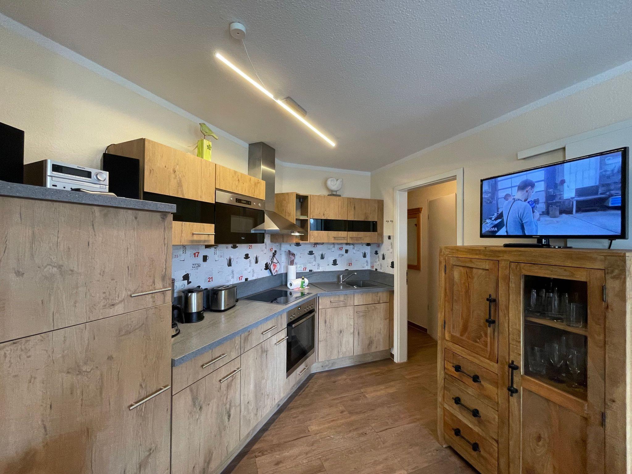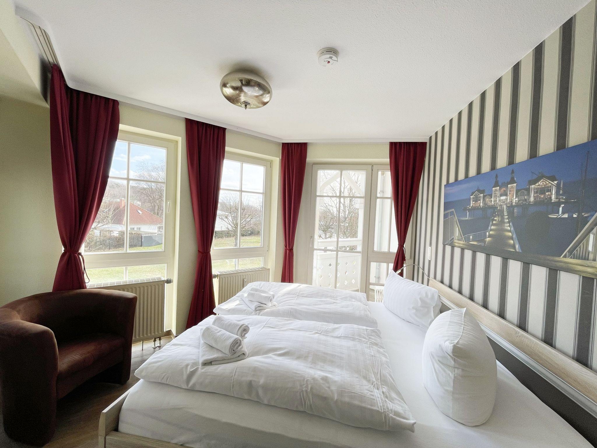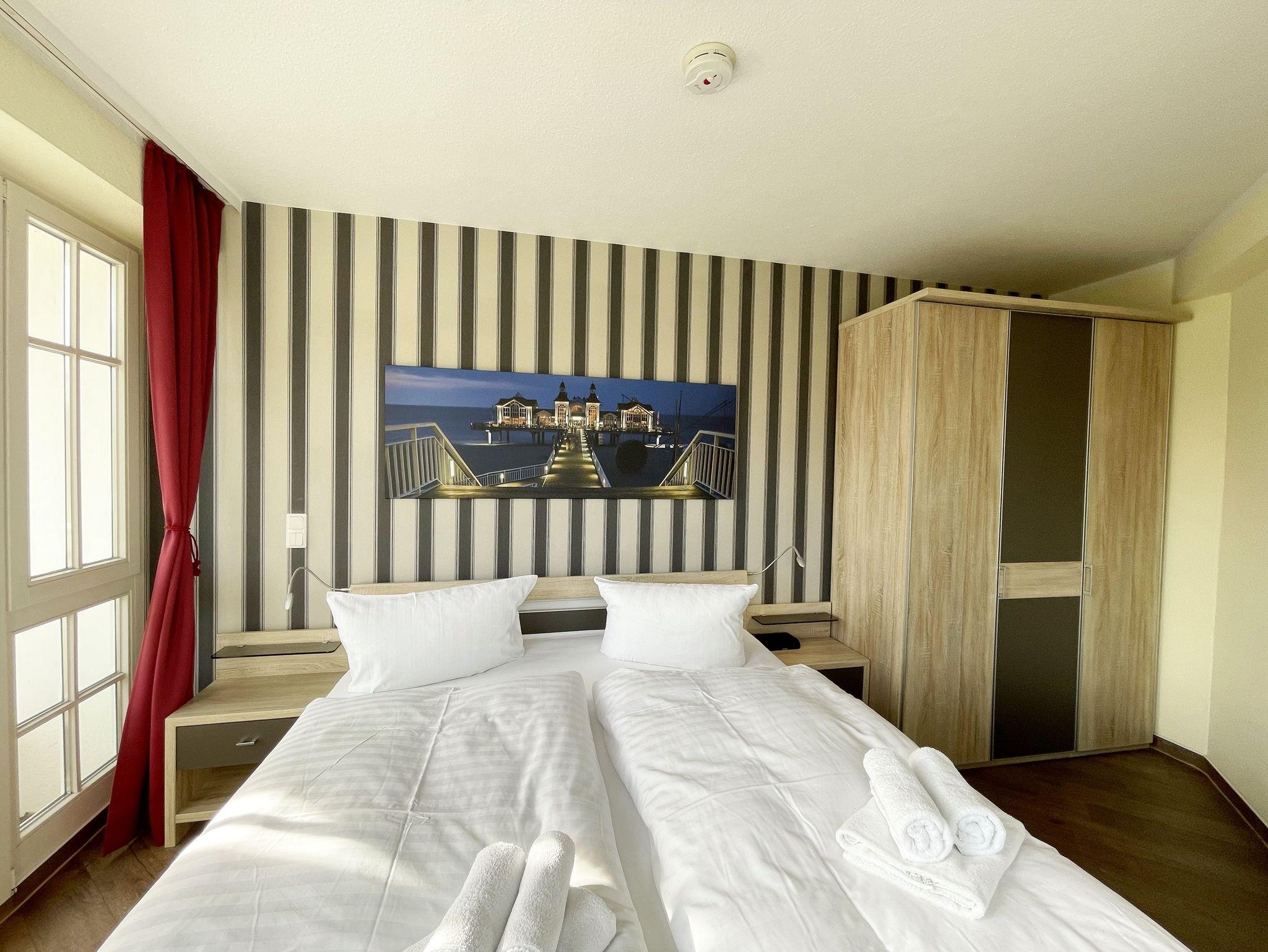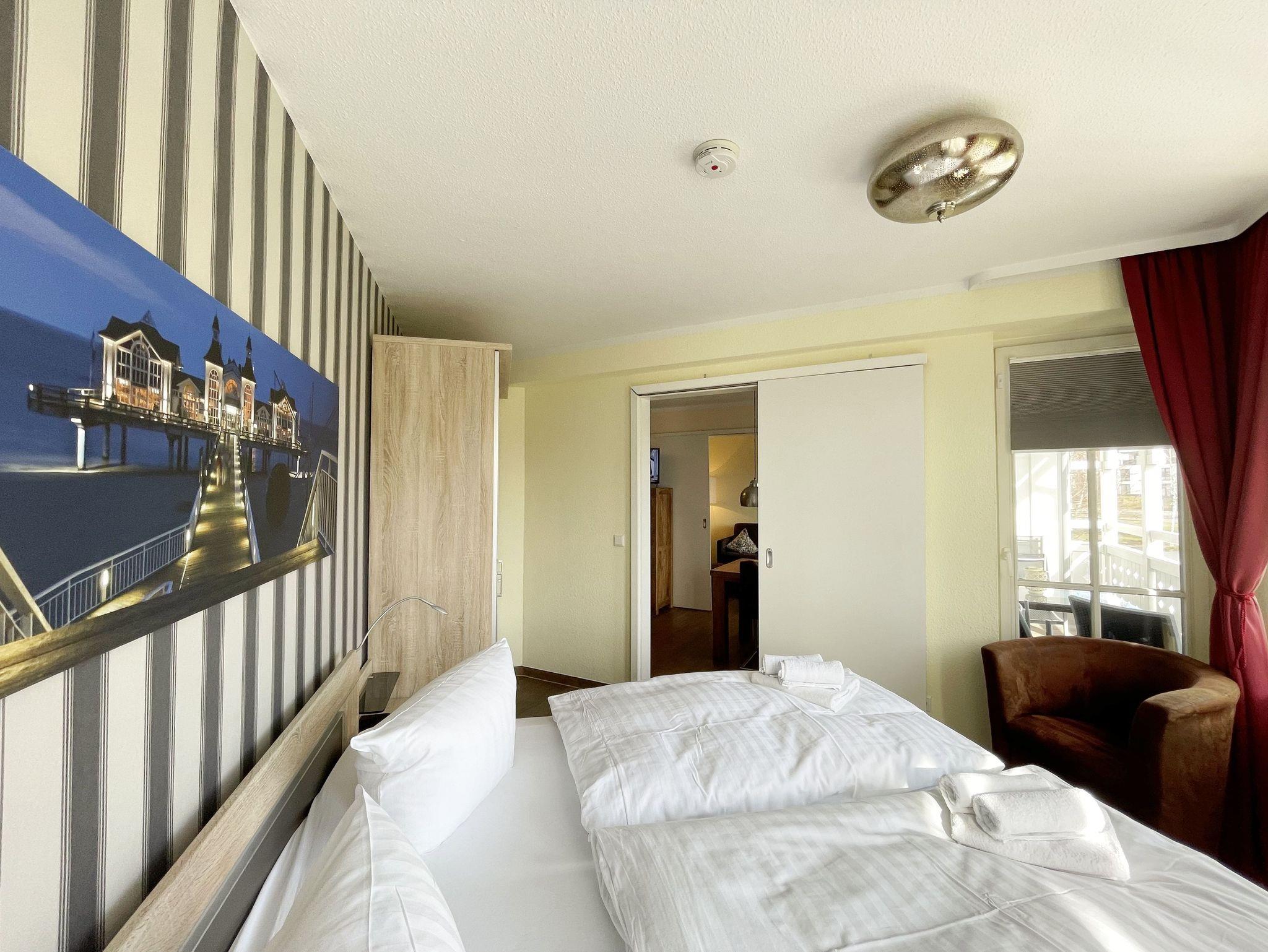 Die gemütlich eingerichtete Nichtraucherwohnung befindet sich in der 1. Etage des Hauses Südperd im Seepark Sellin. Durch die ca. 52 qm große Wohnfläche bietet Sie ausreichend Platz für max. 2 Personen. Der Wohn-/ Essbereich ist mit Schiebetüren voneinander abtrennbar. Der Essbereich verfügt über eine Einbauküche mit Induktionsceranfeld, Spüle, großen Kühl-und Gefrierschrank, Spülmaschine, Mikrowelle, Backofen, Kaffeemaschine, Toaster, Wasserkocher sowie diversen Küchenutensilien. Angrenzend haben Sie einen hellen und gemütlichen Essbereich, der nicht nur für die Mahlzeiten zum Verweilen einlädt. Zusätzlich haben Sie eine Leselampe, ein Highboard mit Smart-TV und Mini-Stereo-Anlage. Ein 2. TV-Flachbild (40?) steht im Wohnbereich zur Verfügung, ebenso ein Blu-Ray-Player. Im Wohnbereich passt sich eine Couch, 1 Sessel, ein Couchtisch sowie eine Anrichte dem Raum an. Das geräumige Schlafzimmer bietet Ihnen ein Doppelbett (2 x 0,90 m x 2,00 m), verstellbare Lattenroste, Nachtischkonsolen und Kleiderschrank. Vom Schlaf-/Ess- & Wohnbereich können Sie den bestuhlten Balkon (Südosten) erreichen. Das Badezimmer ist in 2 Räume aufgeteilt, wo sich in einem der Räume eine ebenerdige Glasdusche sowie ein Waschtisch mit Fön sowie eine Waschmaschine befindet und in einem weiteren Raum das WC mit kleinem Waschbecken. Beide Badezimmer sind gefliest. Alle anderen Räumlichkeiten sind mit einem Vinylboden verlegt worden. Ein eigener PKW-Stellplatz (43) steht Ihnen in der Tiefgarage (Höhe 2,00m) zur Verfügung sowie auch eine Fahrradabstellmöglichkeit. Auch im Urlaub brauchen Sie in Ihrer Wohnung nicht auf einen Internetanschluss (WLAN) zu verzichten. Dieser ist für Sie inklusive!!! Für unsere kleinen Gäste ist 1x Kinderreisebett mit zusätzlicher Matratze (ohne Bettinlett) inklusive. 2 kleine Hunde oder 1 Kniehoher Hund (keine Katzen) sind gegen eine Gebühr gern gesehene Gäste in der Wohnung. Die Erstausstattung eines Wäschepaketes (komplette Bettwäsche, 1 Duschhandtuch, 2 kleine Handtücher) können Sie bis 14 Tage vor Anreise gegen einen Aufpreis dazu buchen oder durch eigene ergänzen. Ab 2 gebuchten Paketen erhalten Sie einmalig 1 Geschirrhandtuch und 1 Duschvorleger hinzu.