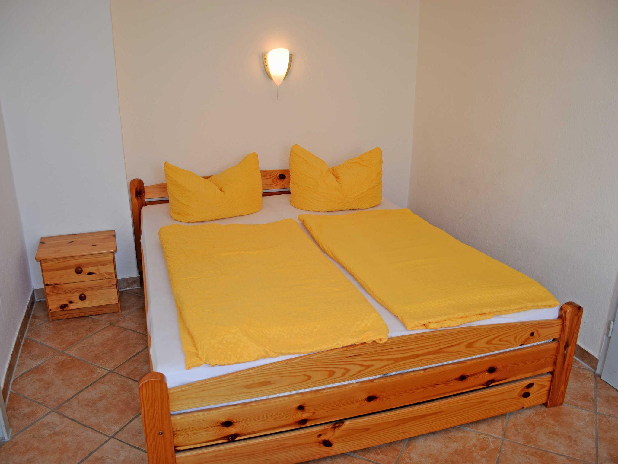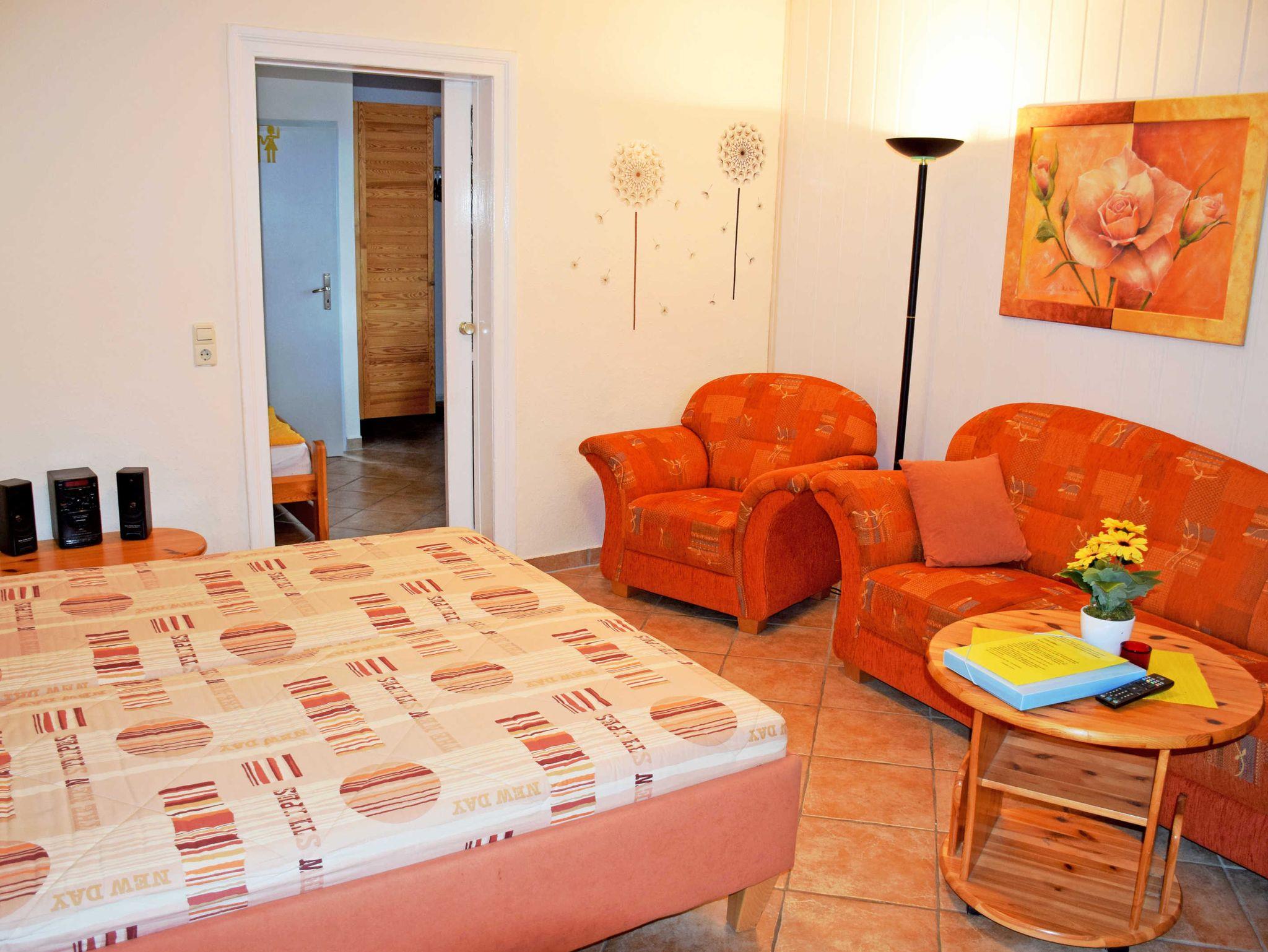 Diese im Untergeschoss des Haupthauses liegende Ferienwohnung (42 qm) ist modern und freundlich eingerichtet und verfügt über einen separaten Wohnungseingang. Sie bietet Platz für vier Gäste, ein kleines Kinderreisebett kann auf Wunsch hier zusätzlich aufgestellt werden. Im Wohnraum steht ein bequemes Doppelbett mit Nachttischen und Leselampen, eine Sitzecke mit Tisch und Sessel sowie Flachbild-TV und Radio. Im Schlafzimmer steht ein weiteres Doppelbett. Durch die Verwendung von Holz und warmen Farben ist es uns gelungen, hier ein angenehmes Ambiente zu schaffen in dem auch Sie sich wohlfühlen werden.