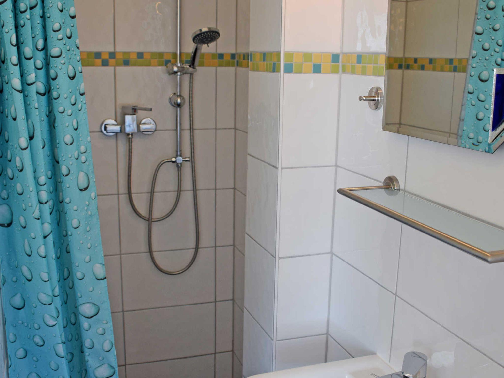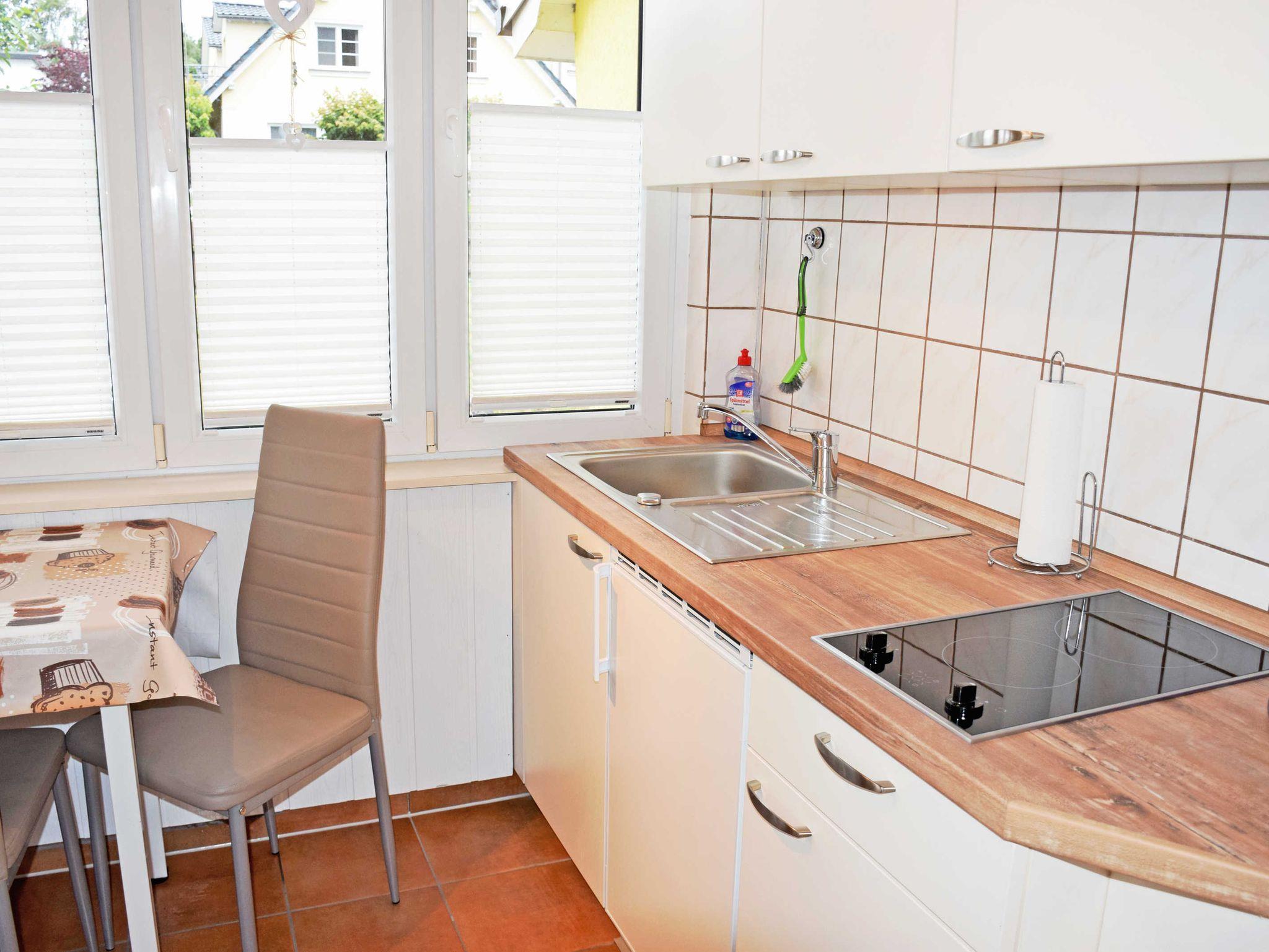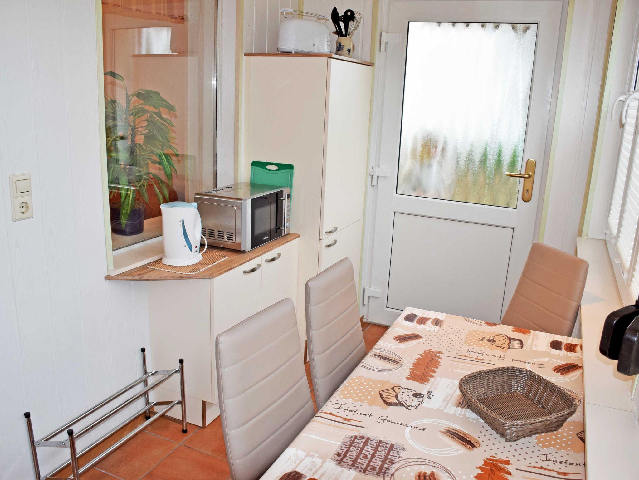Selbstverständlich hat diese Ferienwohnung ein Bad mit Dusche und WC und sowie eine kleine Küche mit Esstisch und Stühlen. Zur Küchenausstattung gehören Herd, Spüle, Kühlschrank, Kaffeemaschine, Wasserkocher und Toaster. Zu dieser Ferienwohnung gehört auch eine mit bequemen Gartenmöbeln ausgestatte Terrasse. Hier können Sie laue Sommerabende genießen oder mit dem von uns bereitgestellten Grill einen gemütlichen Grillabend veranstalten.