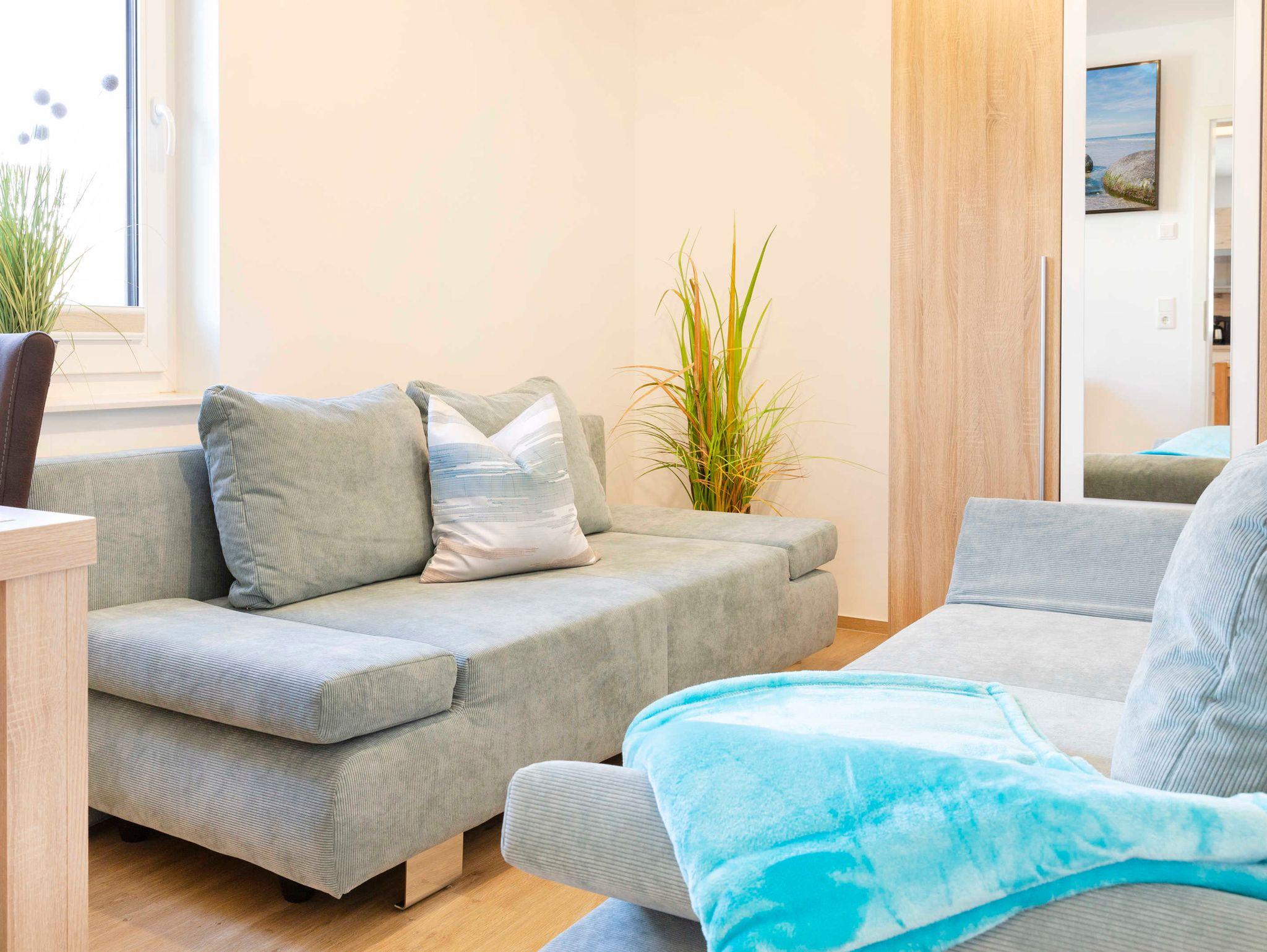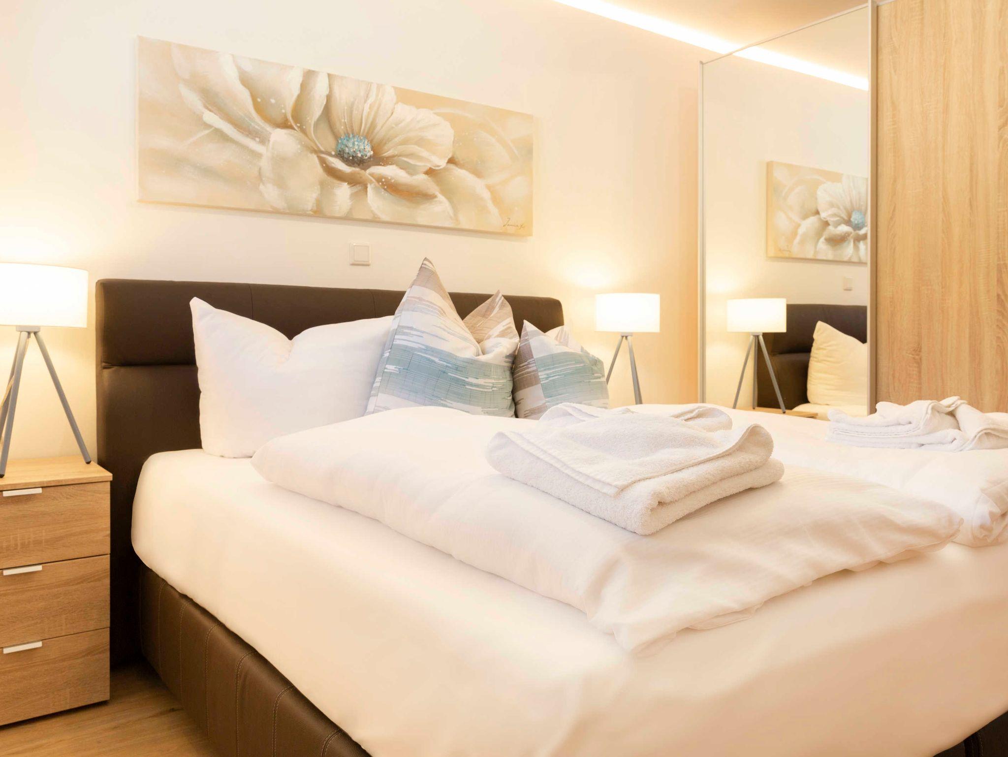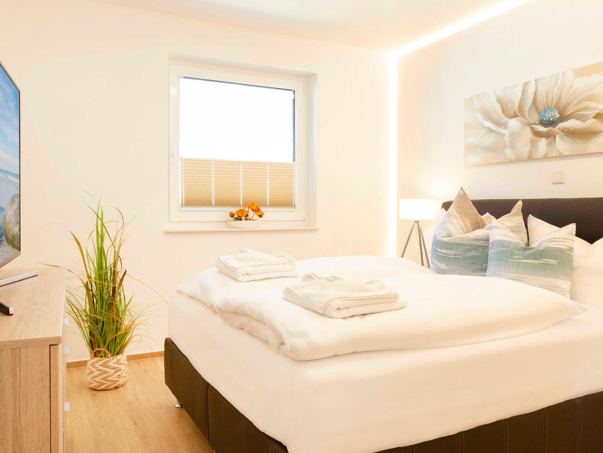 In dem anderen Schlafzimmer befindet sich eine hochwertige Schlaufcouch, welche bis 1,46 x 2,07 m ausziehbar ist. Die Schlafcouch hat einen Lattenrost und Federkernmatratze mit aufliegender Komfortschaummatratze und kann tagsüber als bequemes Sofa genutzt werden. Als weitere Schlafmöglichkeit steht Ihnen ein Boxspringbett (0,90m x 2,00m) zur Verfügung. Alle Schlafzimmer verfügen über einen 55-Zoll Flachbild-Smart-TV (4K).