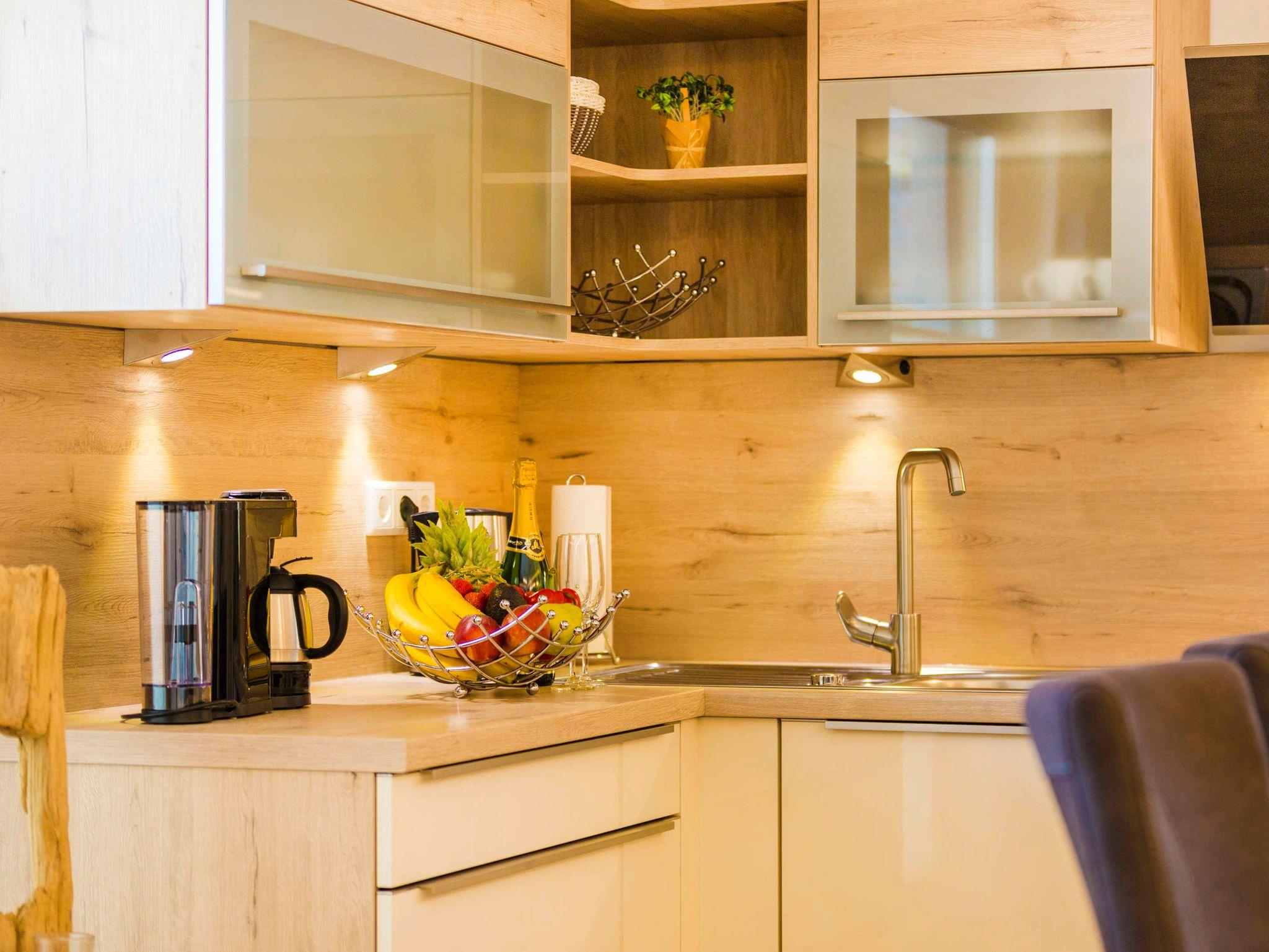 Die perfekt geplante Markenküche ist mit einem großen Kühlschrank mit Gefrierteil, einem Geschirrspüler, einem Backofen, einem Cerankochfeld sowie einer Mikrowelle ausgestattet.
