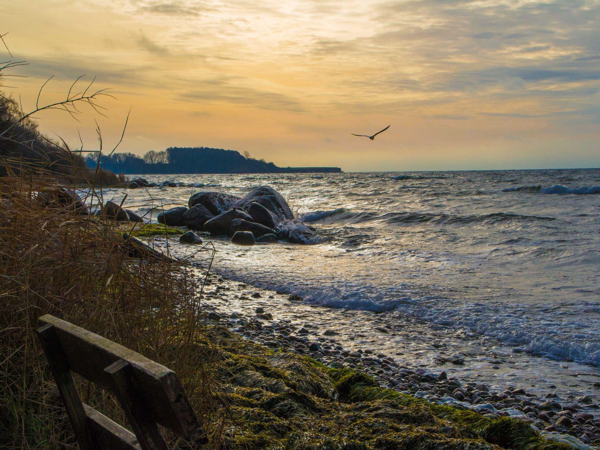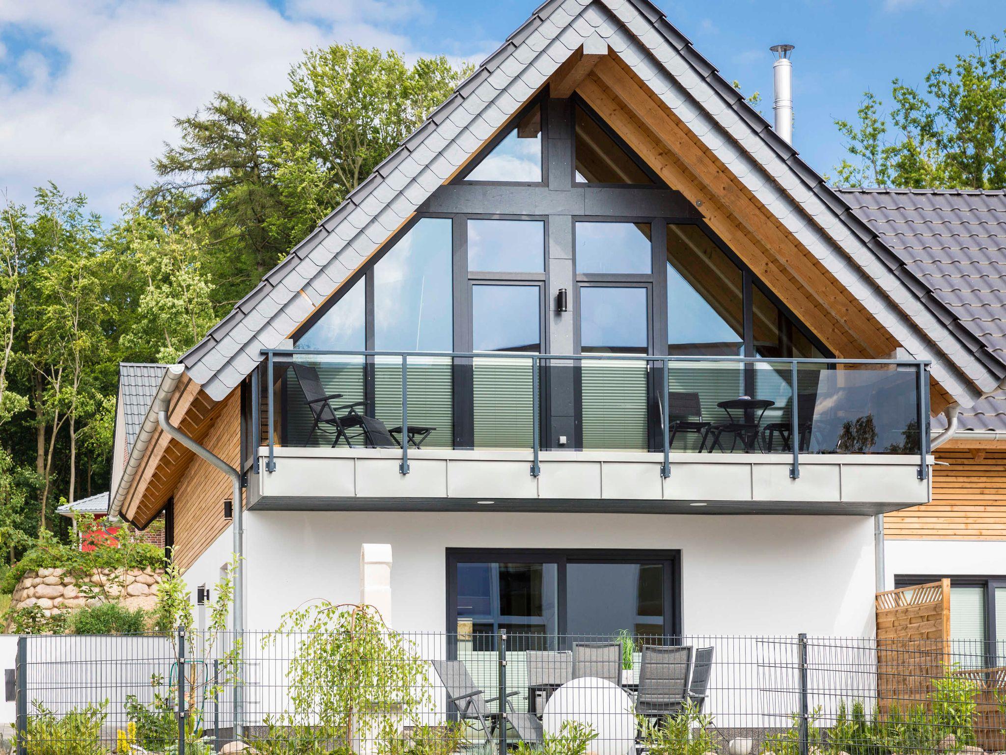 Die Ferienwohnung Möwenglück im Obergeschoss ist durch ihre drei Glasgiebel lichtdurchflutet und beeindruckt durch ihre großzügige, offene Bauweise. Sie ist über eine Außentreppe erreichbar. Die 3 Balkone sind nach Osten, Süden und Westen ausgerichtet.