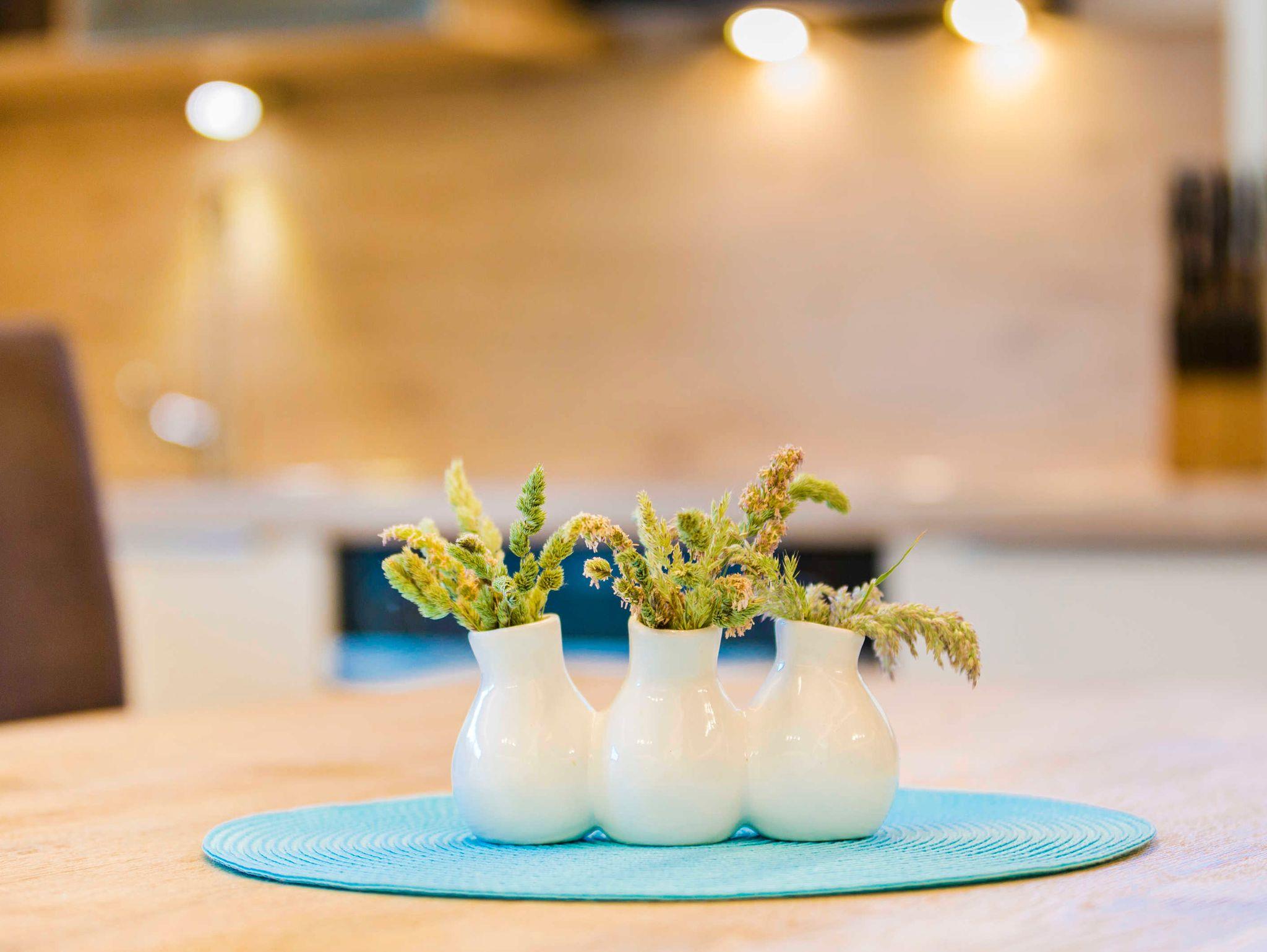 Ebenso erleichtern Ihnen Kaffeemaschine, Wasserkocher, Eierkocher, Toaster, elektrischer Milchaufschäumer, elektrische Zitruspresse, ein leistungsfähiger Standmixer auch für Smoothies sowie Hand- und Stabmixer Ihre Küchenarbeit.