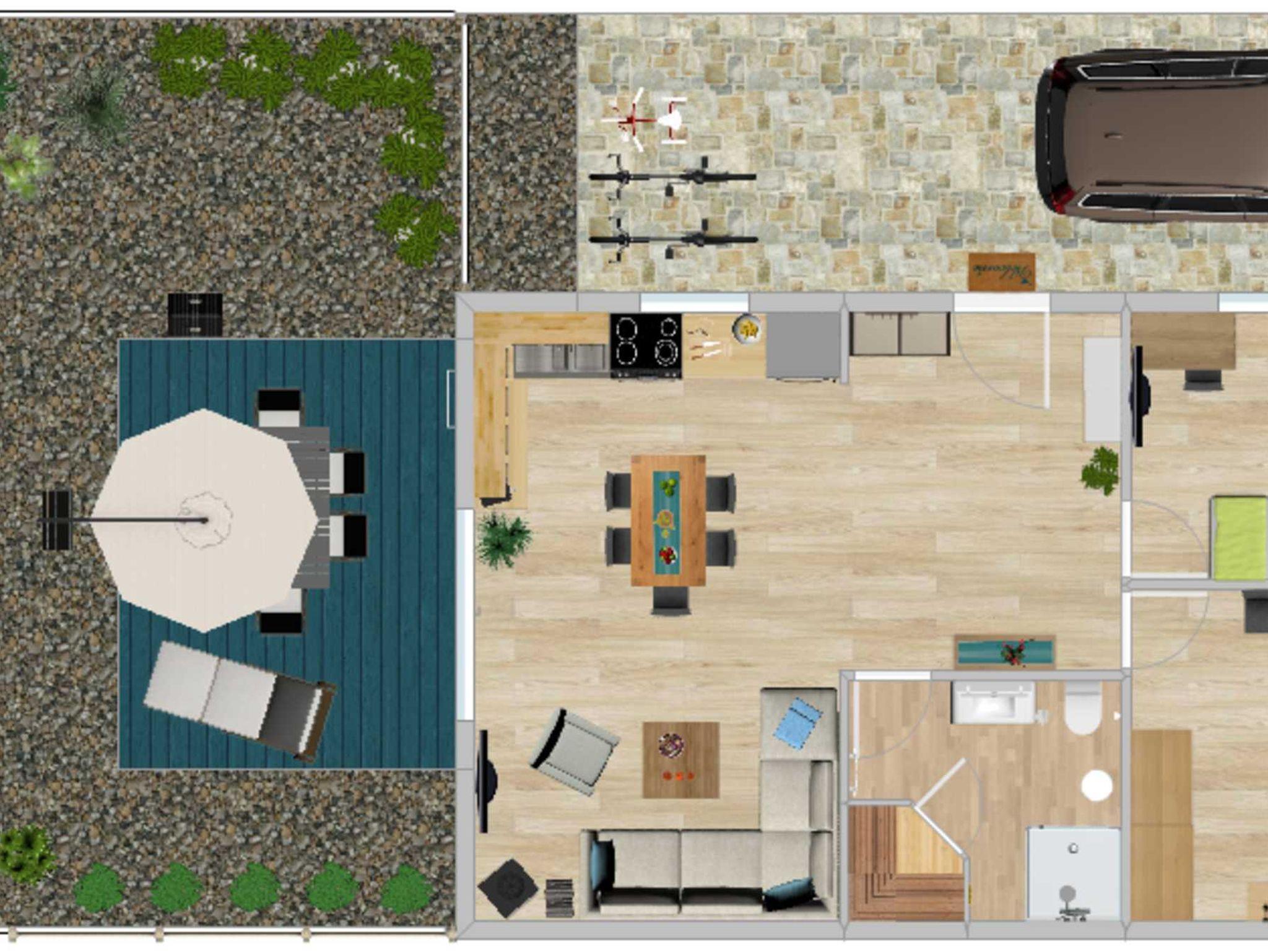 Auf der 12 m² großen Westterrasse finden Sie einen Sonnenschirm und massiven Grillkamin sowie bequeme verstellbare Hochlehnenstühle. Der umgebene Garten ist vollständig eingezäunt, sodass Sie sich keine Sorgen um Ihren vierbeinigen Freund machen müssen.