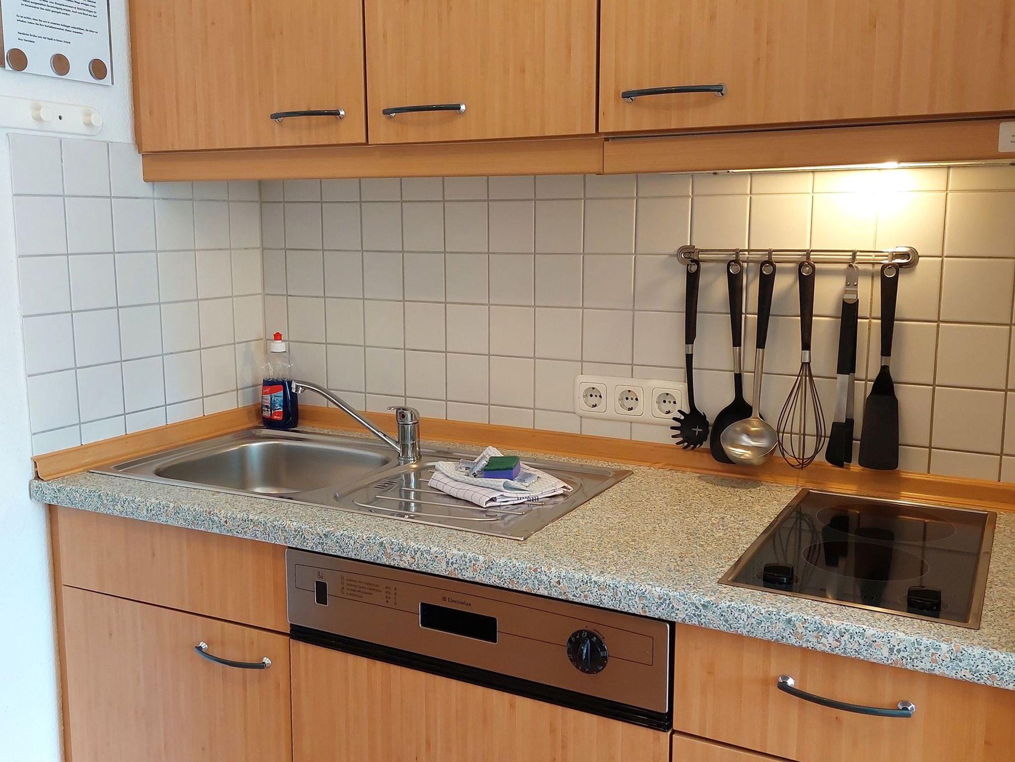 Es gibt eine Küchenzeile mit 2-Platten-Ceranfeld, Geschirrspüler, Mikrowelle (mit Aufbackfunktion) sowie einen Kühlschrank samt Gefrierfach.