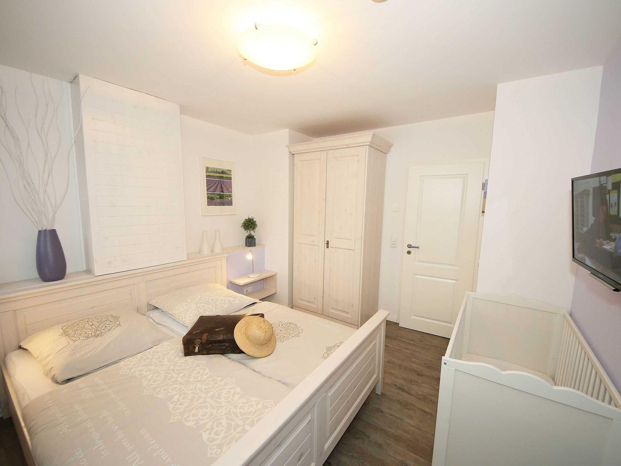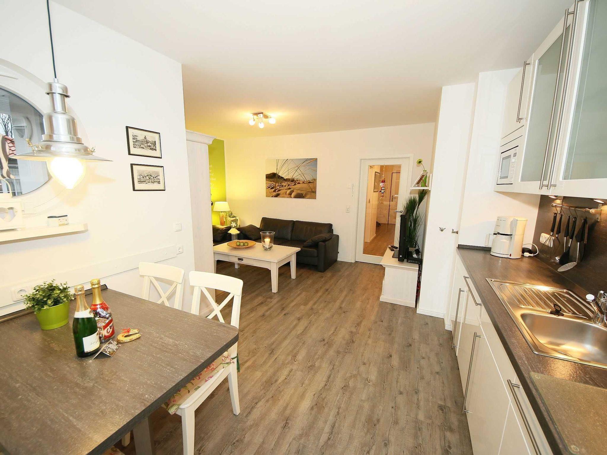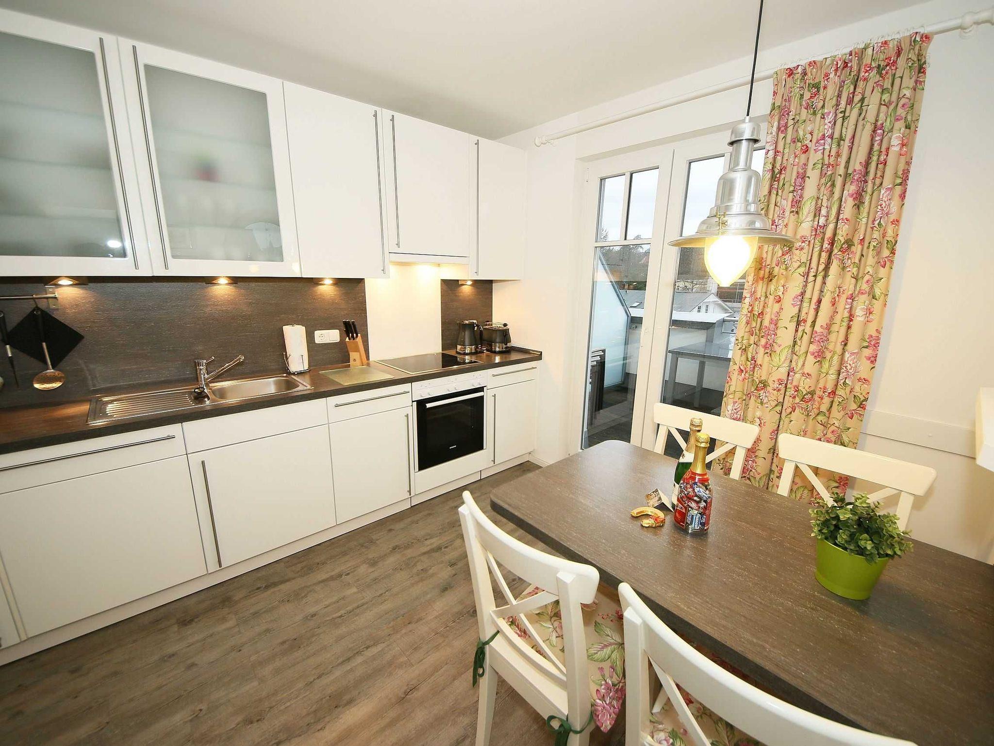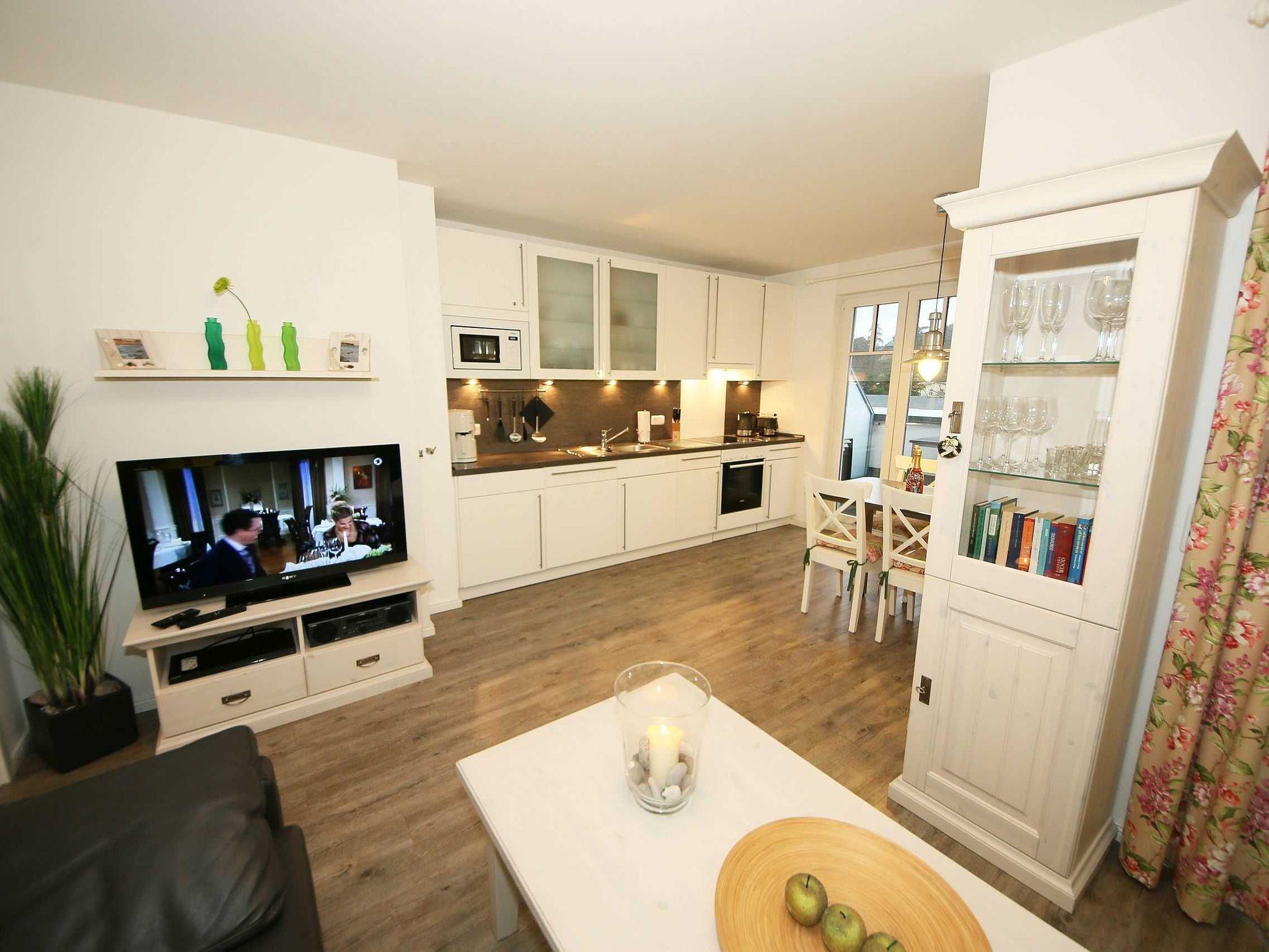 Die liebevoll im Landhausstil eingerichtete 67 qm große Nichtraucher-Wohnung befindet sich in der 3. Etage der Villa Rosa. Als Dreiraumwohnung bietet Sie Ihnen ausreichend Platz für 2 bis 4 Erwachsene und 1 Kleinkind (bis 3 Jahre im Kinderreisebett). Die hochwertige Ausstattung der Wohnung garantiert einen unbeschwerten Urlaub. Die großzügige Küchenzeile bietet Ihnen eine Geschirrspülmaschine, Backofen mit Ceranfeld, Mikrowelle, Kühlschrank mit Gefrierfach, Kaffeemaschine, Senseo Pad-Maschine, Toaster, Wasserkocher, Eierkocher, Mixer, diverse Küchenhelfer sowie ein gemütlicher Essplatz mit 4 Stühlen. Bei schönem Wetter können Sie zusätzlich die Dachterrasse (Süd/West und Nord/West) zu einem Essplatz umfunktionieren. Diese wird durch einen eigenen Strandkorb und eingeschränktem Meerblick abgerundet. Der angrenzende und geschmackvoll eingerichtete Wohnbereich mit 2 Ledercouchen und Couchtisch, Leselampe, Sideboard mit 40 Full-HD Smart-TV mit Blu-Ray-Player, Musikanlage mit DAB-Radio sowie Glasvitrine runden die Gemütlichkeit ab. Auch auf einen Internetzugang (WLAN) brauchen Sie nicht verzichten. Dieser ist für Sie inklusive. Alle Räumlichkeiten wurden mit einem hochwertigen Vinylboden, Fliesen sowie Fußbodenheizung versehen. Im großen Schlafzimmer mit Doppelbett (1,80 m x 2,00 m), 7-Zonen-Kaltschaummatratzen, verstellbaren Lattenrosten, Nachttischablagen und Kleiderschrank finden Sie zusätzlich ein TV-Gerät. Von hier gelangen Sie auch auf die Dachterrasse. Das kleine Schlafzimmer ist mit einem Kojenbett (ausziehbar bis zu einer Liegefläche von 1,60 m x 2,00 m), 7-Zonen-Kaltschaummatratze, Nachttischablage und Kleiderschrank ausgestattet. Für einen ruhigen Schlaf dienen die Verdunklungsmöglichkeiten. Der Mittelpunkt des Bades ist ein moderner Waschplatz, ein WC, eine ebenerdige Dusche (0,90m x 1,40m), Fön und eine Waschmaschine (inklusive). Ein eigener Tiefgaragenparkplatz (Nr.16, Einfahrtshöhe 2,00m) steht Ihnen inklusive zur Verfügung. Im Untergeschoss finden Sie zudem einen großen abschließbaren Fahrradraum sowie einen Extraraum für Kinder- und Bollerwagen. Der Fahrstuhl bringt Sie bequem zur Wohnung. Im Erdgeschoss der Villa Rosa finden Sie einen kleinen kostenpflichtigen Spa-Bereich mit Sauna, Dampfsauna, Dusche und Ruheraum. Ab einem Aufenthalt von 5 Nächten, sind 2 Saunamarken in der Zeit vom 01. November bis 30. April für Sie inklusive. Die Wertmarken können Sie auf Nachfrage während Ihres Urlaubes in der Zimmervermittlung erwerben. Der kleine Garten hinter dem Haus steht allen Gästen zur Verfügung. Hier gibt es einen Grillplatz und einen kleinen Spielplatz. 1x stabiles Kinderbett (1,20 m x 0,60 m, ohne Bettinlett) und 1x Kinderhochstuhl sind für unsere kleinen Gäste inklusive. Haustiere sind nicht erlaubt. Die Erstausstattung eines Wäschepaketes (komplette Bettwäsche, 1 Duschhandtuch, 1 kleines Handtuch) können Sie bis 14 Tage vor Anreise gegen einen Aufpreis dazu buchen oder durch eigene ergänzen. Ab 2 gebuchten Paketen erhalten Sie einmalig 1 Geschirrhandtuch und 1 Duschvorleger hinzu.