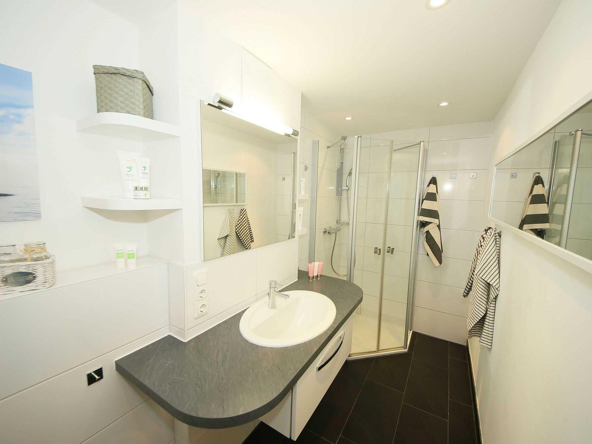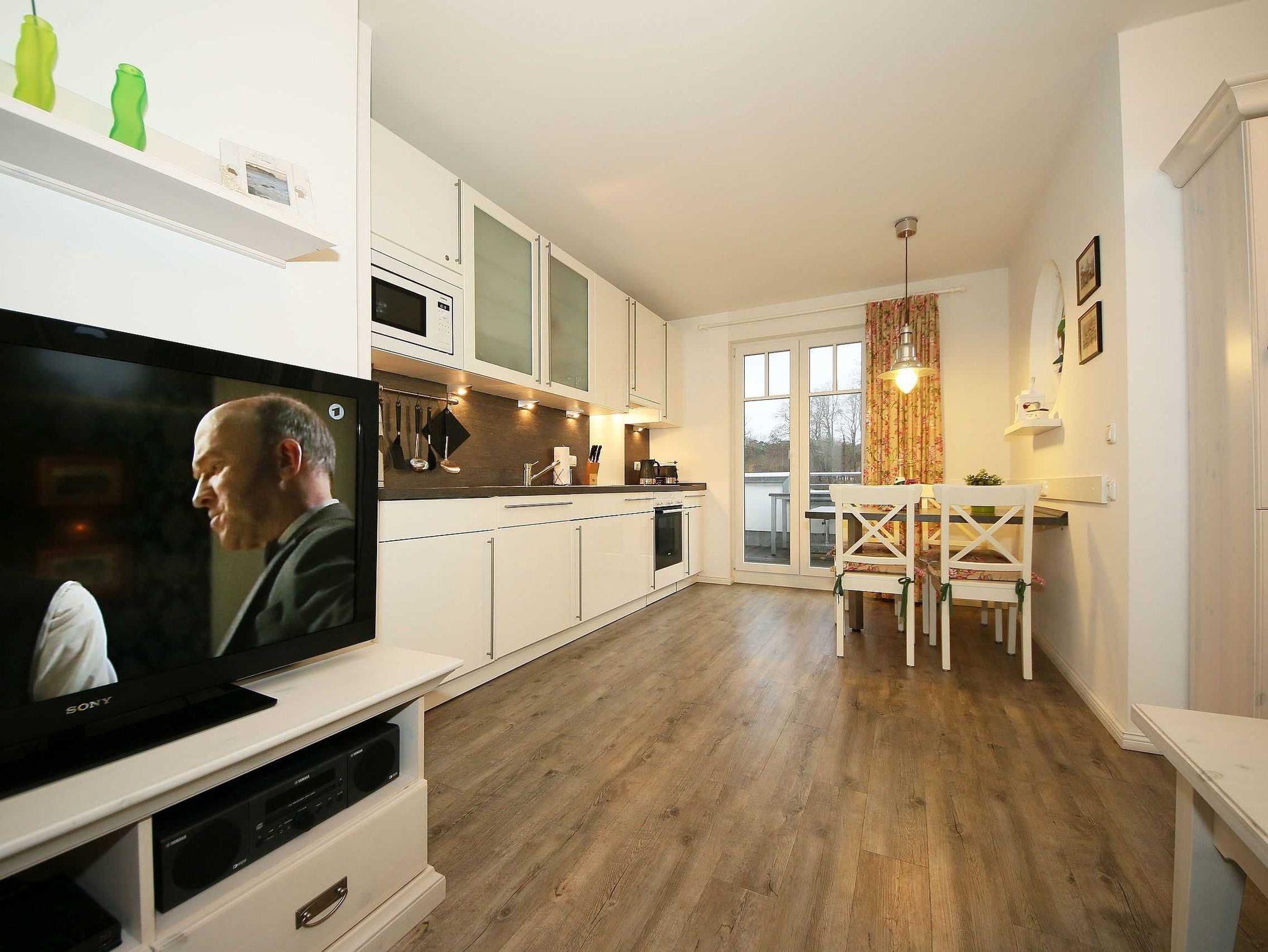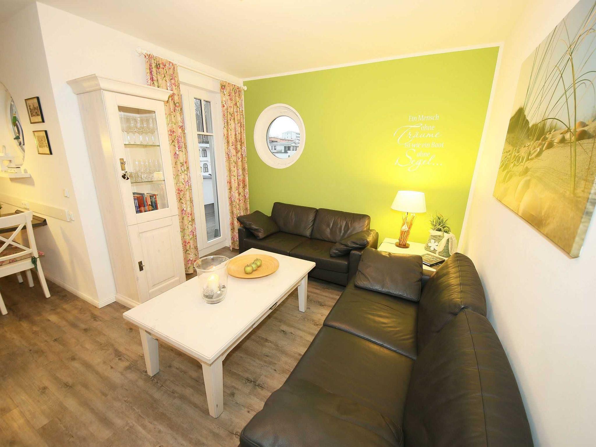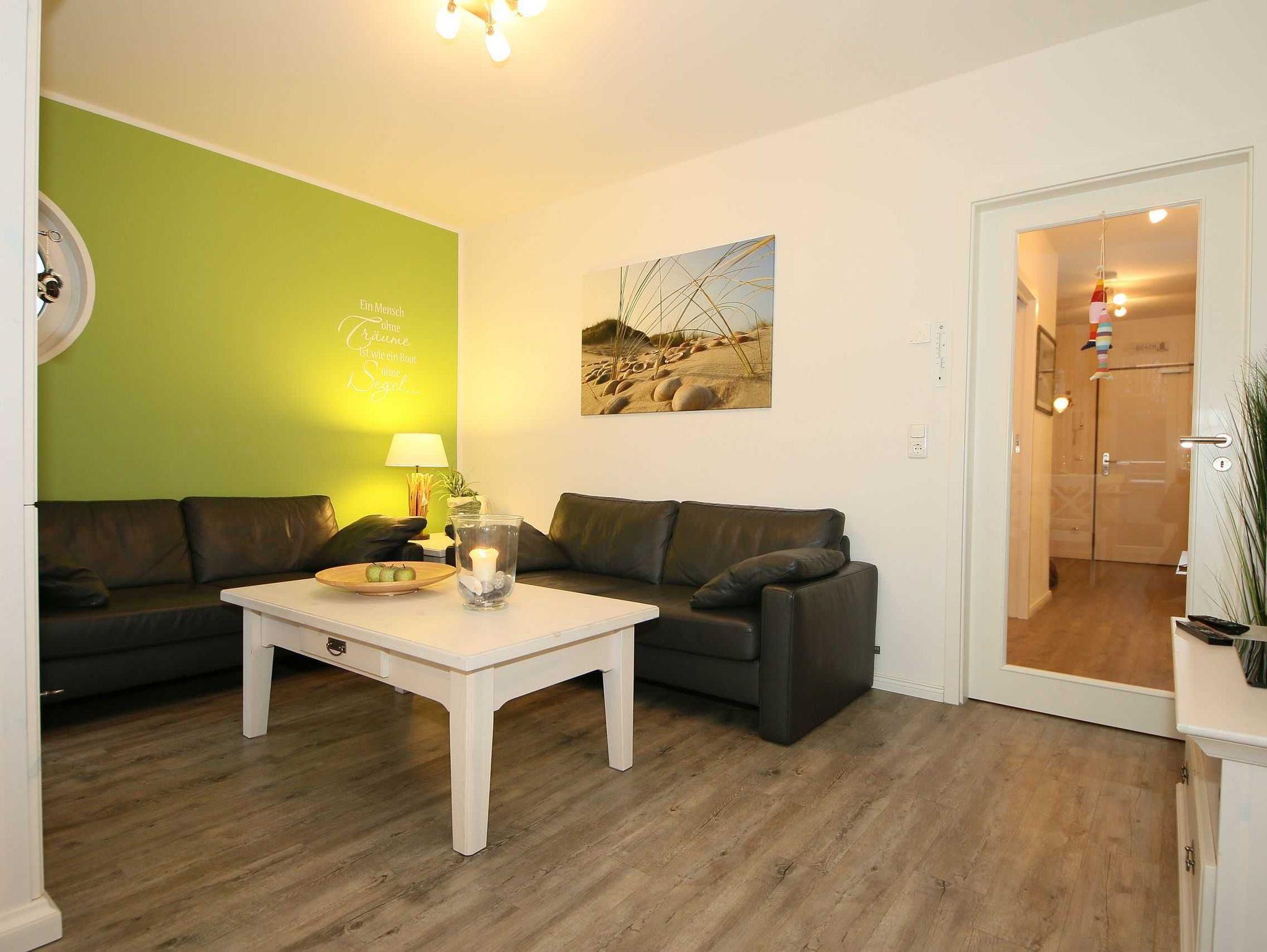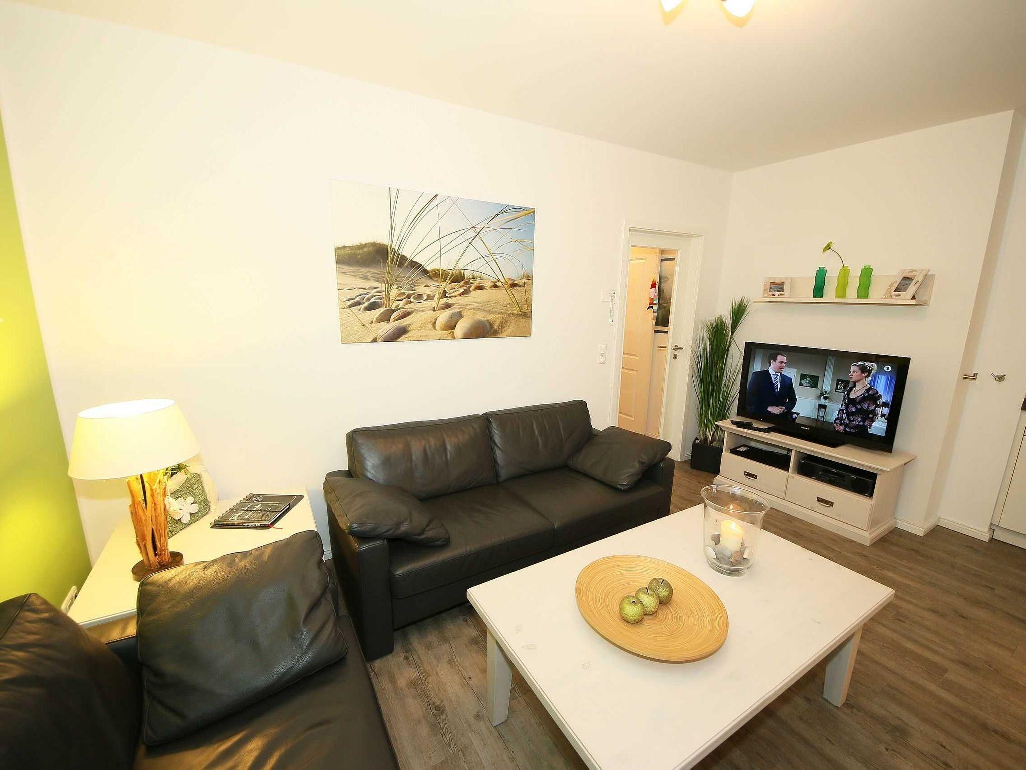 Die liebevoll im Landhausstil eingerichtete 67 qm große Nichtraucher-Wohnung befindet sich in der 3. Etage der Villa Rosa. Als Dreiraumwohnung bietet Sie Ihnen ausreichend Platz für 2 bis 4 Erwachsene und 1 Kleinkind (bis 3 Jahre im Kinderreisebett). Die hochwertige Ausstattung der Wohnung garantiert einen unbeschwerten Urlaub. Die großzügige Küchenzeile bietet Ihnen eine Geschirrspülmaschine, Backofen mit Ceranfeld, Mikrowelle, Kühlschrank mit Gefrierfach, Kaffeemaschine, Senseo Pad-Maschine, Toaster, Wasserkocher, Eierkocher, Mixer, diverse Küchenhelfer sowie ein gemütlicher Essplatz mit 4 Stühlen. Bei schönem Wetter können Sie zusätzlich die Dachterrasse (Süd/West und Nord/West) zu einem Essplatz umfunktionieren. Diese wird durch einen eigenen Strandkorb und eingeschränktem Meerblick abgerundet. Der angrenzende und geschmackvoll eingerichtete Wohnbereich mit 2 Ledercouchen und Couchtisch, Leselampe, Sideboard mit 40 Full-HD Smart-TV mit Blu-Ray-Player, Musikanlage mit DAB-Radio sowie Glasvitrine runden die Gemütlichkeit ab. Auch auf einen Internetzugang (WLAN) brauchen Sie nicht verzichten. Dieser ist für Sie inklusive. Alle Räumlichkeiten wurden mit einem hochwertigen Vinylboden, Fliesen sowie Fußbodenheizung versehen. Im großen Schlafzimmer mit Doppelbett (1,80 m x 2,00 m), 7-Zonen-Kaltschaummatratzen, verstellbaren Lattenrosten, Nachttischablagen und Kleiderschrank finden Sie zusätzlich ein TV-Gerät. Von hier gelangen Sie auch auf die Dachterrasse. Das kleine Schlafzimmer ist mit einem Kojenbett (ausziehbar bis zu einer Liegefläche von 1,60 m x 2,00 m), 7-Zonen-Kaltschaummatratze, Nachttischablage und Kleiderschrank ausgestattet. Für einen ruhigen Schlaf dienen die Verdunklungsmöglichkeiten. Der Mittelpunkt des Bades ist ein moderner Waschplatz, ein WC, eine ebenerdige Dusche (0,90m x 1,40m), Fön und eine Waschmaschine (inklusive). Ein eigener Tiefgaragenparkplatz (Nr.16, Einfahrtshöhe 2,00m) steht Ihnen inklusive zur Verfügung. Im Untergeschoss finden Sie zudem einen großen abschließbaren Fahrradraum sowie einen Extraraum für Kinder- und Bollerwagen. Der Fahrstuhl bringt Sie bequem zur Wohnung. Im Erdgeschoss der Villa Rosa finden Sie einen kleinen kostenpflichtigen Spa-Bereich mit Sauna, Dampfsauna, Dusche und Ruheraum. Ab einem Aufenthalt von 5 Nächten, sind 2 Saunamarken in der Zeit vom 01. November bis 30. April für Sie inklusive. Die Wertmarken können Sie auf Nachfrage während Ihres Urlaubes in der Zimmervermittlung erwerben. Der kleine Garten hinter dem Haus steht allen Gästen zur Verfügung. Hier gibt es einen Grillplatz und einen kleinen Spielplatz. 1x stabiles Kinderbett (1,20 m x 0,60 m, ohne Bettinlett) und 1x Kinderhochstuhl sind für unsere kleinen Gäste inklusive. Haustiere sind nicht erlaubt. Die Erstausstattung eines Wäschepaketes (komplette Bettwäsche, 1 Duschhandtuch, 1 kleines Handtuch) können Sie bis 14 Tage vor Anreise gegen einen Aufpreis dazu buchen oder durch eigene ergänzen. Ab 2 gebuchten Paketen erhalten Sie einmalig 1 Geschirrhandtuch und 1 Duschvorleger hinzu.