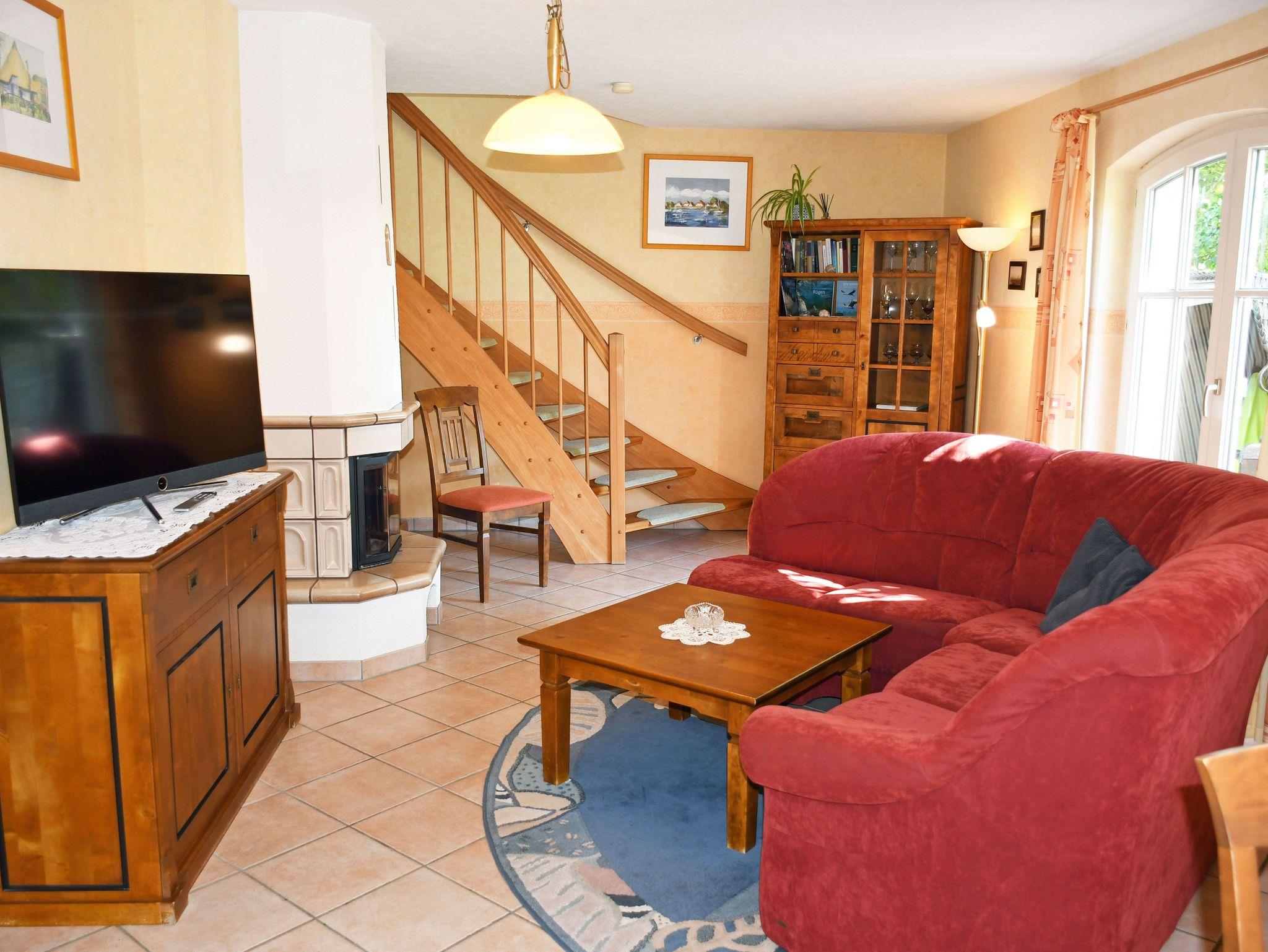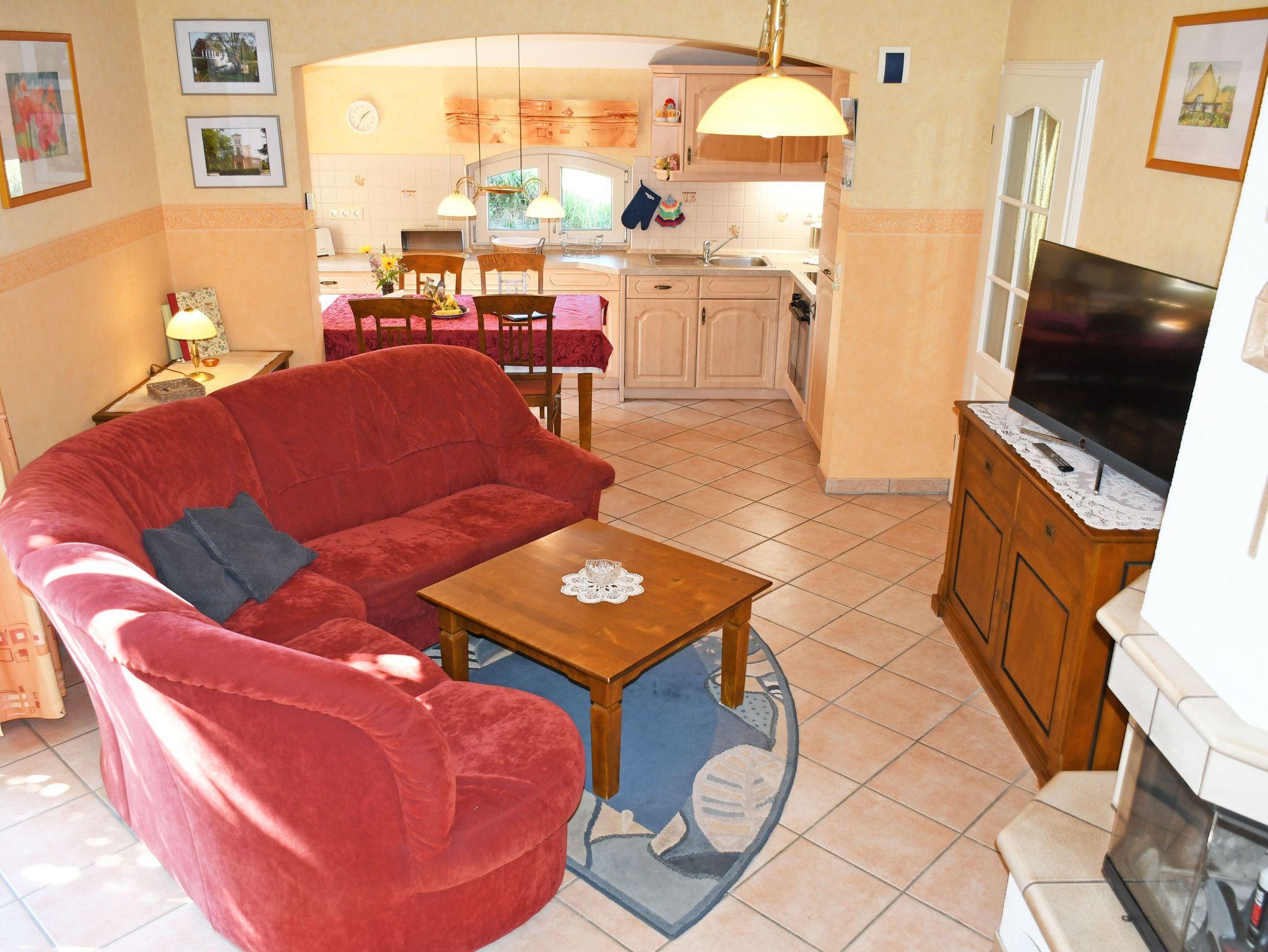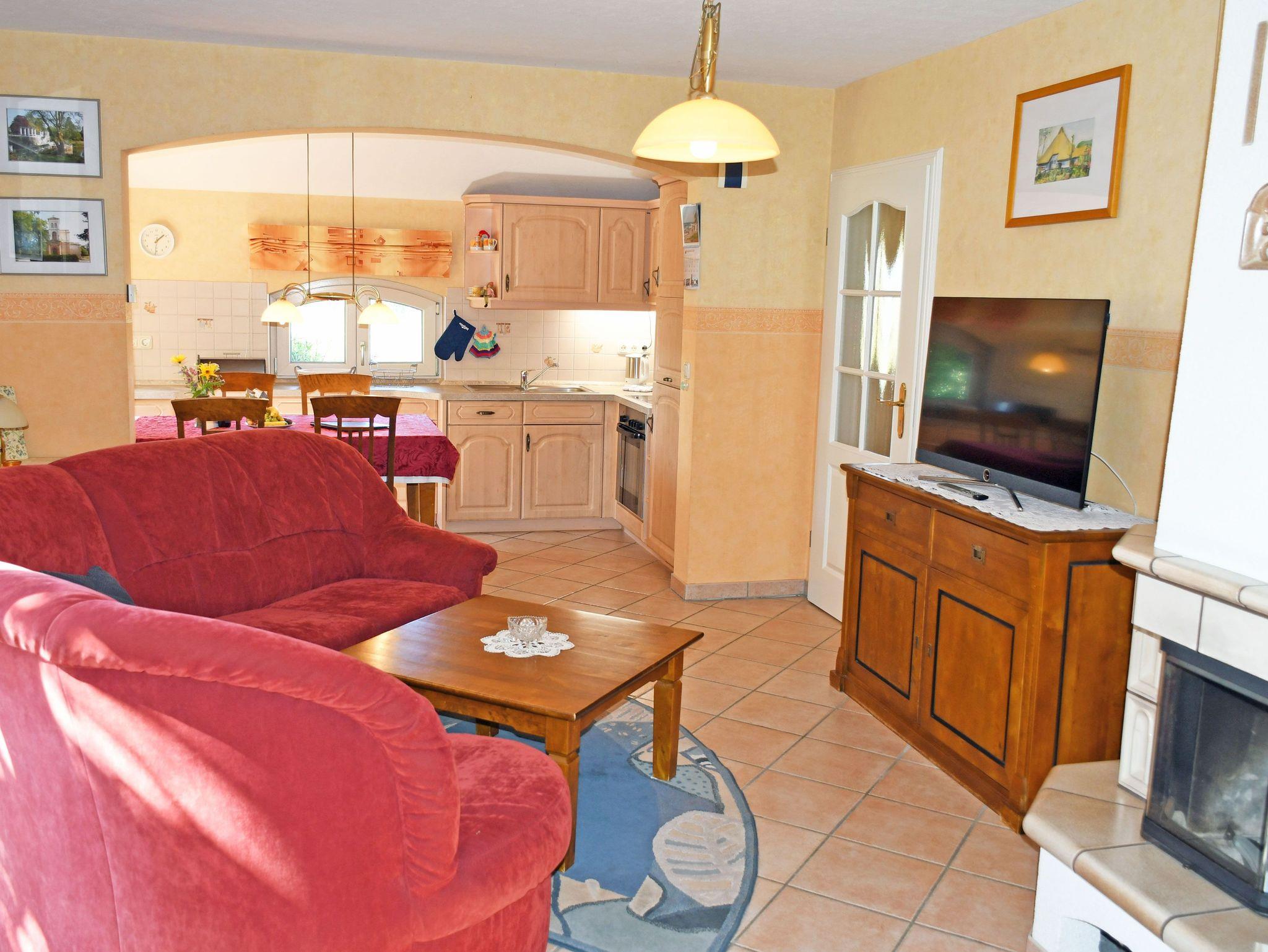 Das modern und sehr schön ausgestatte Ferienhaus (85 qm, 4 Gäste, 4 Sterne nach DTV) liegt ruhig. Es verfügt im Erdgeschoß über ein Wohnzimmer mit Flachbild-TV, Musikanlage, DVD-Player, Kachelkamin, Sitzecke, Esstisch und einer Küchenzeile mit Cerankochfld, Backofen, Geschirrspüler, Kühlschrank, Gefrierschrank und Mikrowelle.