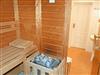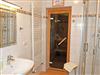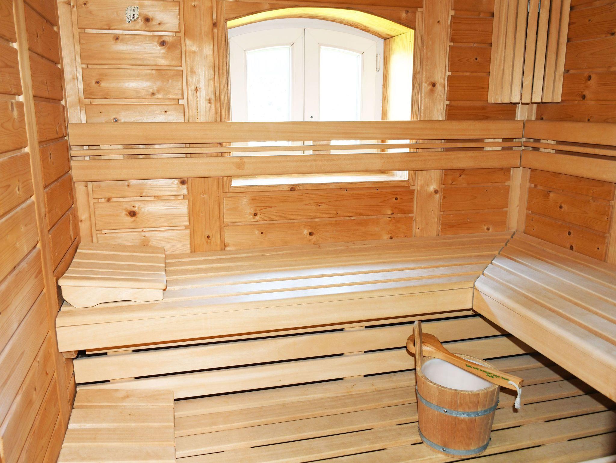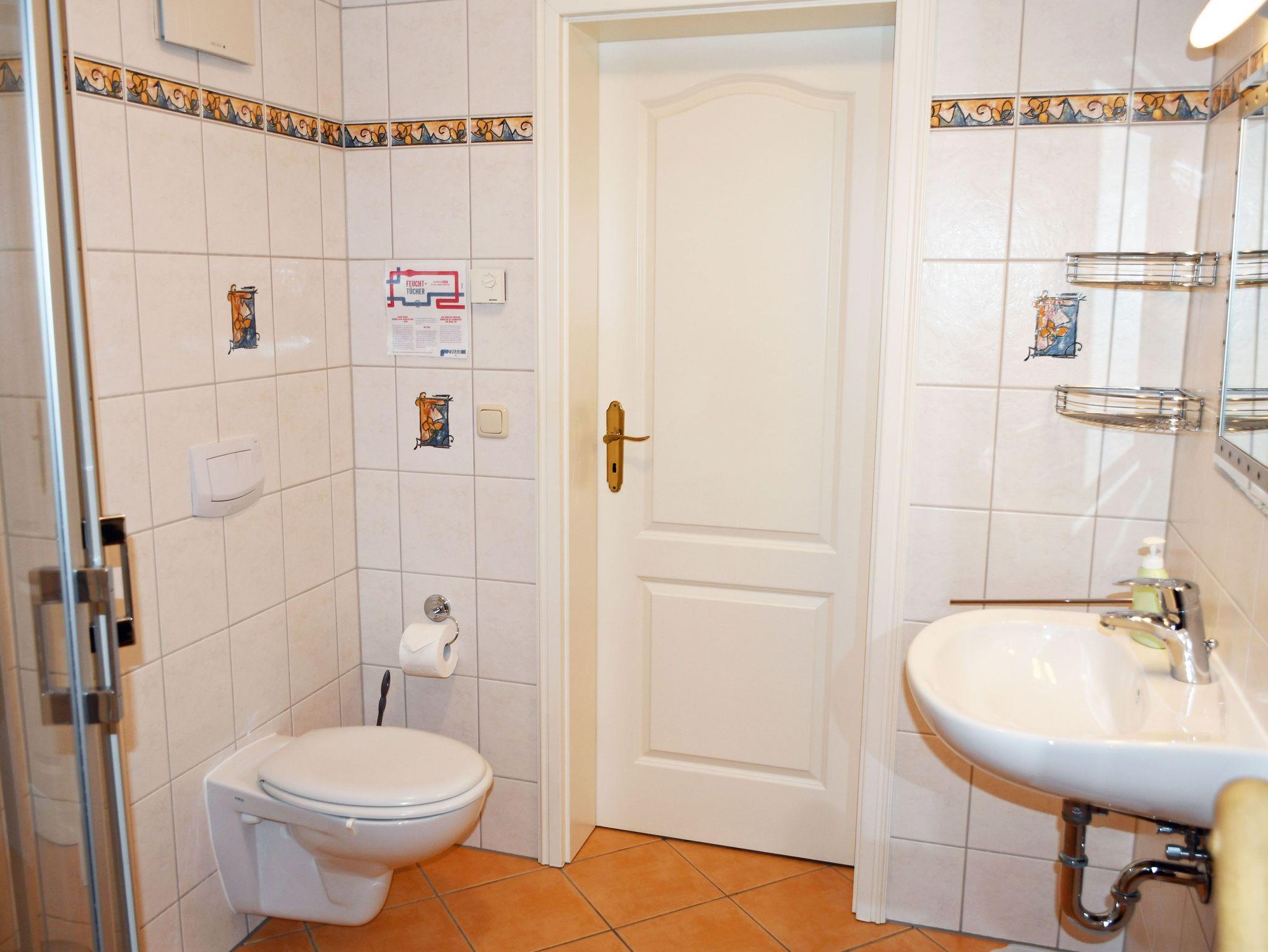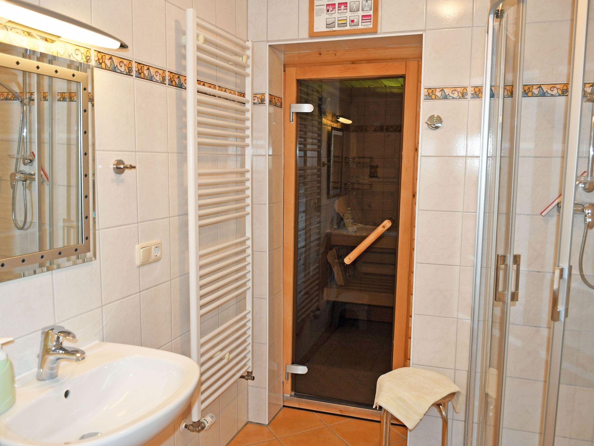 Daneben gelangt man vom Flur ins erste Bad mit Dusche und WC und der dahinterliegenden Sauna für ca. 3 Gäste.