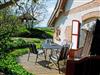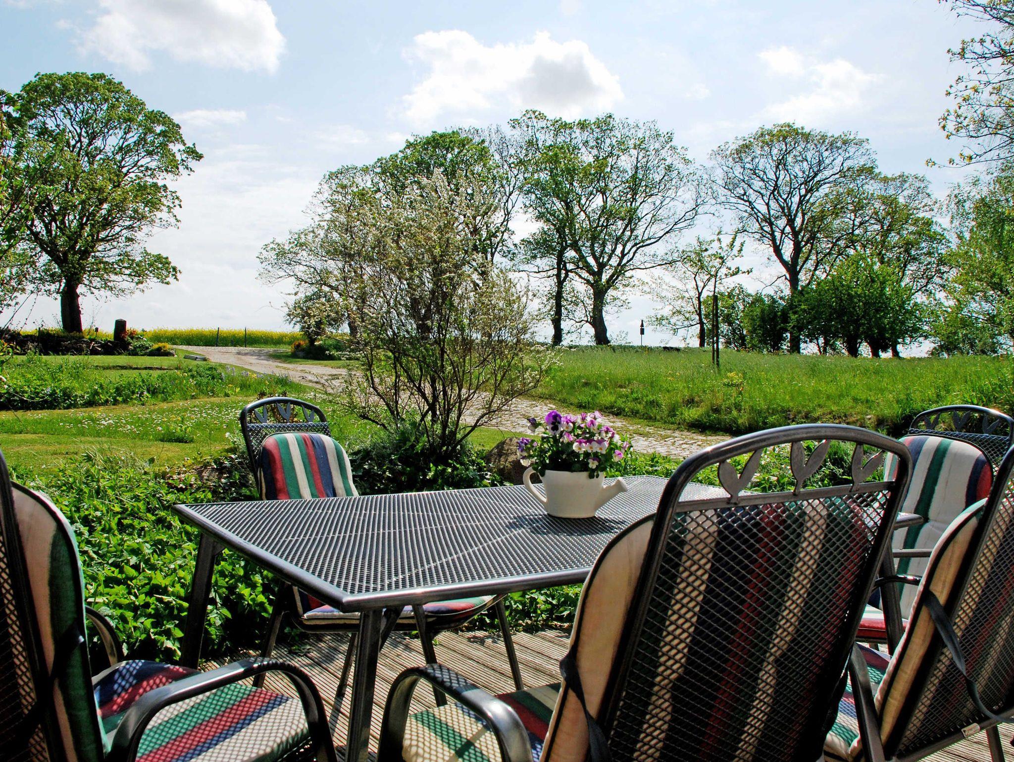 Eine Sonnenterrasse mit eigenem Strandkorb und Gartenmöbeln lädt direkt vor dem Wohnzimmer zum Verweilen ein.