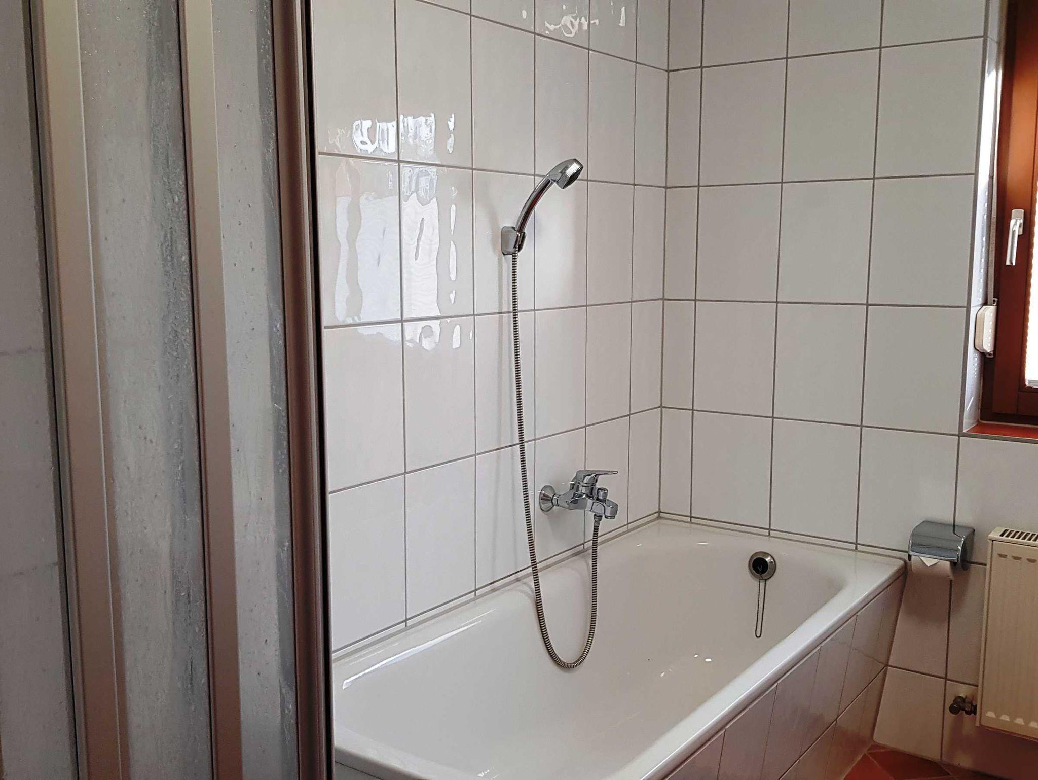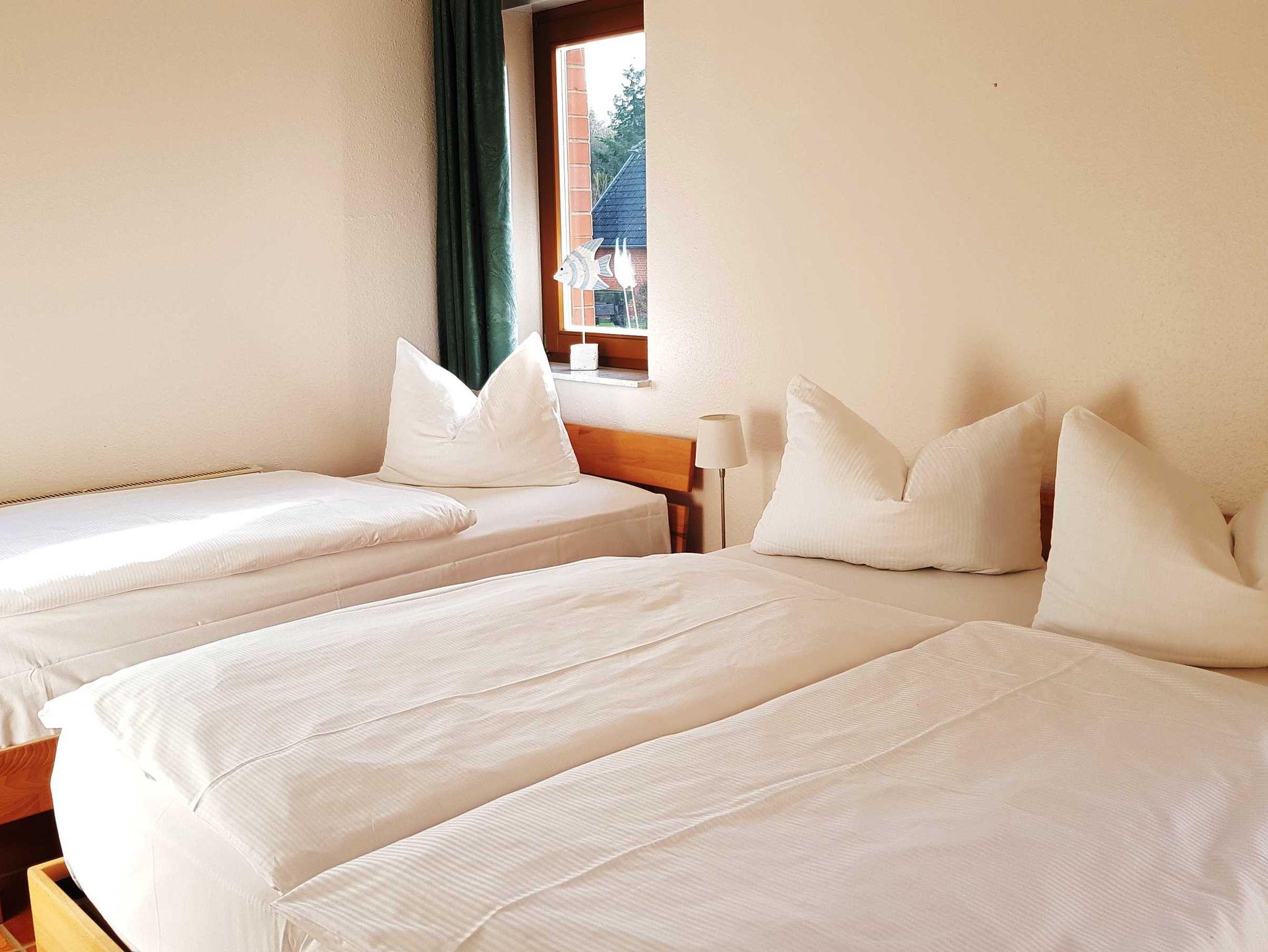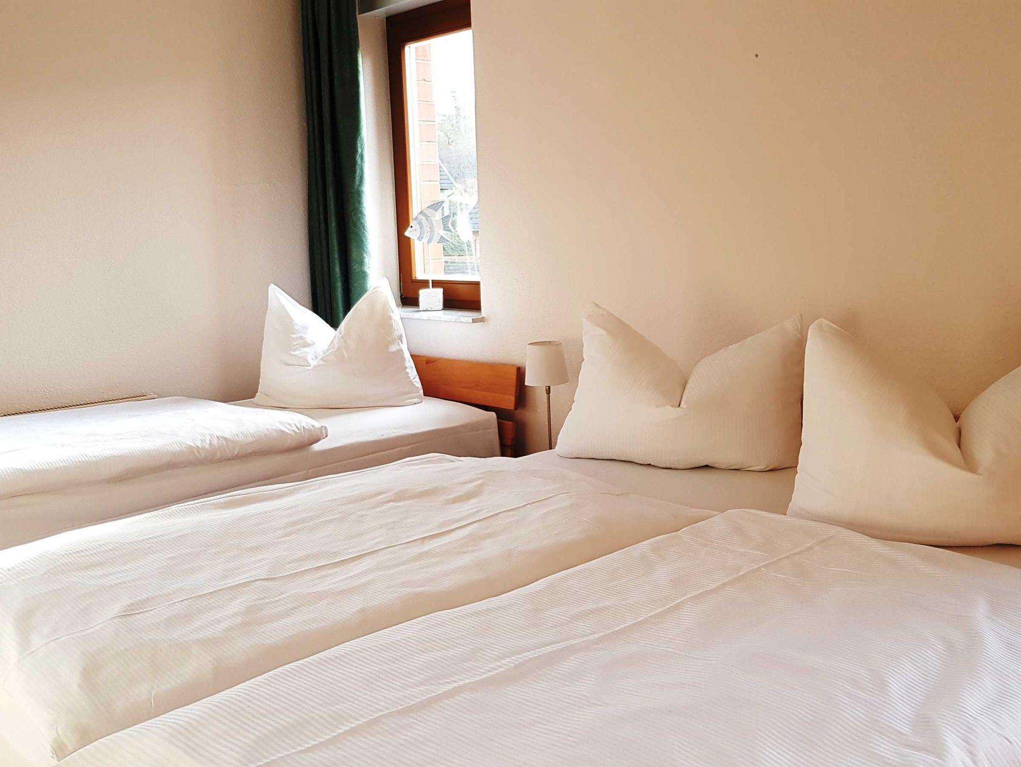 Das Schlafzimmer verfügt über ein Doppelbett (1,60m x 2,00m), ein Einzelbett (0,80m x 2,00m), Nachttischkonsolen und Kleiderschrank. Ein zweiter Kleiderschrank befindet sich im Flur. Das Tageslichtbad verfügt über Badewanne, Dusche, WC.