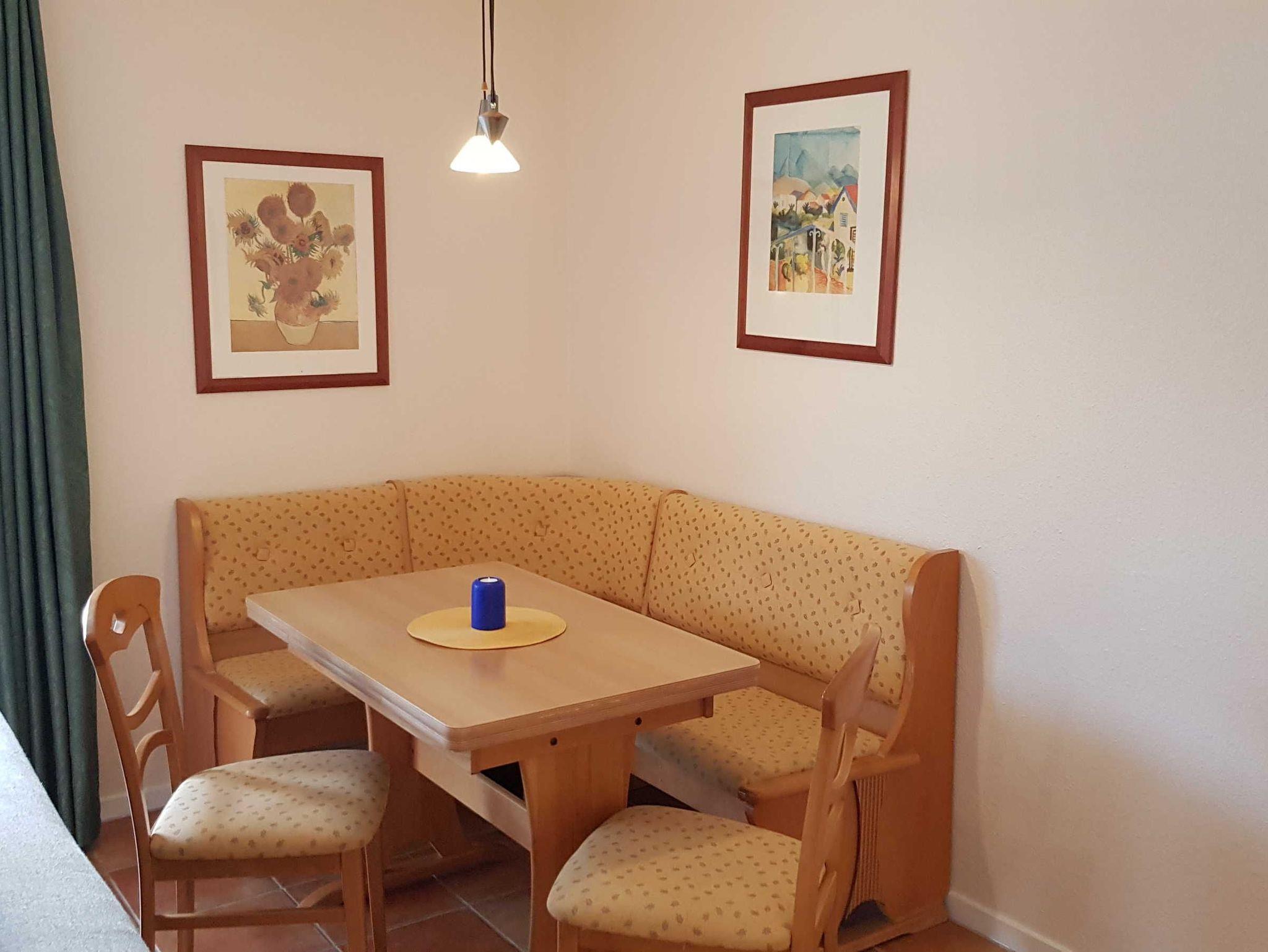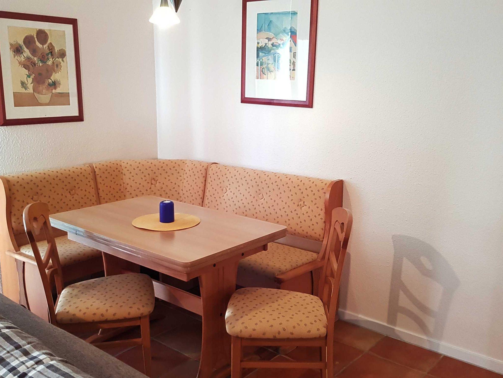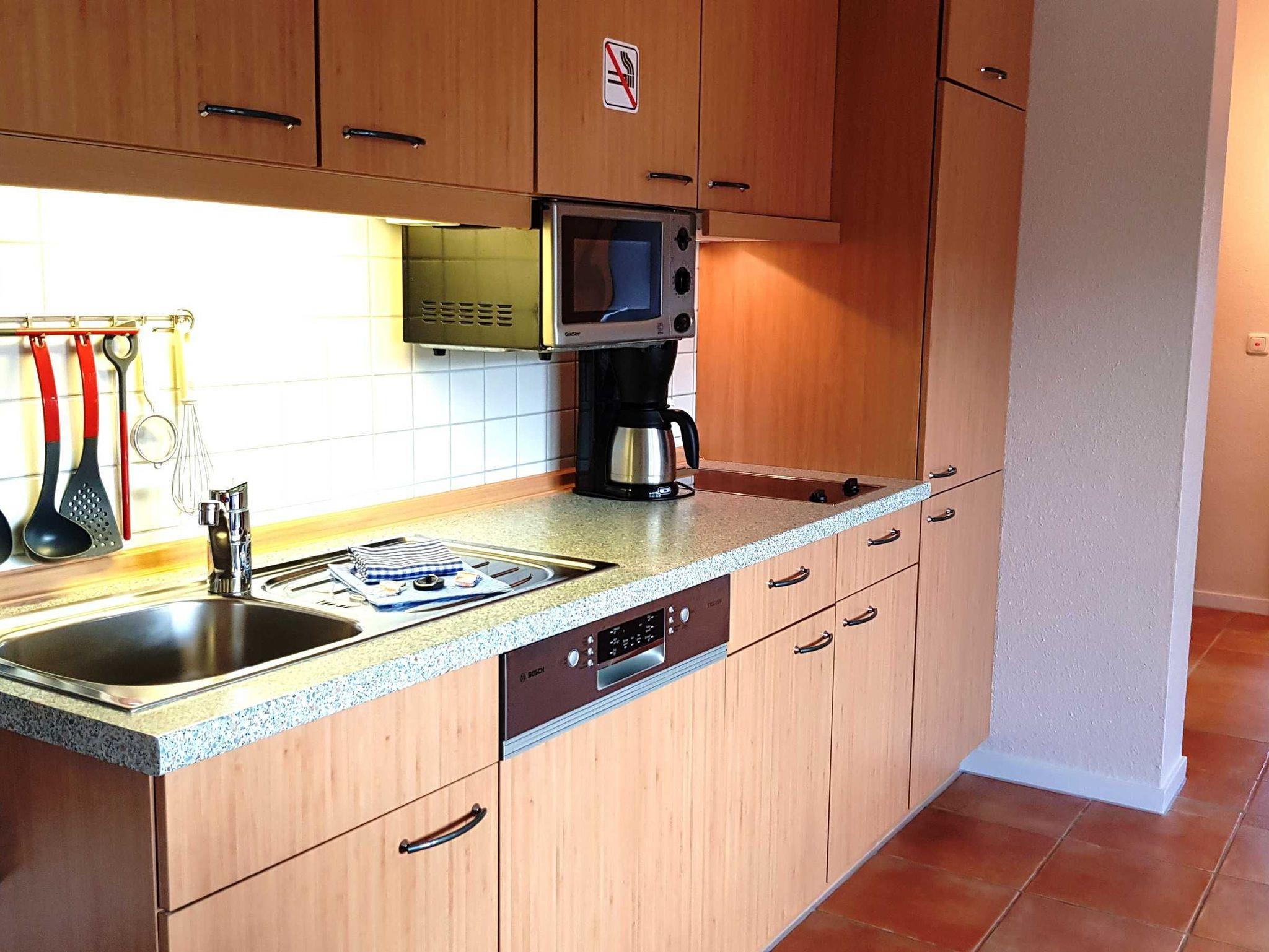 Das Wohnzimmer hat eine integrierte Küchenzeile mit einem 2 Zonen-Ceranfeld, Mikrowelle, Kühlschrank mit Eisfach, Spülmaschine, Kaffeemaschine, Wasserkocher, Toaster und Essecke.