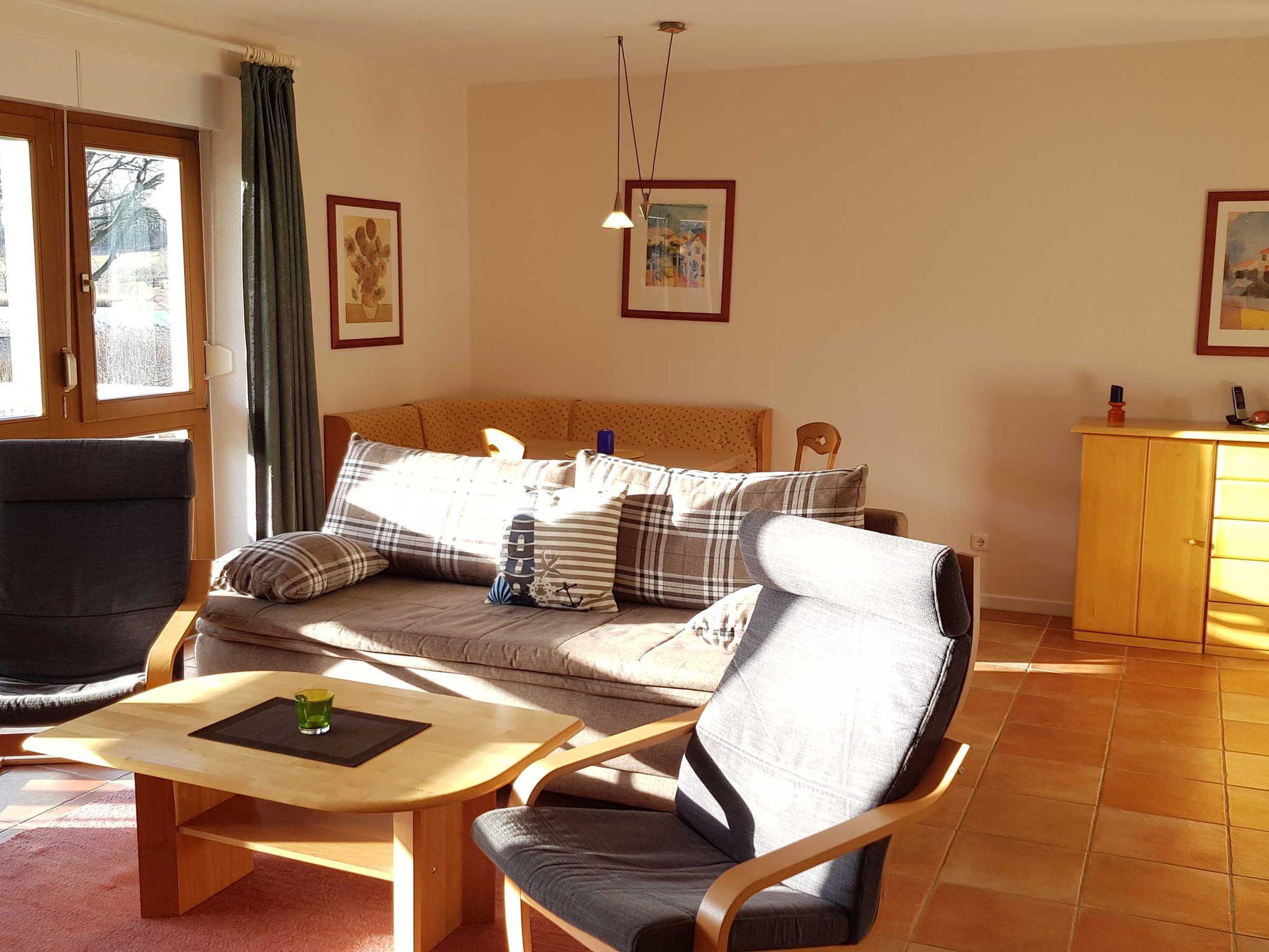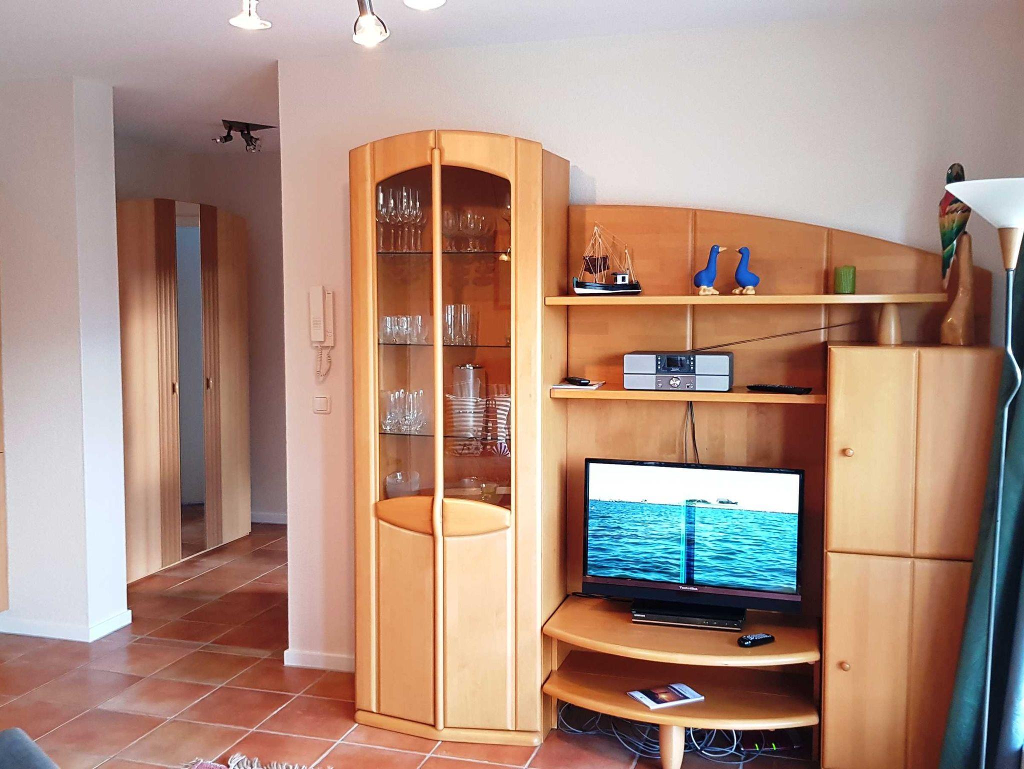 Im Wohnbereich befindet sich ein Schlafsofa mit einer Liegefläche von 1,65mx2,00m, ein Couchtisch, TV + DVD, Radio mit CD-Player.