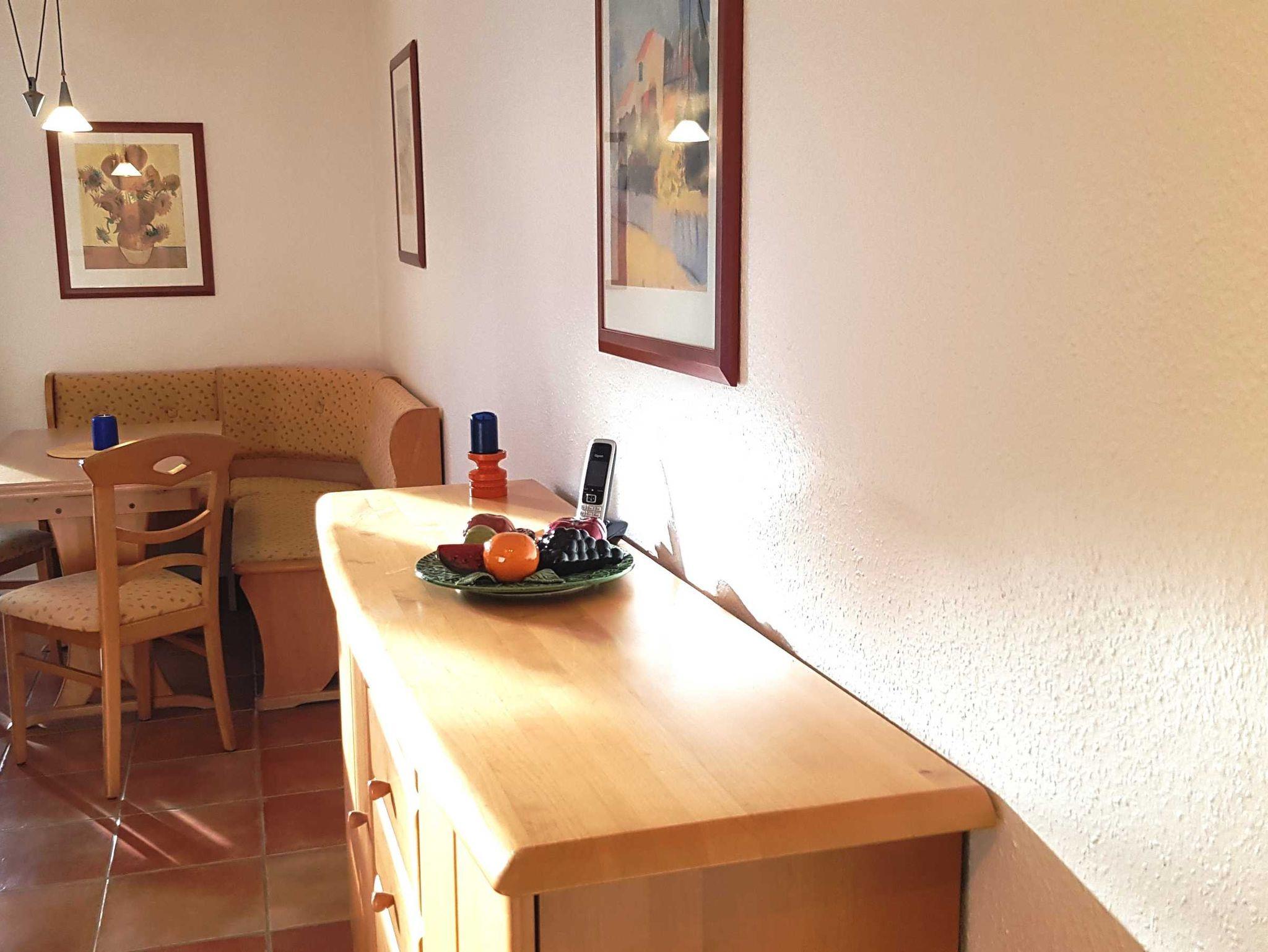 Die komfortabel ausgestattete Wohnung ist nach Süden ausgerichtet, befindet sich in der 2. Etage und ist mit einem Terrakottaboden versehen. Auf dem überdachten Südbalkon kann man bereits das Frühstück in der Morgensonne genießen.