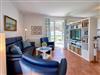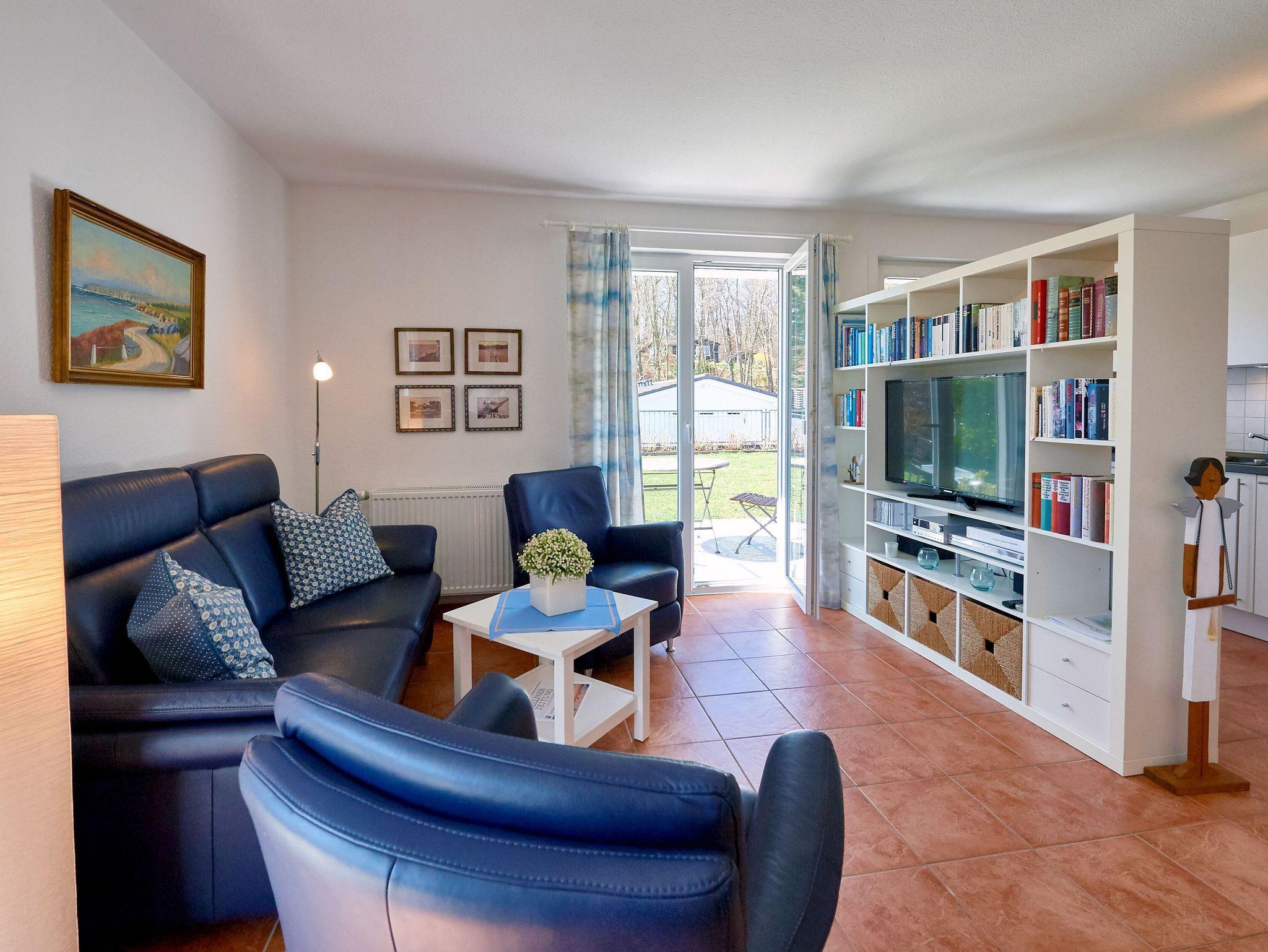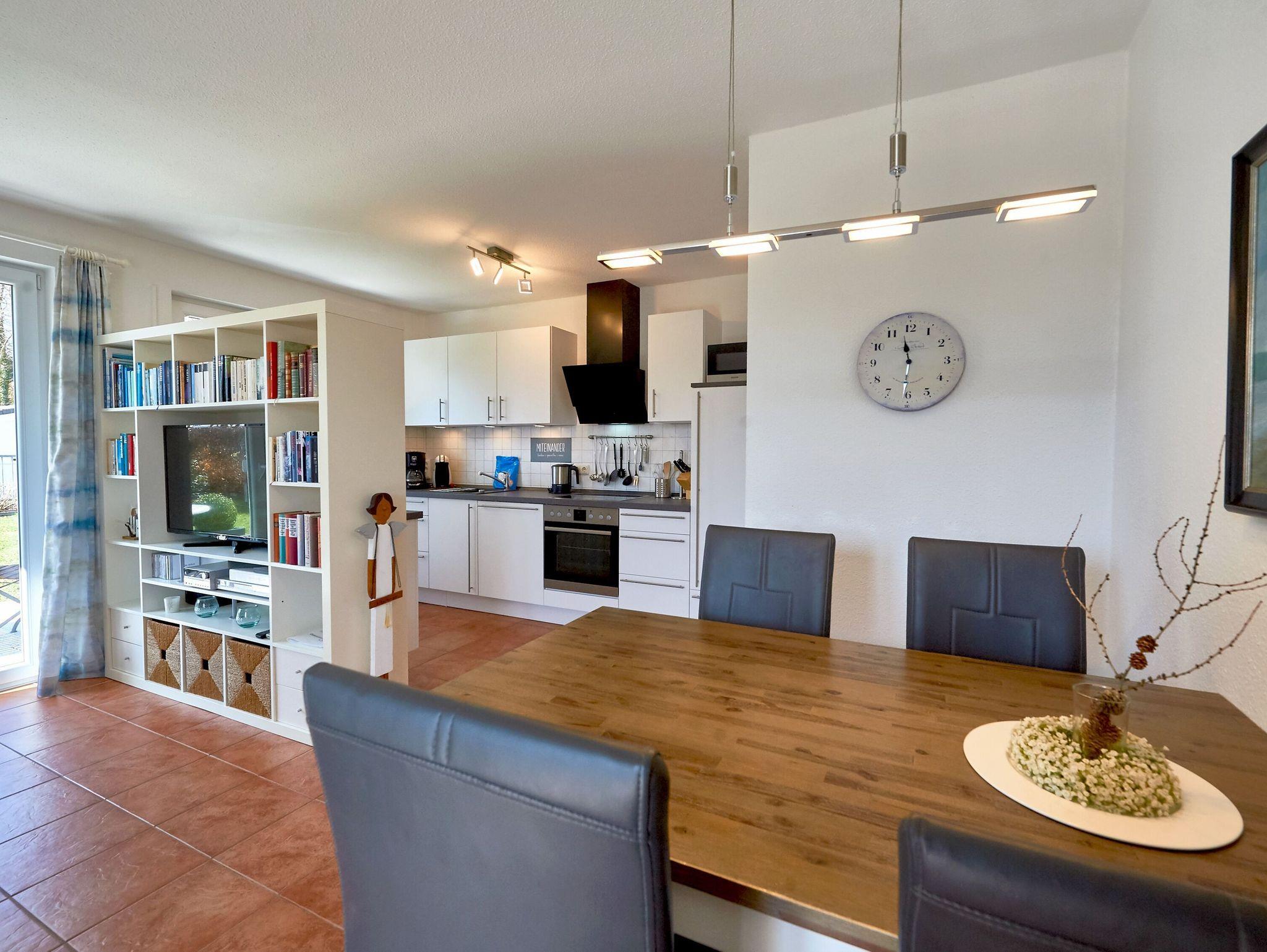 Der Wohnraum ist aufgeteilt in eine gemütliche Sitzecke aus Leder mit einem bequemen Sofa, zwei Sesseln und Couchtisch und einen Essbereich mit einem Esstisch für vier Personen sowie einer Küchenzeile. Hier befinden sich ein Kühlschrank mit Gefrierfach, Geschirrspüler, 4-Platten-Cerankochfeld, Backofen, Mikrowelle und diverse Kleingeräte, die die Ausstattung vervollständigen.